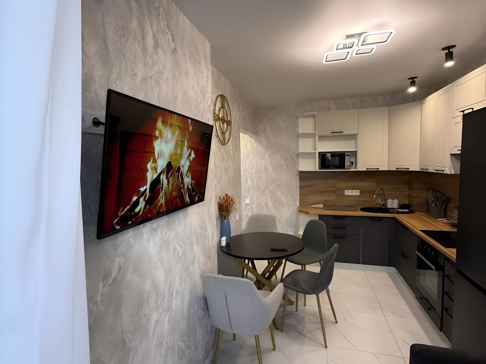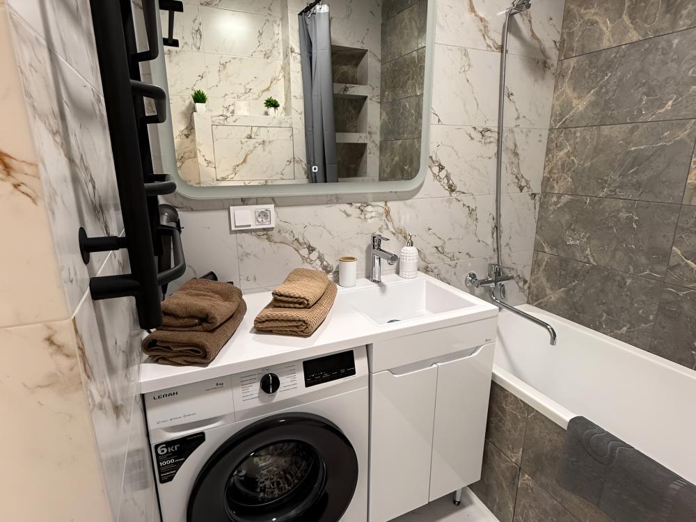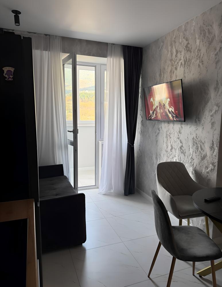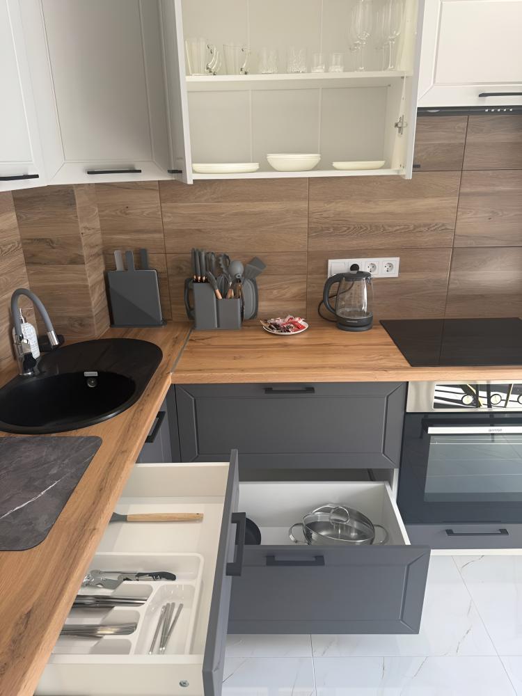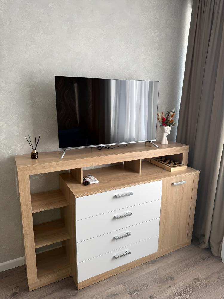 Два раскладных дивана. Полностью оборудованная кухня с техникой: холодильник, плита, микроволновая печь, чайник, посуда, обеденная зона. Телевизор, кондиционер, скоростной беспроводной интернет. Ванная комната с душем, стиральная машина, гигиенические принадлежности. Предоставляется постельное белье и полотенца.