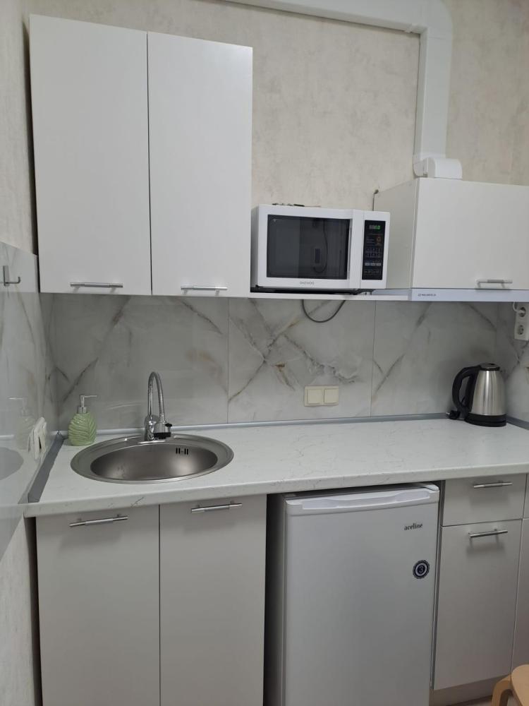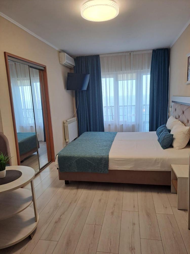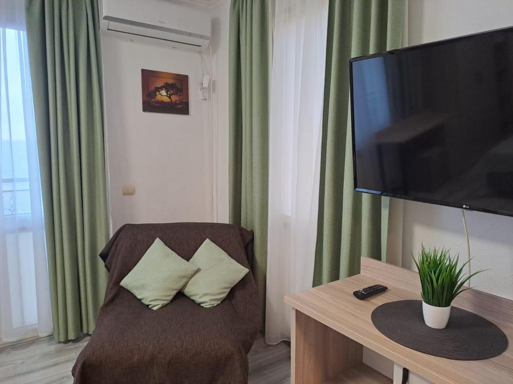 Апартаменты-студия с выходом на террасу и видом на море, в которых могут проживать до 3-х гостей. В распоряжении гостей 1 комната двуспальной кроватью и кресло-кроватью, ванная комната с душем, туалет. К услугам гостей: фен, одноразовые средства личной гигиены, полотенца, постельные принадлежности, журнальный столик, широкоформатный телевизор с кабельными каналами, кондиционер, шкаф. В апартаментах есть мини-кухня: эл. чайник, табуретки, микроволновая печь, холодильник, кухонные принадлежности. Есть выход с апартаментов на террасу с видом на море. Апартаменты находятся рядом с Массандровским пляжем. В пешей доступности кафе и рестораны, супермаркет, продуктовые магазины, овощные лавки.