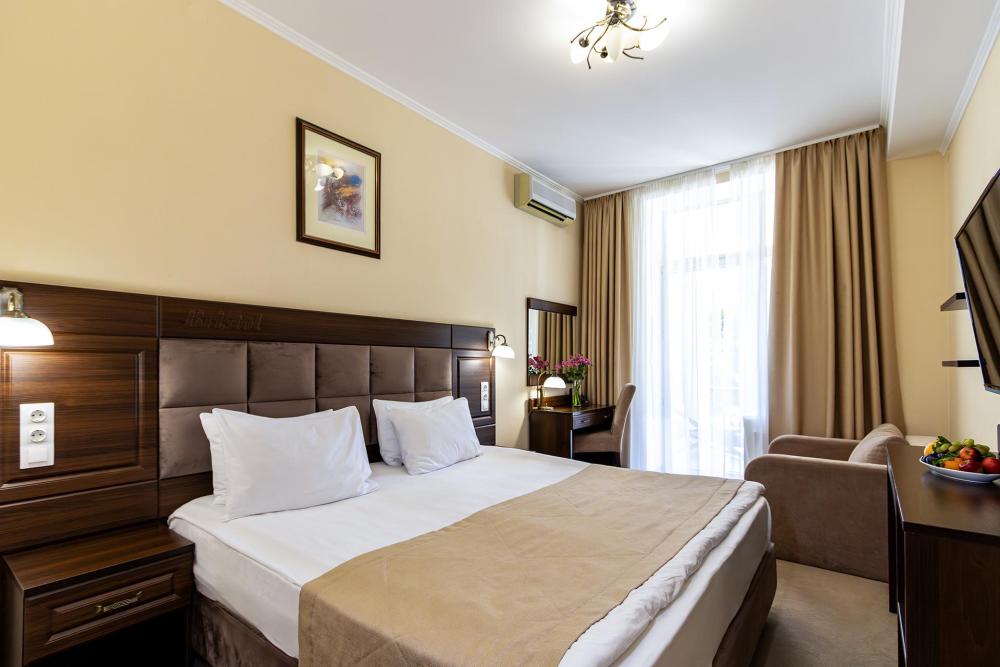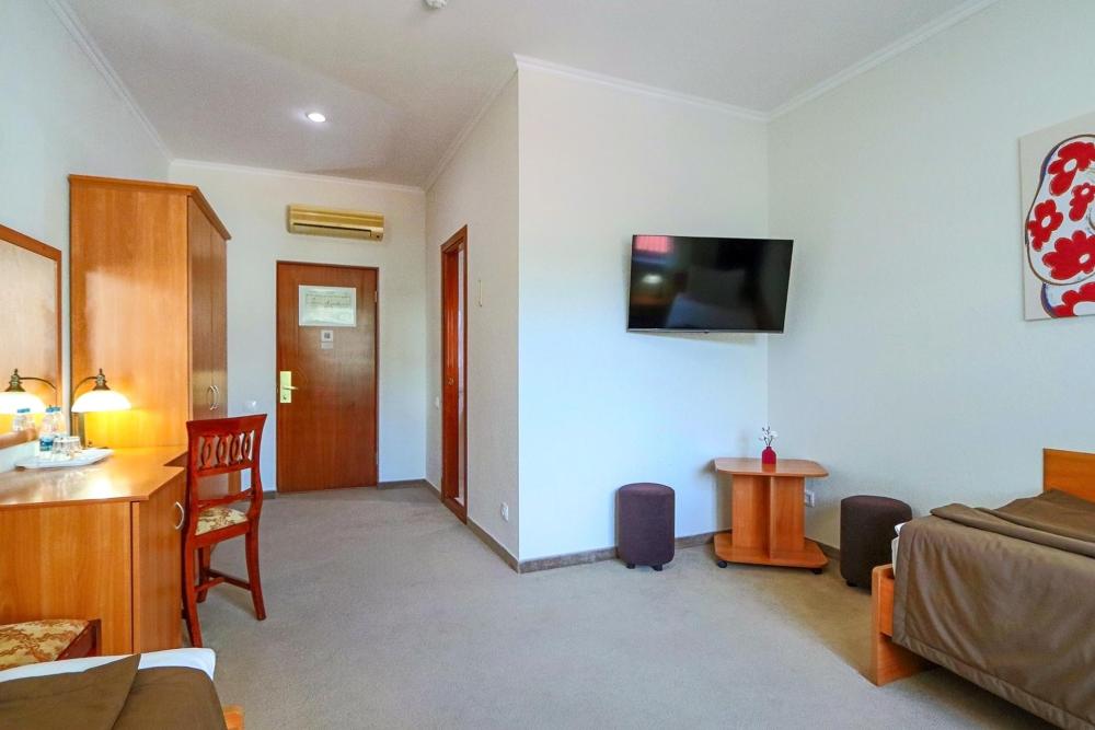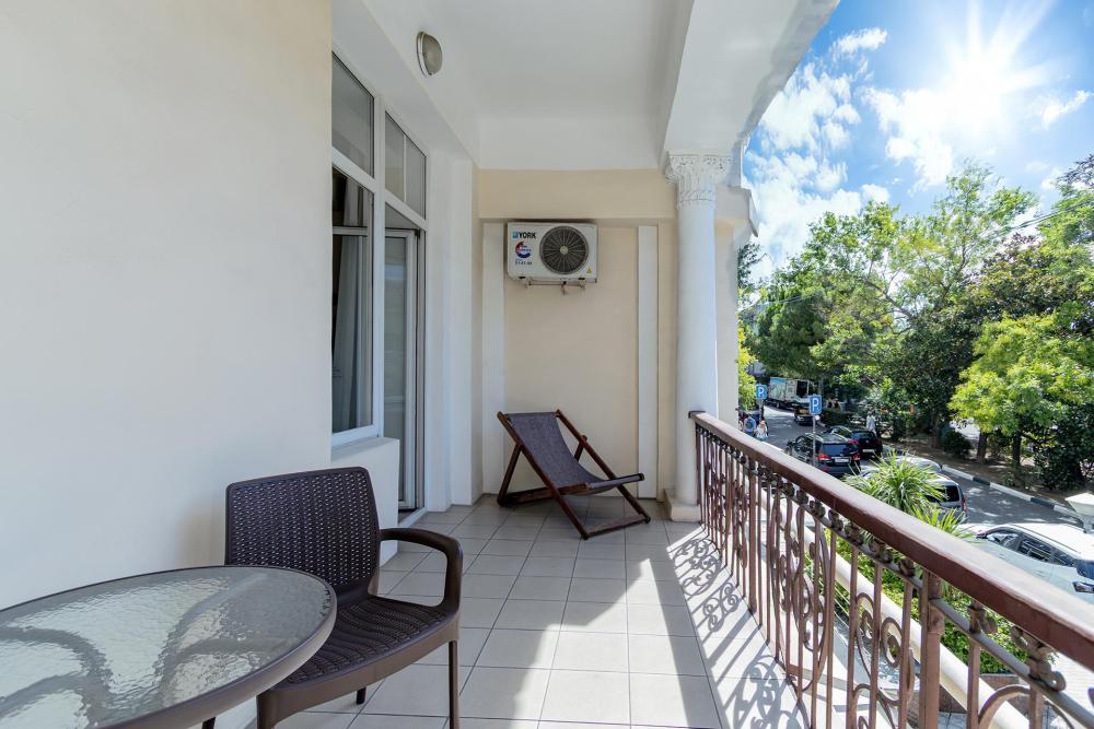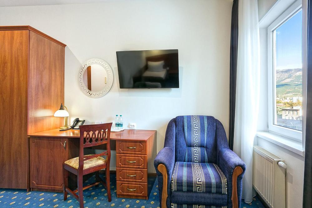 Просторный однокомнатный номер 1 категории. В номере 2 односпальные кровати или 1 двуспальная кровать, санузел с ванной. Led TV, мини-холодильник, кондиционер, сейф, фен, телефон, чайная станция, халат и тапочки. Для большего комфорта номер дополняют кресло или диван. Номера с балконом на 7-м этаже современного корпуса, откуда открывается живописный вид на море и горы