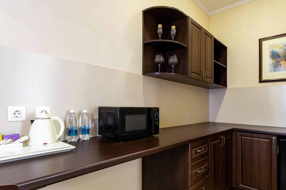 Просторный однокомнатный номер 1 категории с балконом и мини-кухней. В номере двуспальная кровать и санузел с ванной. Led TV, мини-холодильник, чайная станция, кондиционер, сейф, фен, телефон, микроволновая печь, тапочки и халаты. Для большего комфорта номер дополняет кресло. Вид во внутренний двор.