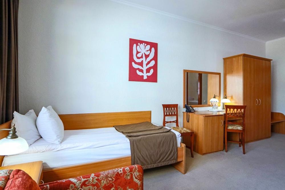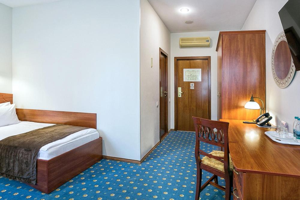 Просторный однокомнатный номер 1 категории с балконом. В номере две односпальные кровати (можно объединить в двуспальную) и санузел с душем. Led TV, мини-холодильник, кондиционер, сейф, фен, телефон, чайная станция, халат и тапочки. Для большего комфорта номер дополняет кресло. Номера расположены в историческом корпусе.