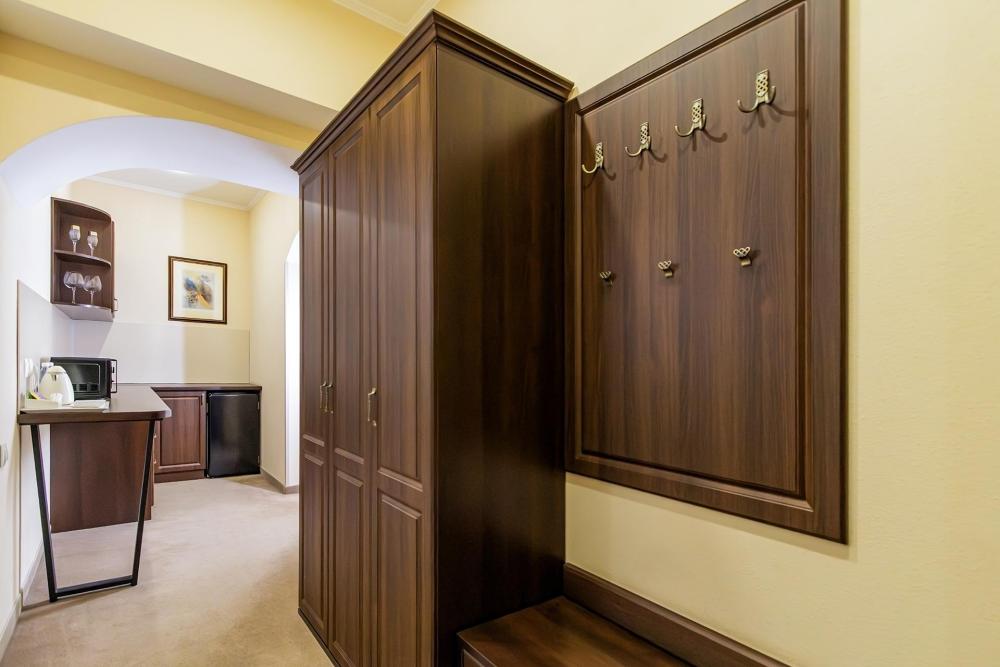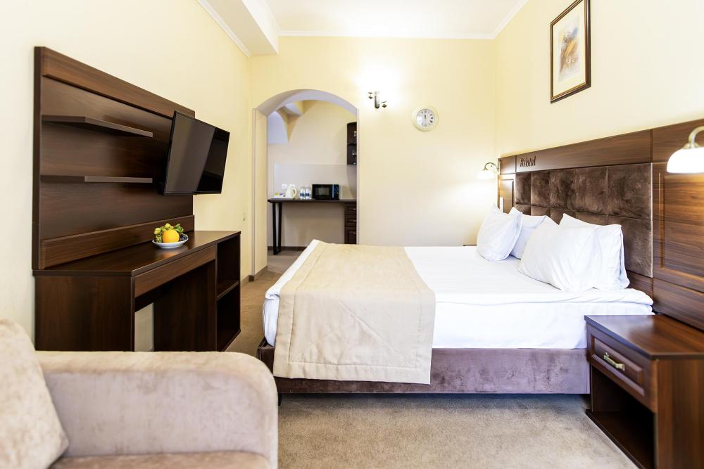 Двухкомнатный номер 1 категории. В одной комнате двуспальная кровать, в другой - диван и мини-кухня, санузел с ванной. 2 Led TV, мини-холодильник, микроволновая печь, кондиционер, сейф, фен, телефон, чайная станция, тапочки и халат. Номера со стандартным либо французским балконом.