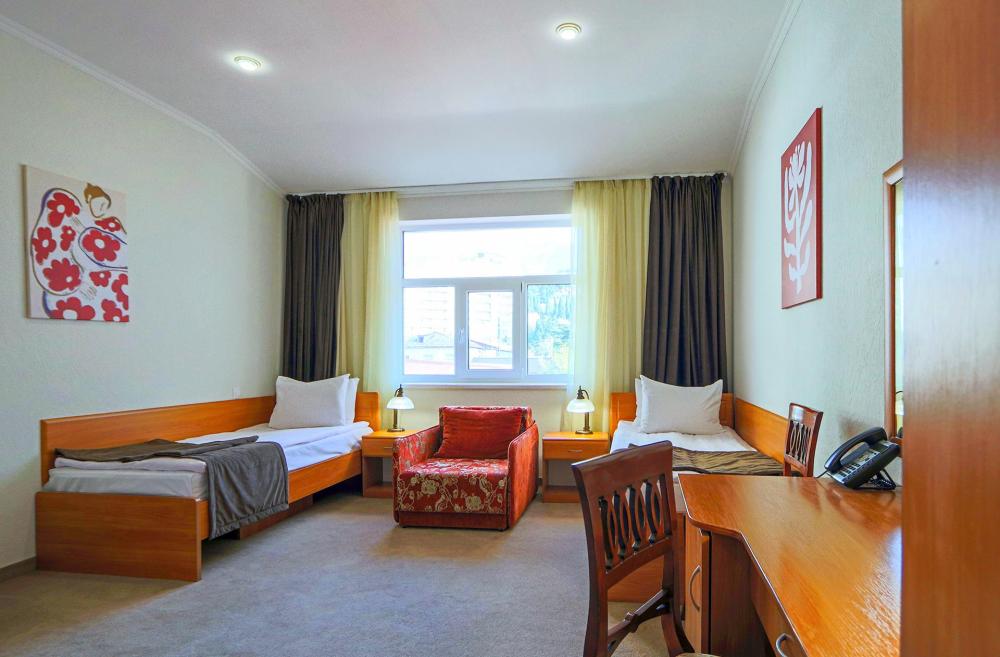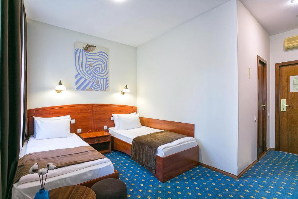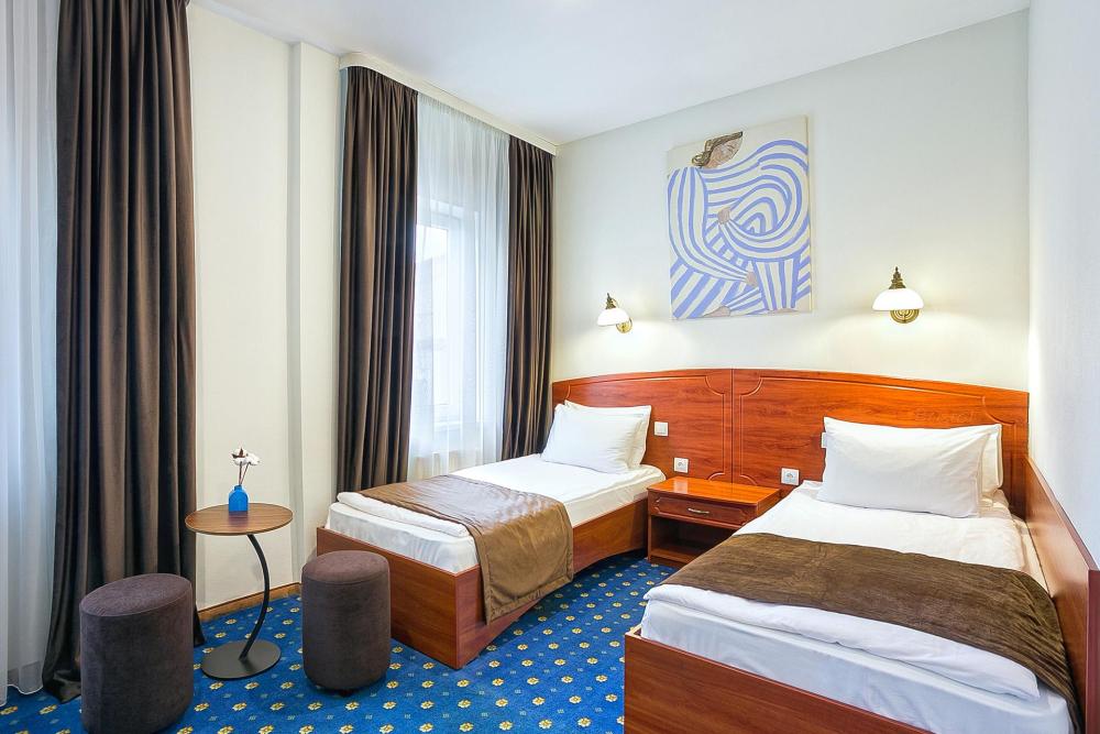Однокомнатный номер 1 категории. В номере две односпальные кровати, санузел с душем или ванной. Led TV, мини-холодильник, кондиционер, сейф, журнальный и письменный столы, пуфы, фен, телефон, халаты (предоставляются за дополнительную стоимость). Номера без балкона. Вид на северную сторону.