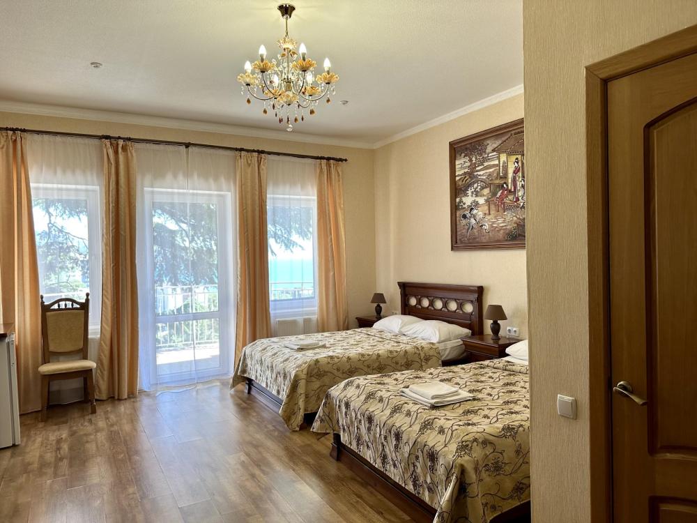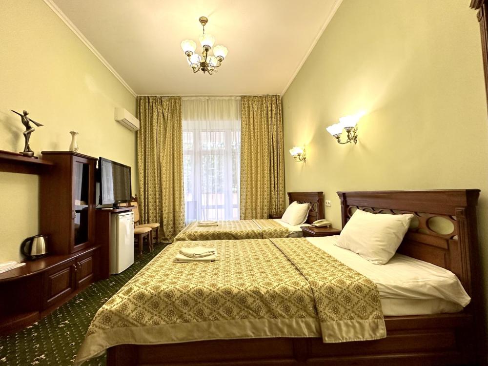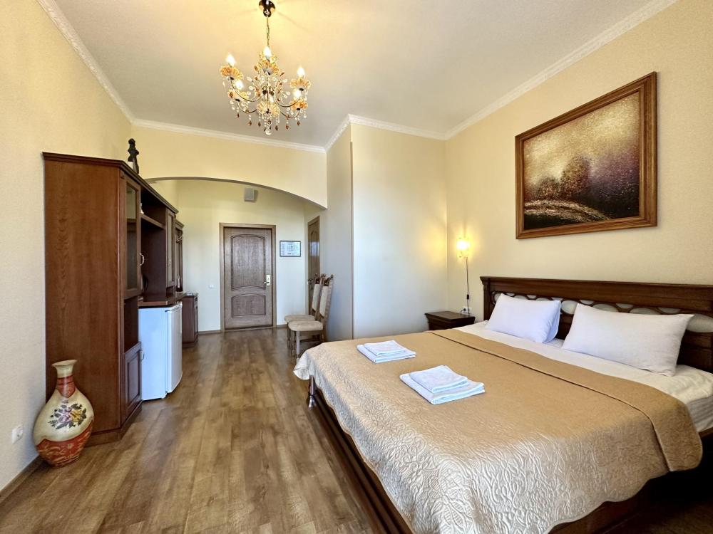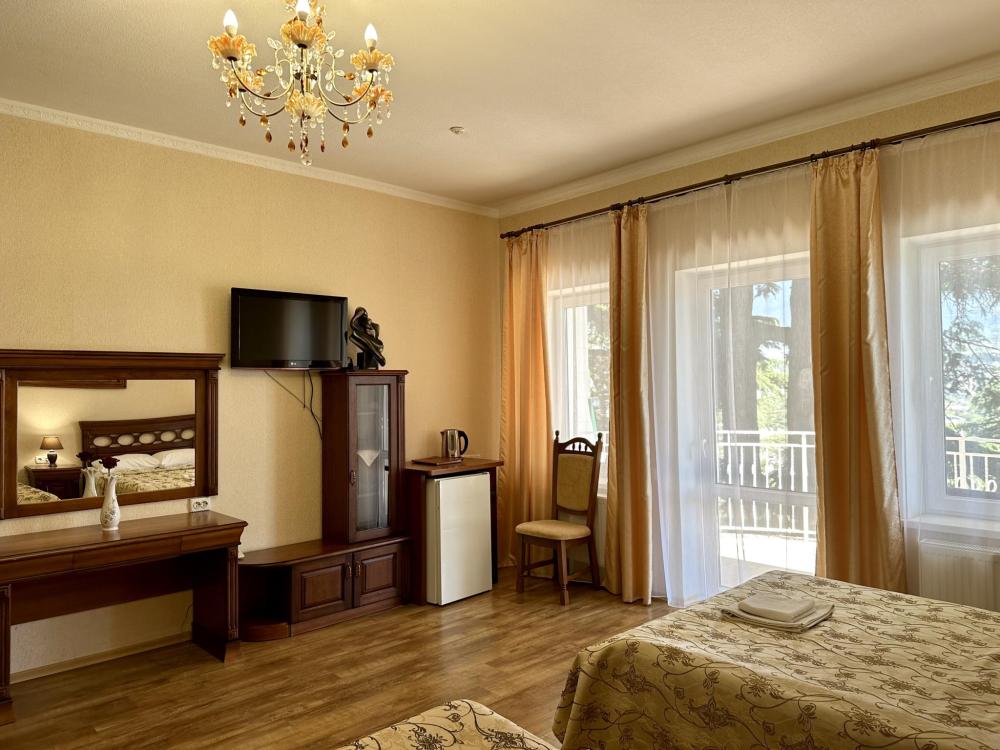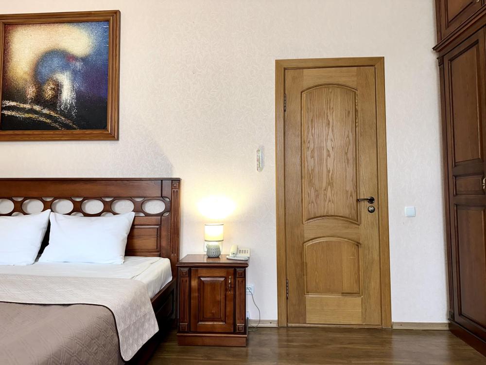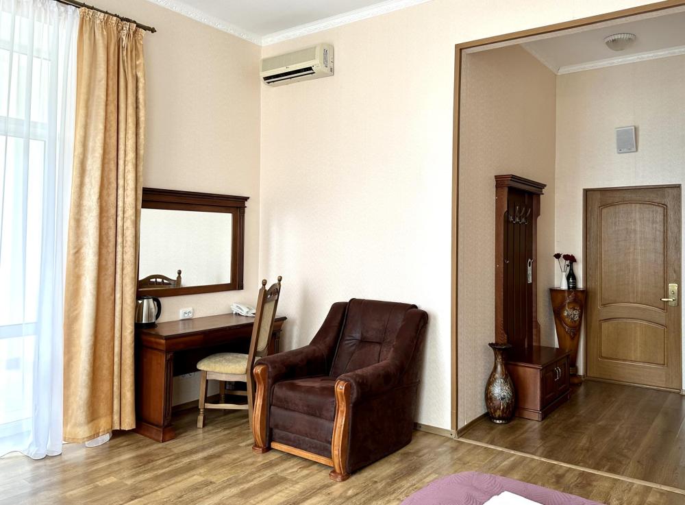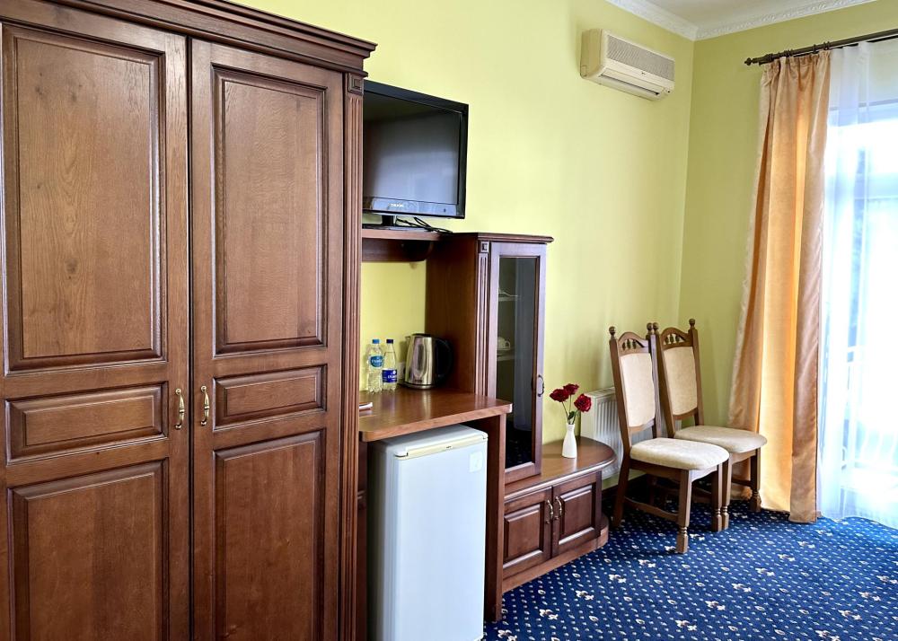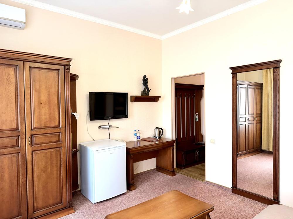 Номер в классическом стиле. В номере есть: wi-fi, дополнительное место — кровать, кресло-кровать или диван, телевизор с плоским экраном, кондиционер, халат, фен, тапочки, косметический набор для душа, холодильник, мини-бар, пляжные полотенца, чайник, чайный набор.