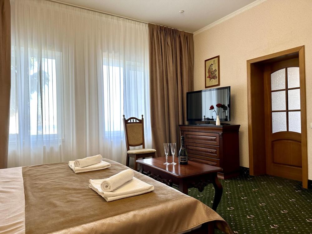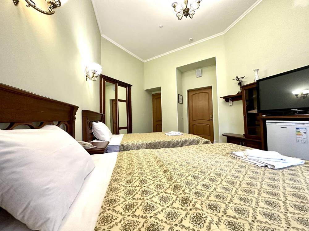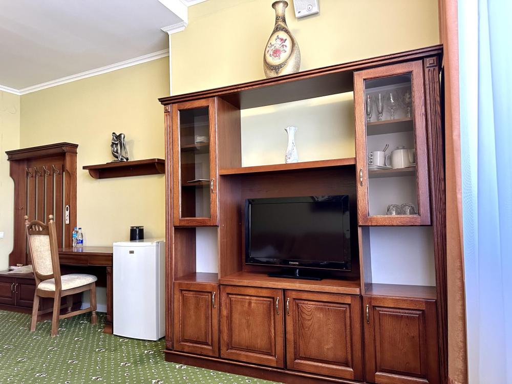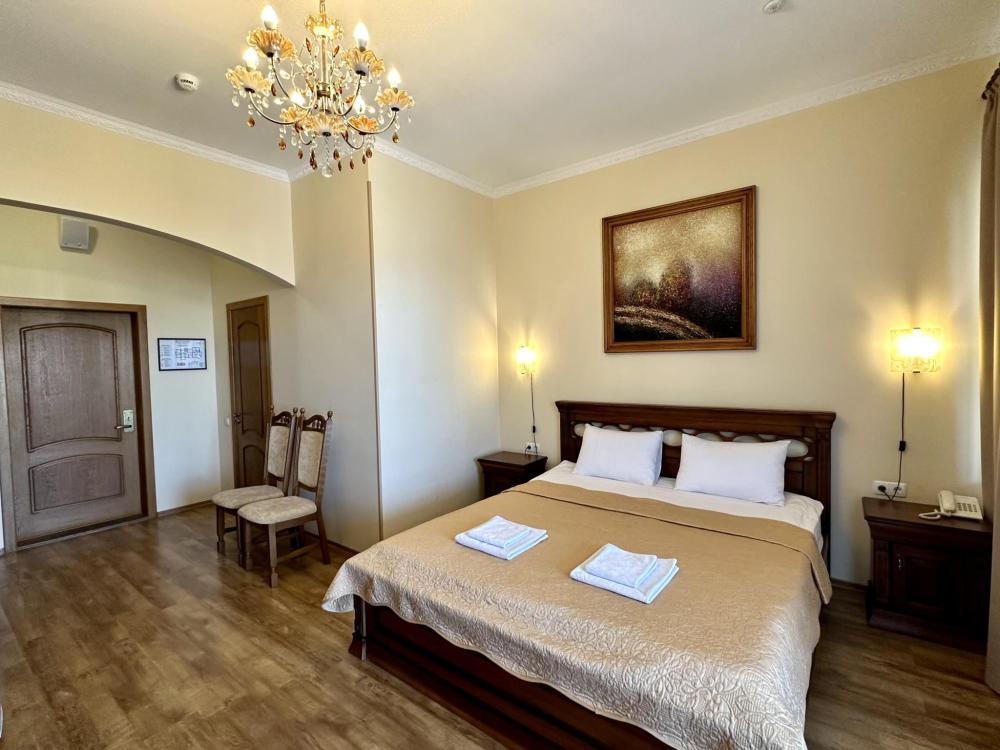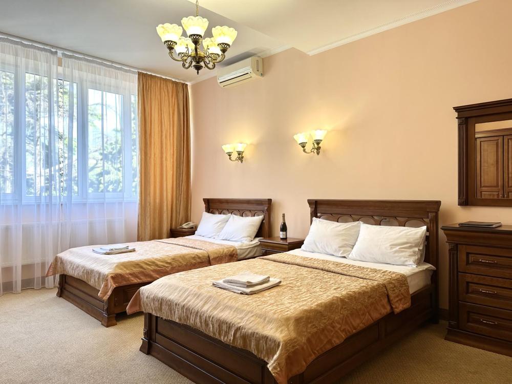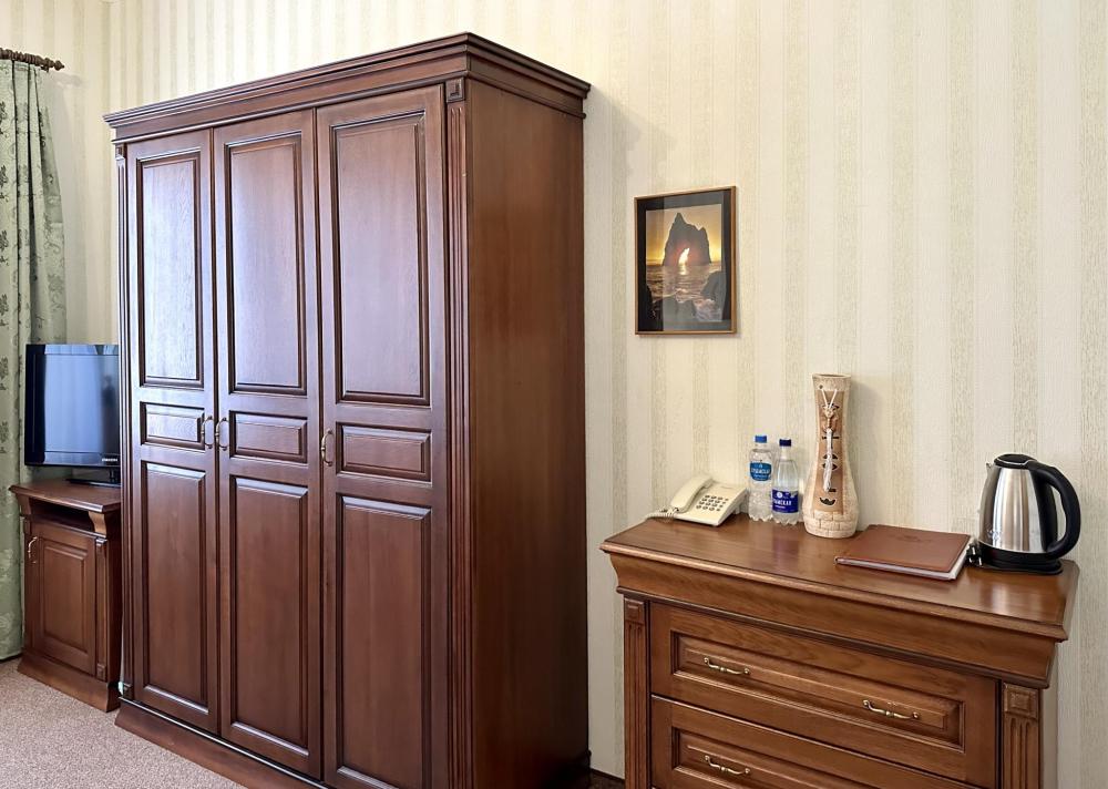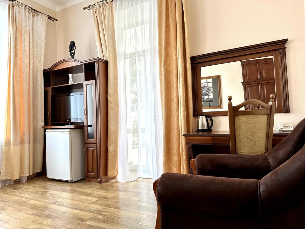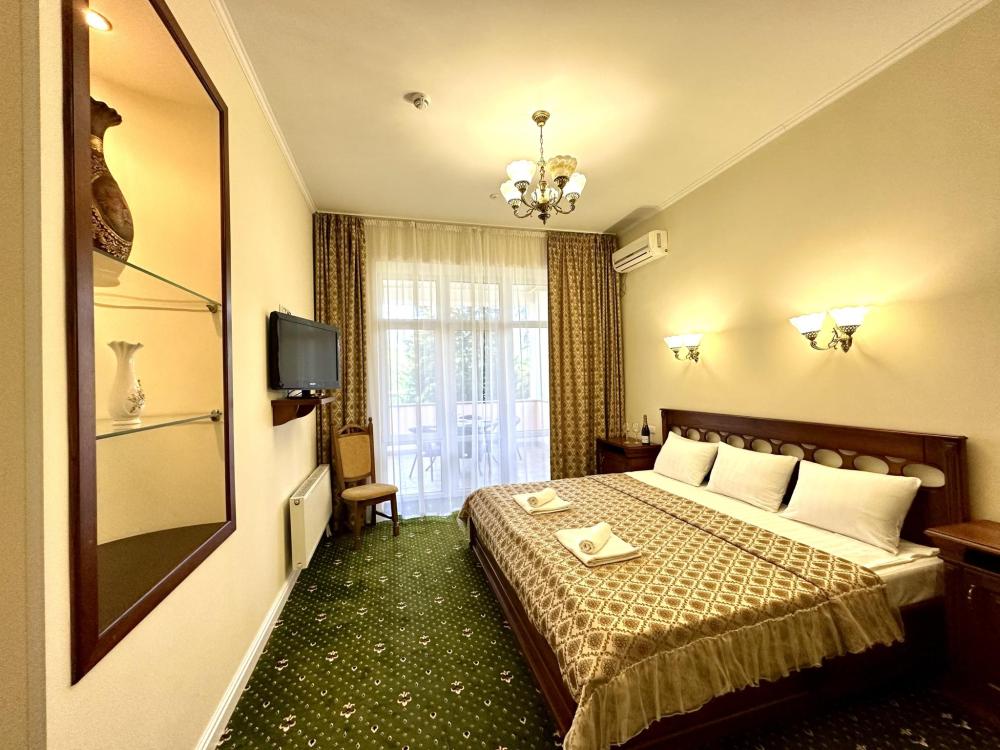 Номер в классическом стиле. В номере есть: wi-fi, дополнительное место — кровать, кресло-кровать или диван, телевизор с плоским экраном, кондиционер, халат, фен, тапочки, косметический набор для душа, холодильник, мини-бар, пляжные полотенца, чайник, чайный набор.