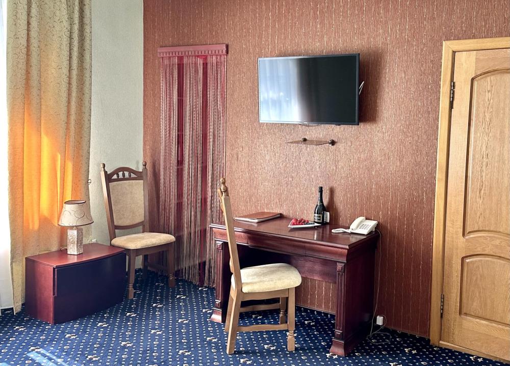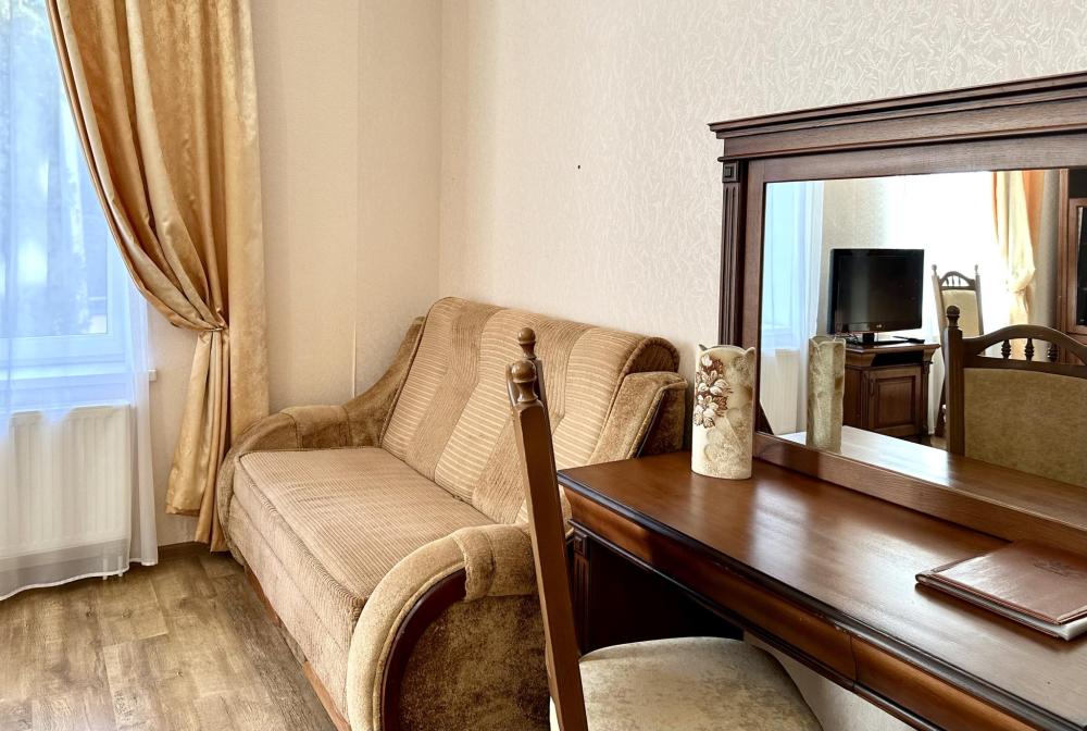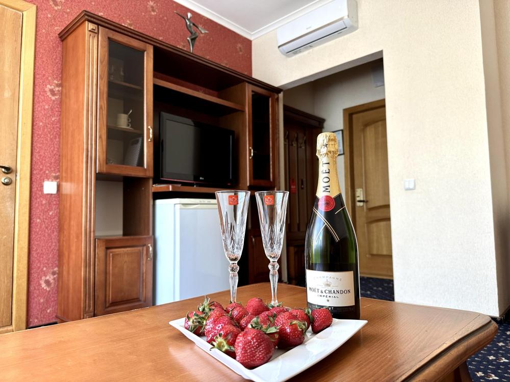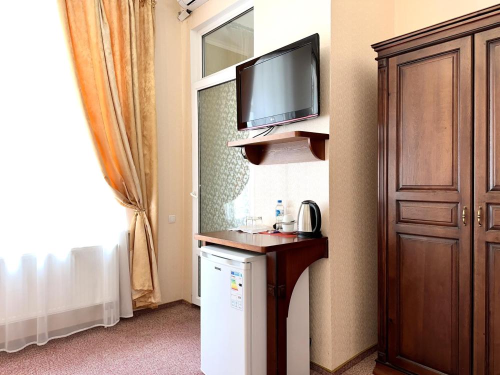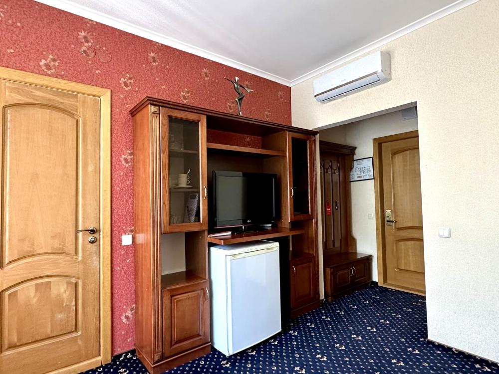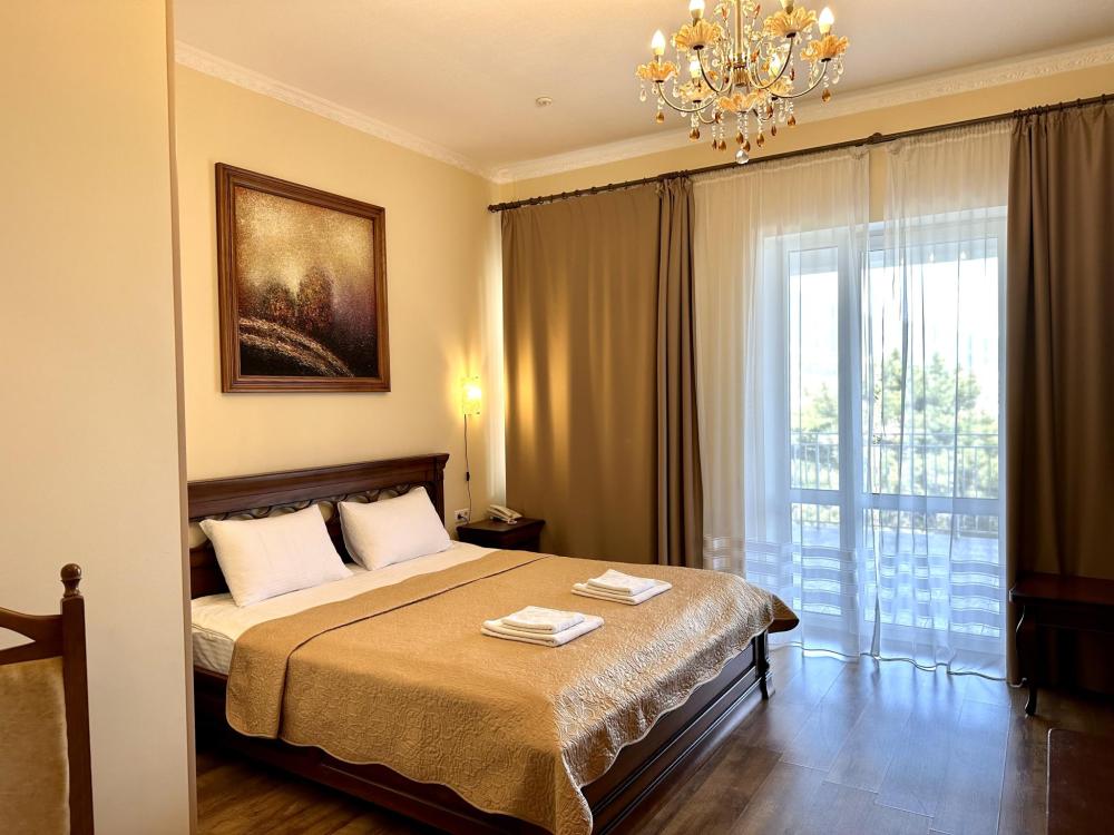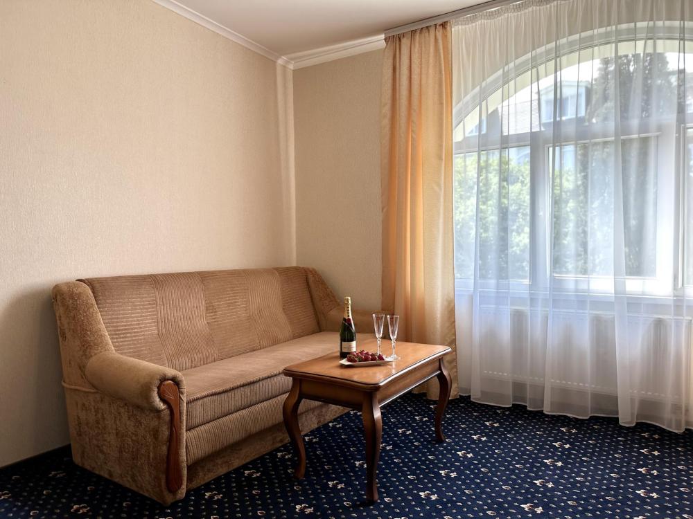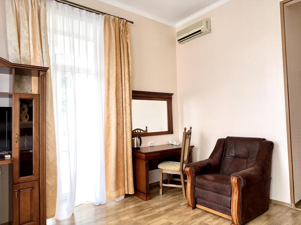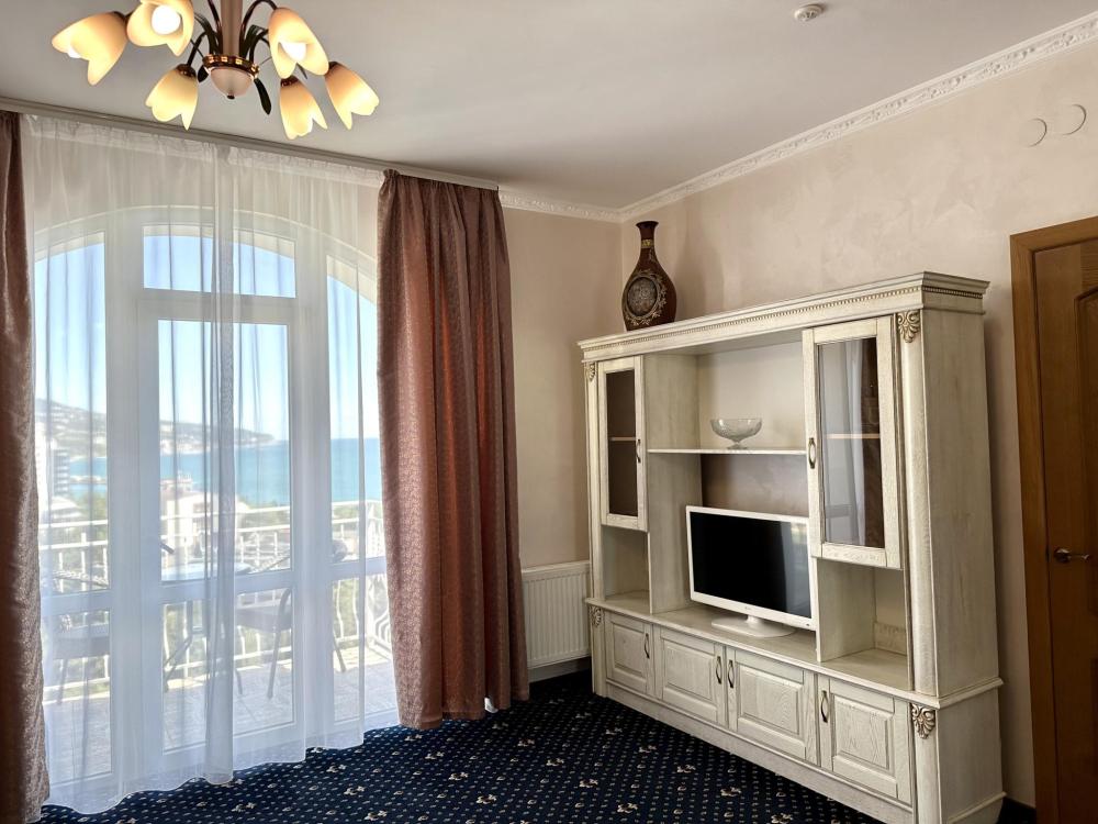 Номер в классическом стиле. В номере есть: wi-fi, дополнительное место — кровать, кресло-кровать или диван, телевизор с плоским экраном, кондиционер, халат, фен, тапочки, косметический набор для душа, холодильник, мини-бар, пляжные полотенца, чайник, чайный набор.
