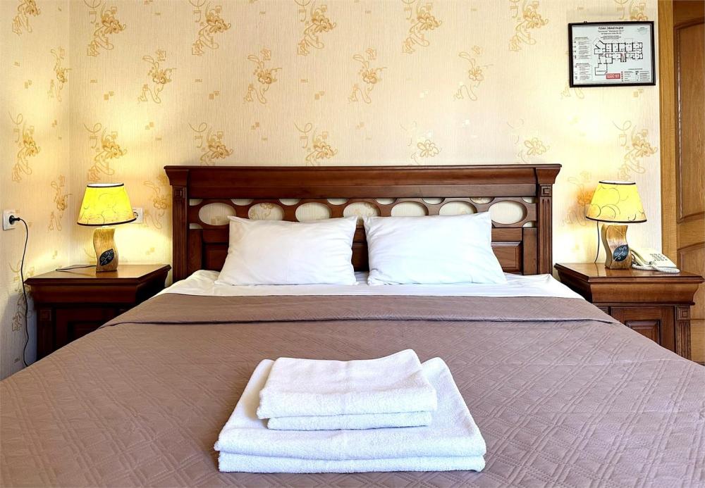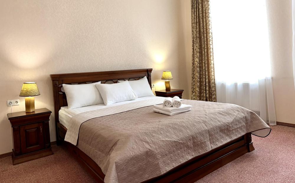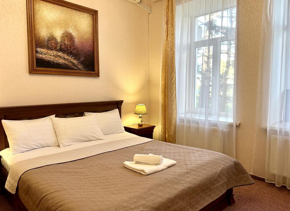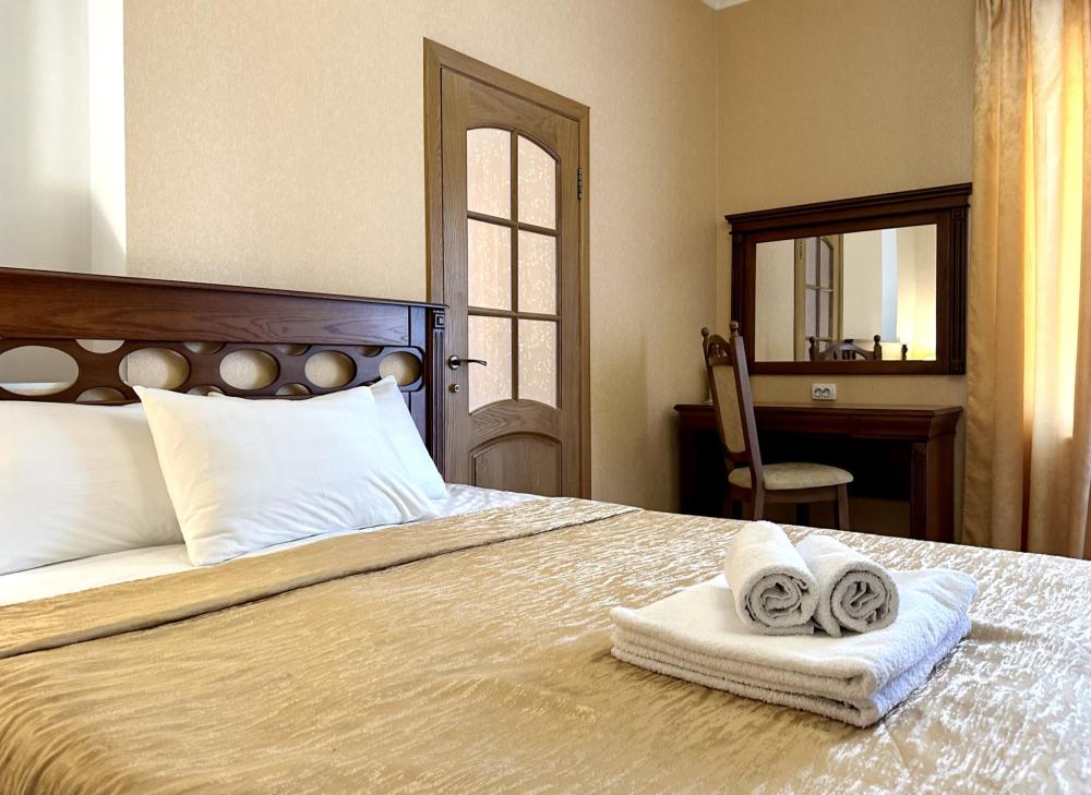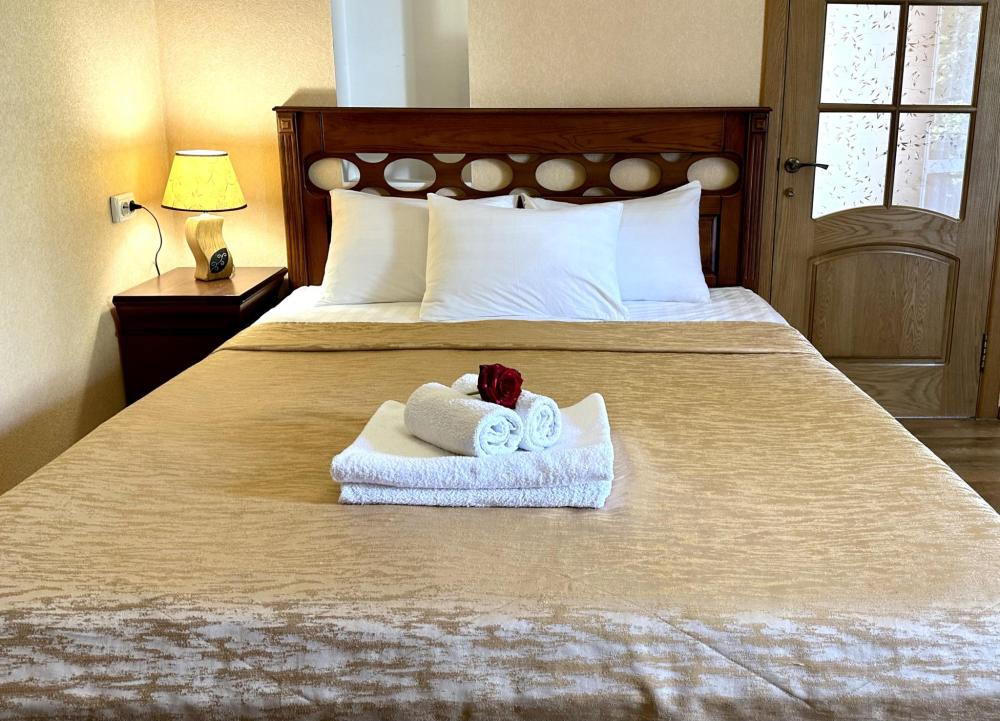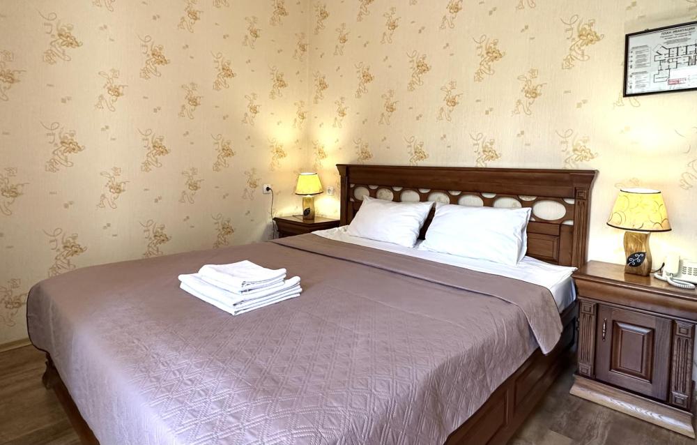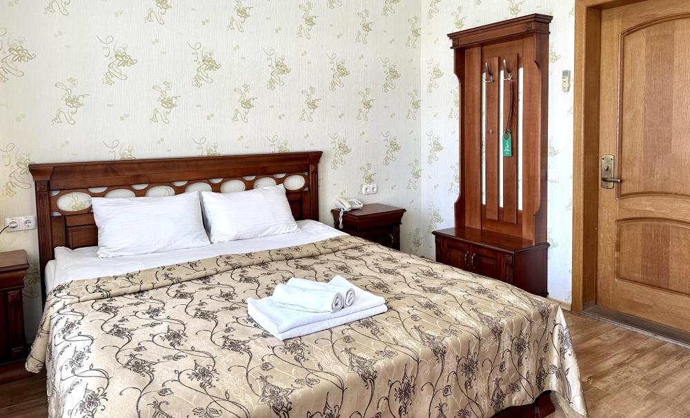 Однокомнатные номера с одной двуспальной кроватью. В номере комплект мебели, постельное белье, полотенца, санузел с душем.