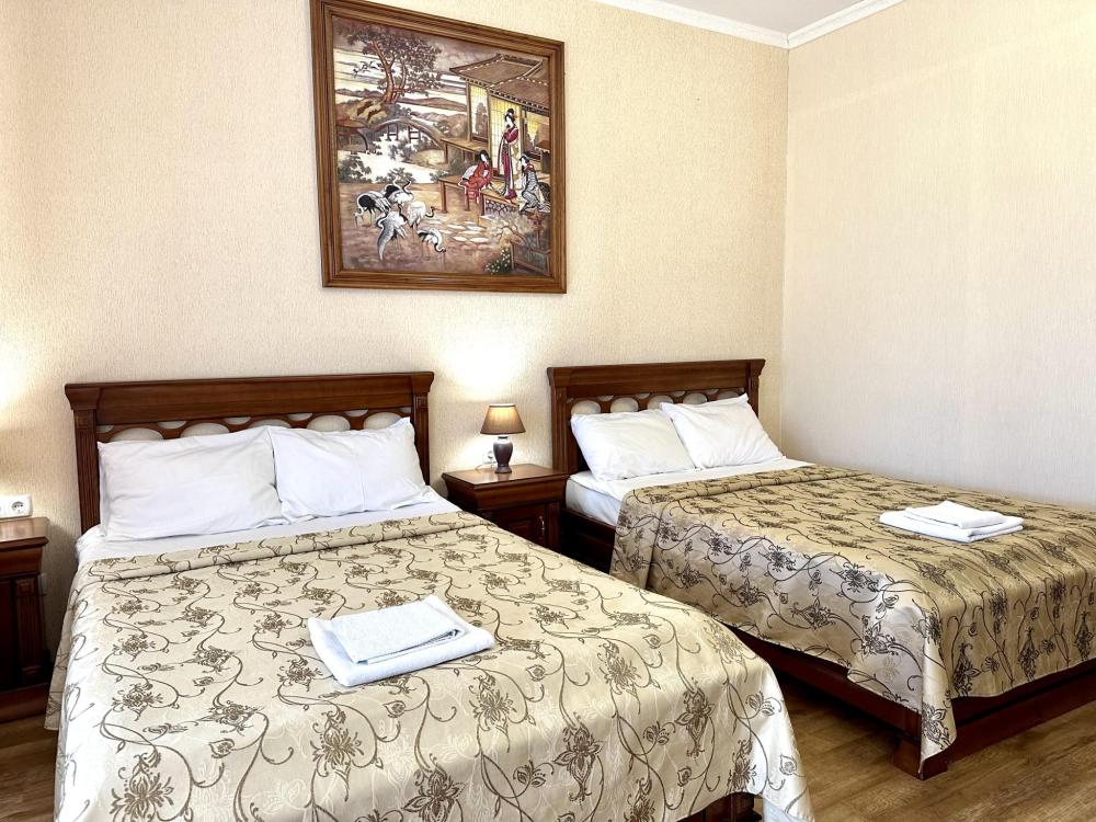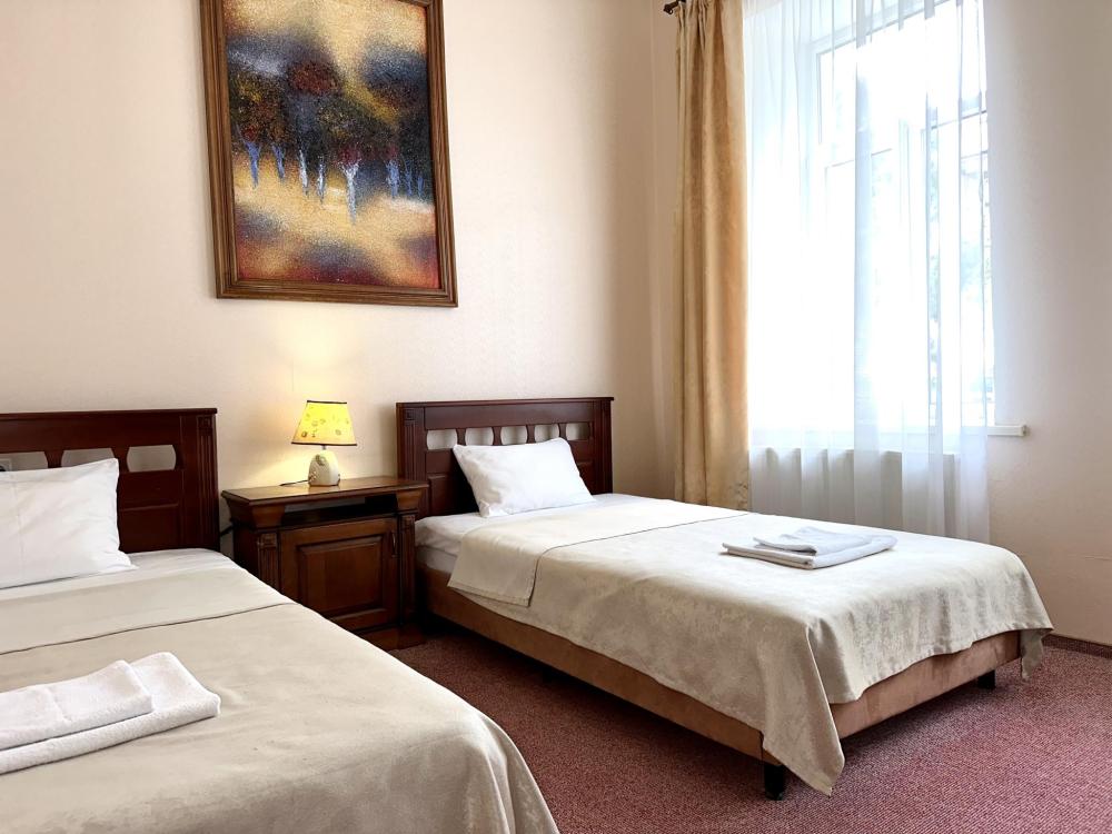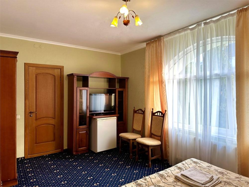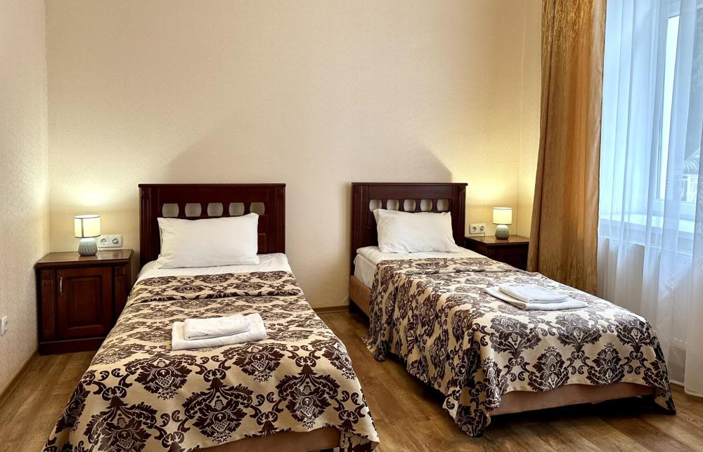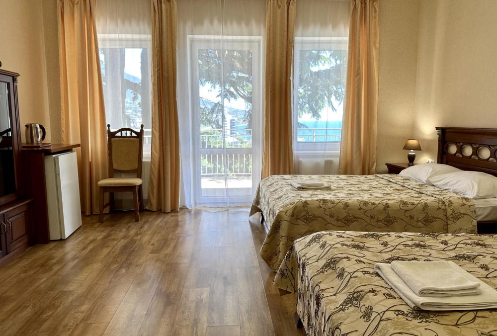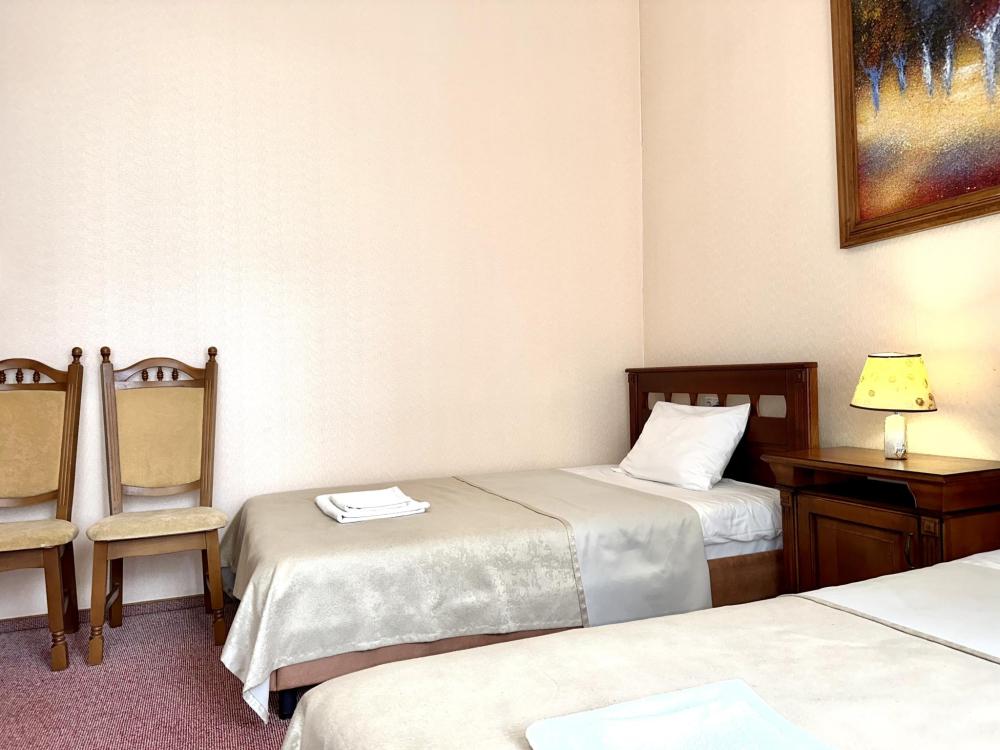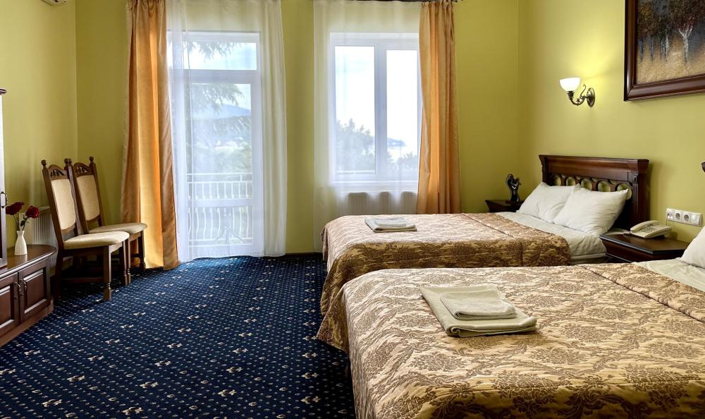 Однокомнатные номера с двумя полутораспальными кроватью и балконом. В номере комплект мебели, постельное белье, полотенца, санузел с душем.
