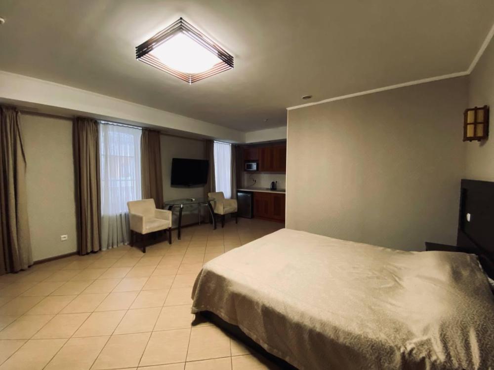 Роскошная студия для двоих, в классическом стиле, площадью 40 м2, большим балконом, видом на горы и парк им. Некрасова. В номере одна двуспальная кровать, санузел с душем. Led TV, мини-холодильник, кондиционер, сейф, фен, халаты (предоставляются за дополнительную стоимость).