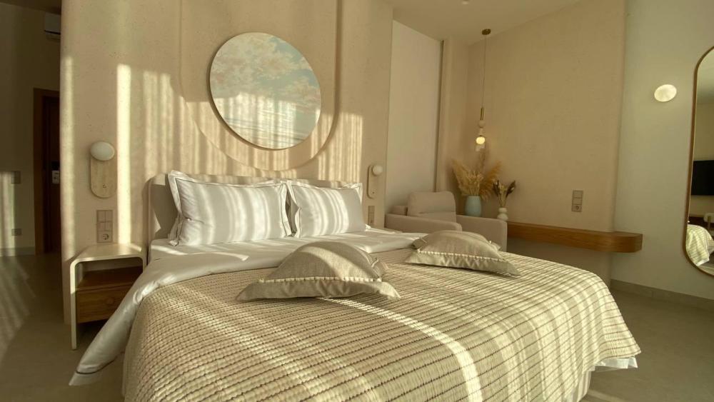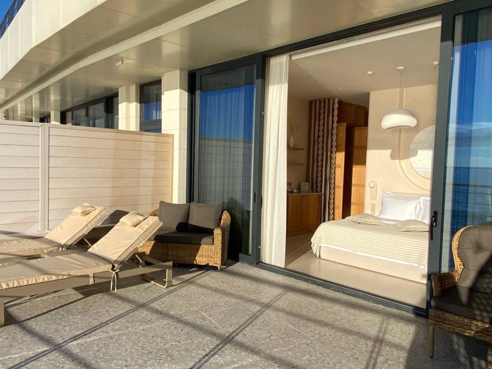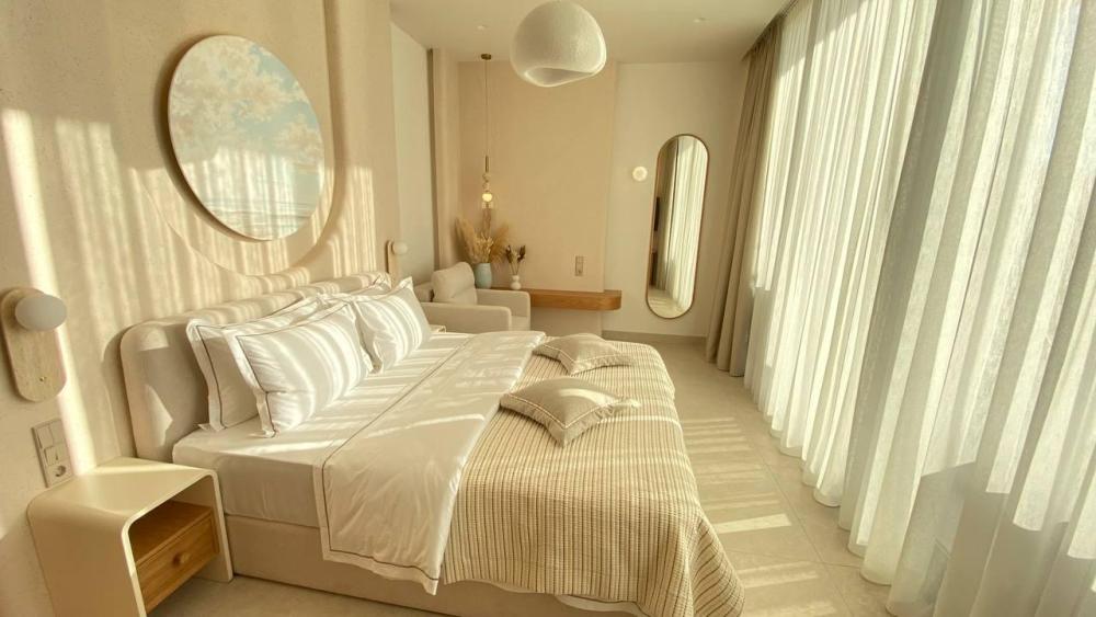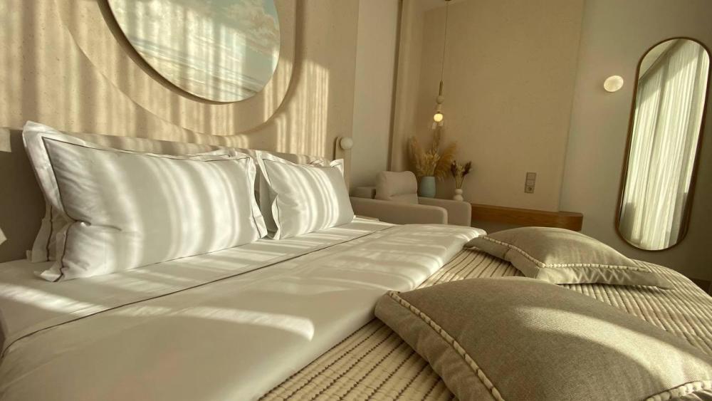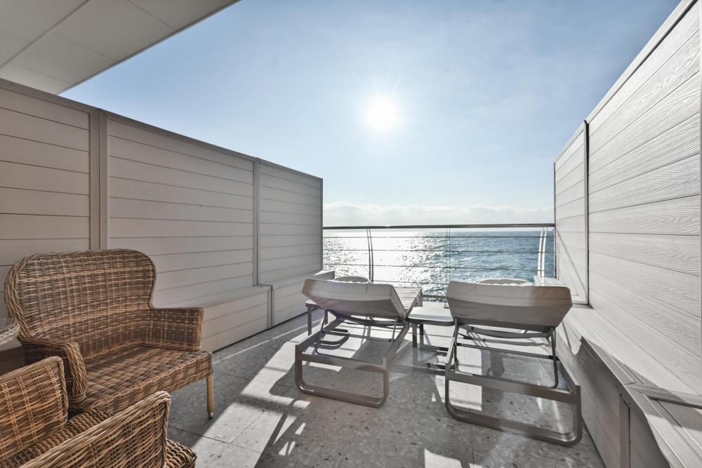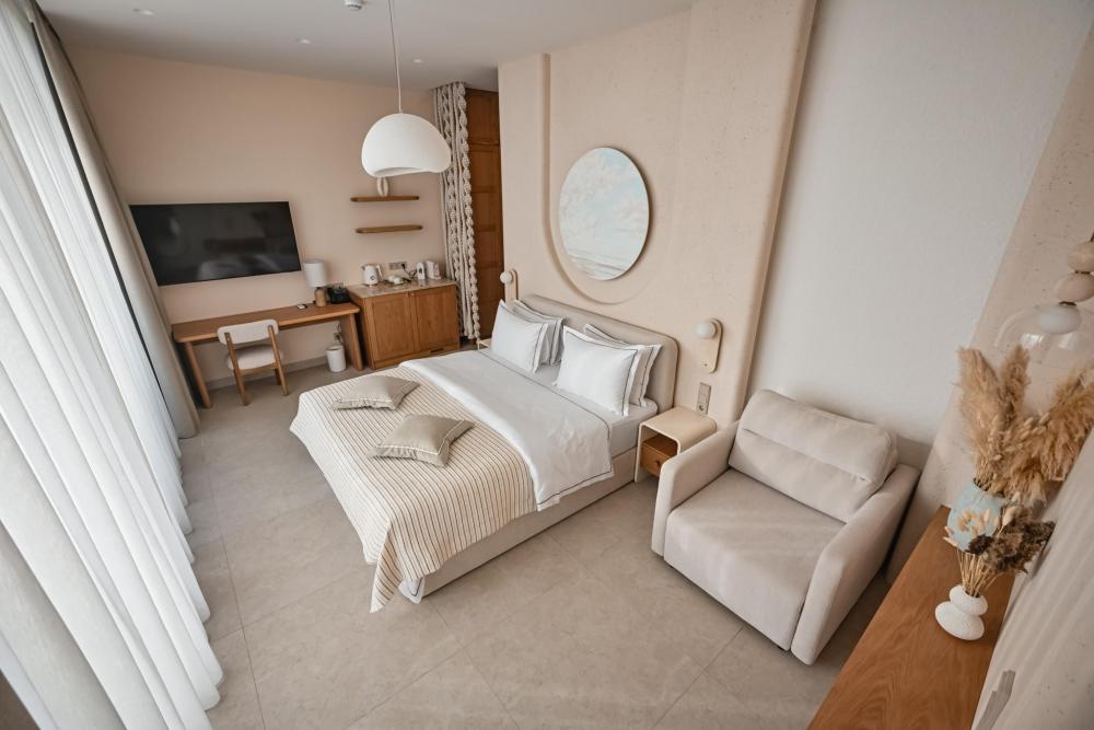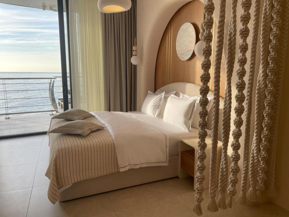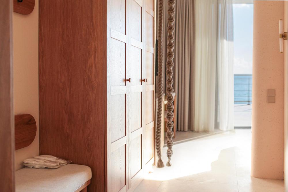 Для тех, кто хочет быть ближе к морю — буквально. Из собственной террасы открывается прямой выход к воде, а лёгкий морской бриз становится частью пространства. Здесь приятно начинать день прогулкой вдоль берега и ощущать, что море — почти твоё личное. Просторный номер площадью 21,3 м² рассчитан на двоих и оснащён всем необходимым: большая двуспальная кровать 180×200 см, телевизор, мини-бар, кофемашина, письменный стол, настольная лампа и отдельная гардеробная, добавляющая комфорта. Кондиционер и тёплый пол обеспечивают уют в любую погоду. На террасе — шезлонги, кресла, столик и пляжные полотенца, чтобы можно было отдыхать у воды, не покидая номер. В ванной — душ, зеркало с подсветкой, фен, весы, наборы для ухода и текстиль для каждого гостя. Ежедневная уборка поддерживает чистоту, полотенца меняются раз в два дня или по запросу, постельное бельё — каждые три дня.
