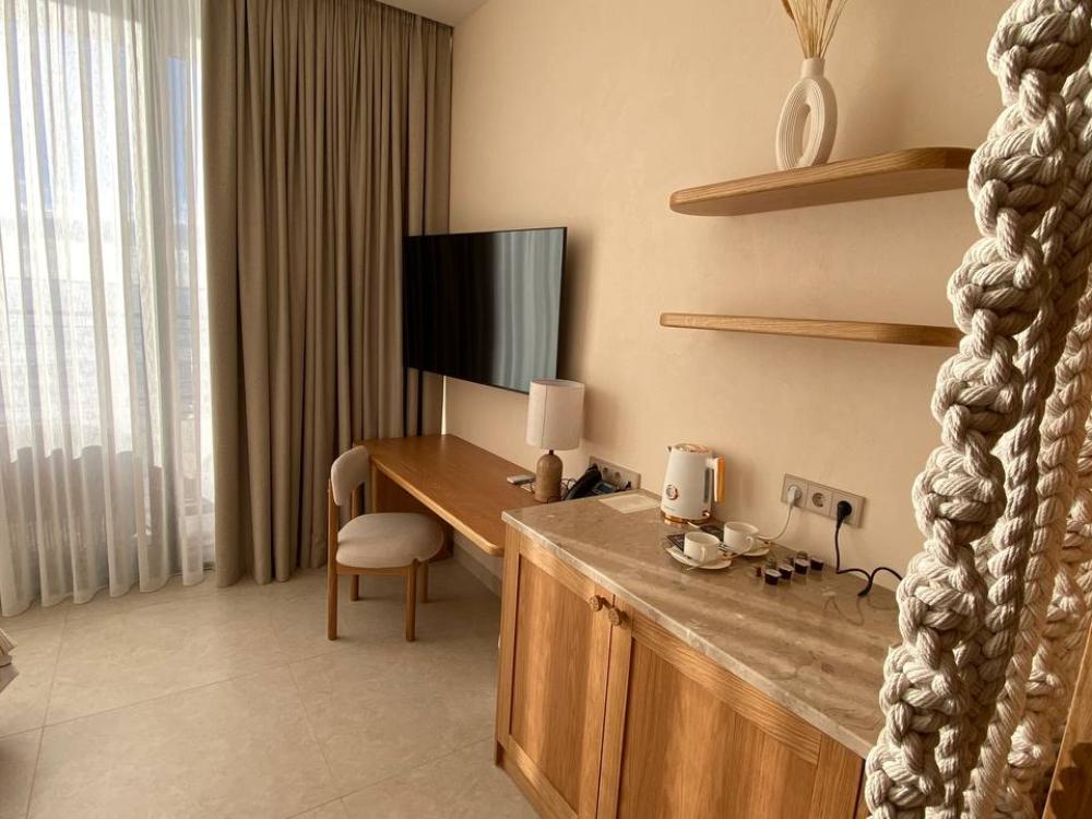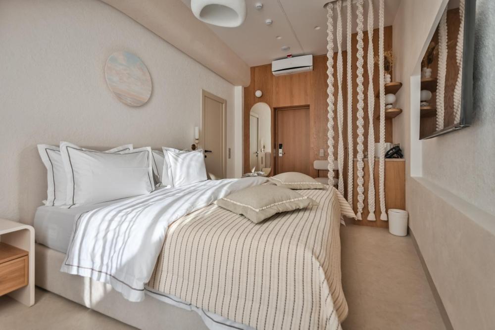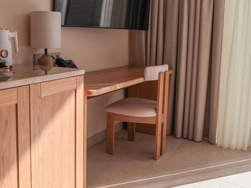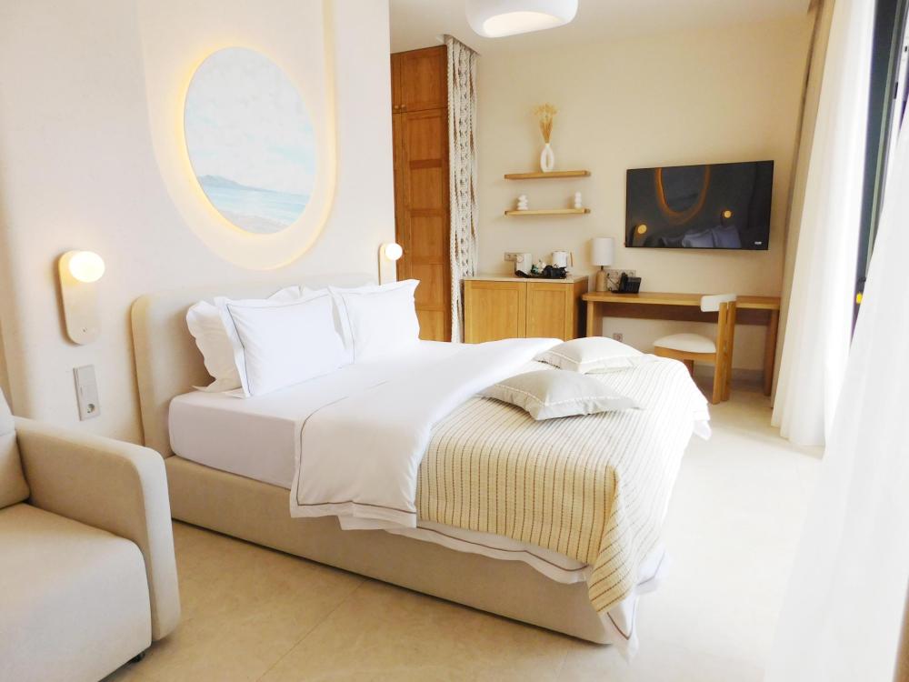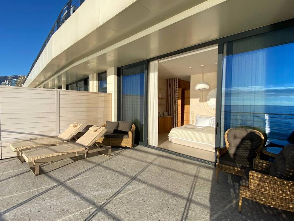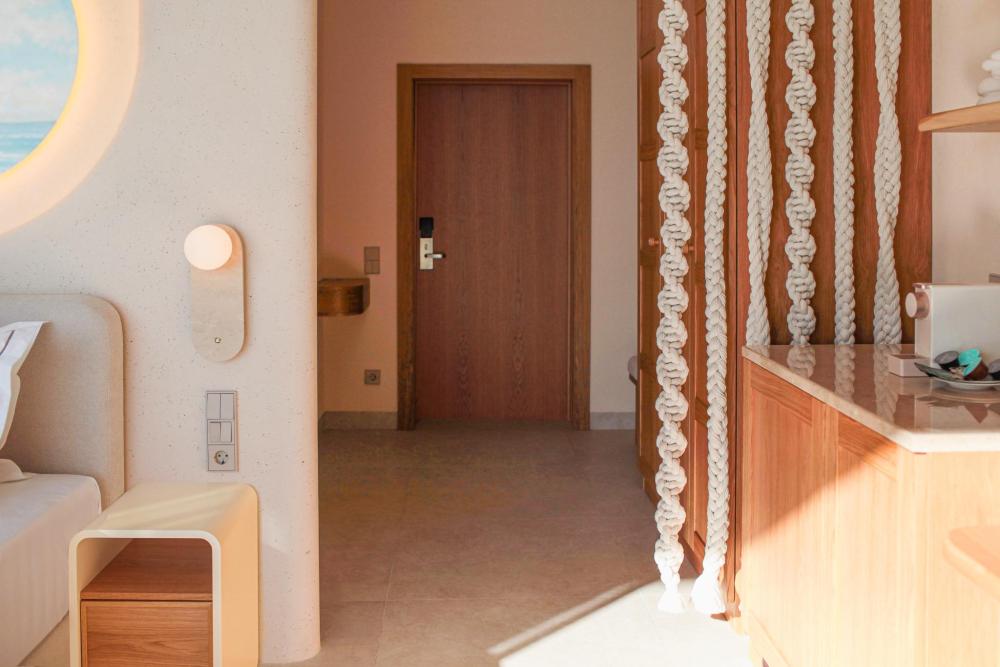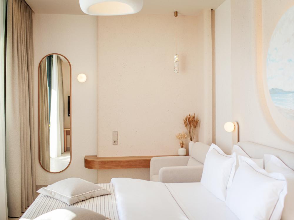 Для тех, кто хочет быть ближе к морю — буквально. Из собственной террасы открывается прямой выход к воде, а лёгкий морской бриз становится частью пространства. Здесь приятно начинать день прогулкой вдоль берега и ощущать, что море — почти твоё личное. Просторный номер площадью 21,3 м² рассчитан на двоих и оснащён всем необходимым: большая двуспальная кровать 180×200 см, телевизор, мини-бар, кофемашина, письменный стол, настольная лампа и отдельная гардеробная, добавляющая комфорта. Кондиционер и тёплый пол обеспечивают уют в любую погоду. На террасе — шезлонги, кресла, столик и пляжные полотенца, чтобы можно было отдыхать у воды, не покидая номер. В ванной — душ, зеркало с подсветкой, фен, весы, наборы для ухода и текстиль для каждого гостя. Ежедневная уборка поддерживает чистоту, полотенца меняются раз в два дня или по запросу, постельное бельё — каждые три дня.