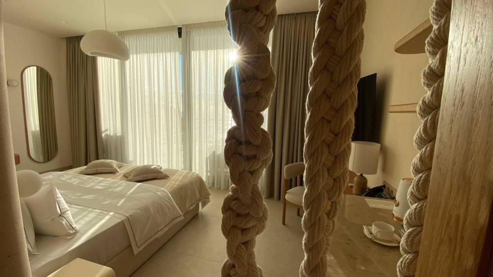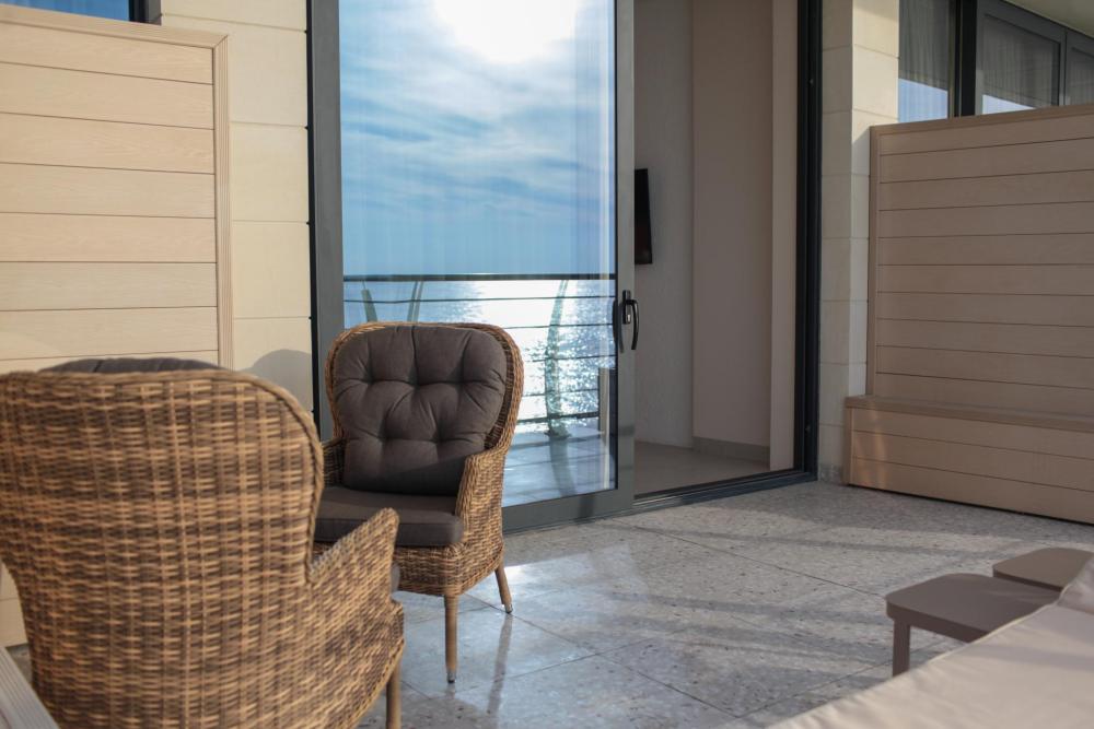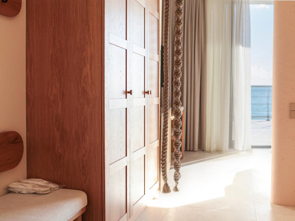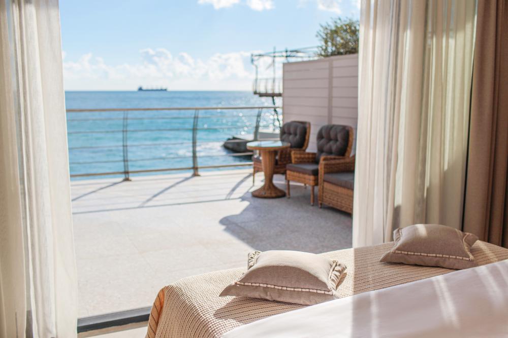 Выбор для тех, кто путешествует вдвоём или с ребёнком. Просторный номер площадью 23,9–25,4 м² с видом на море создан, чтобы отдыхать вместе и не терять ощущения личного пространства. В номере — большая двуспальная кровать 180×200 см и дополнительное место на раскладном кресле-кровати, телевизор, мини-бар, капсульная кофемашина, письменный стол и отдельная гардеробная. Кондиционер и тёплый пол создают комфорт в любую погоду. На террасе — кресла, диван, шезлонги и столики для отдыха у моря. В ванной комнате — душ, зеркало с подсветкой, фен, весы и наборы для ухода, халаты, тапочки и полотенца для каждого гостя. Ежедневная уборка поддерживает свежесть, полотенца меняются раз в два дня или по запросу, постельное бельё — каждые три дня.