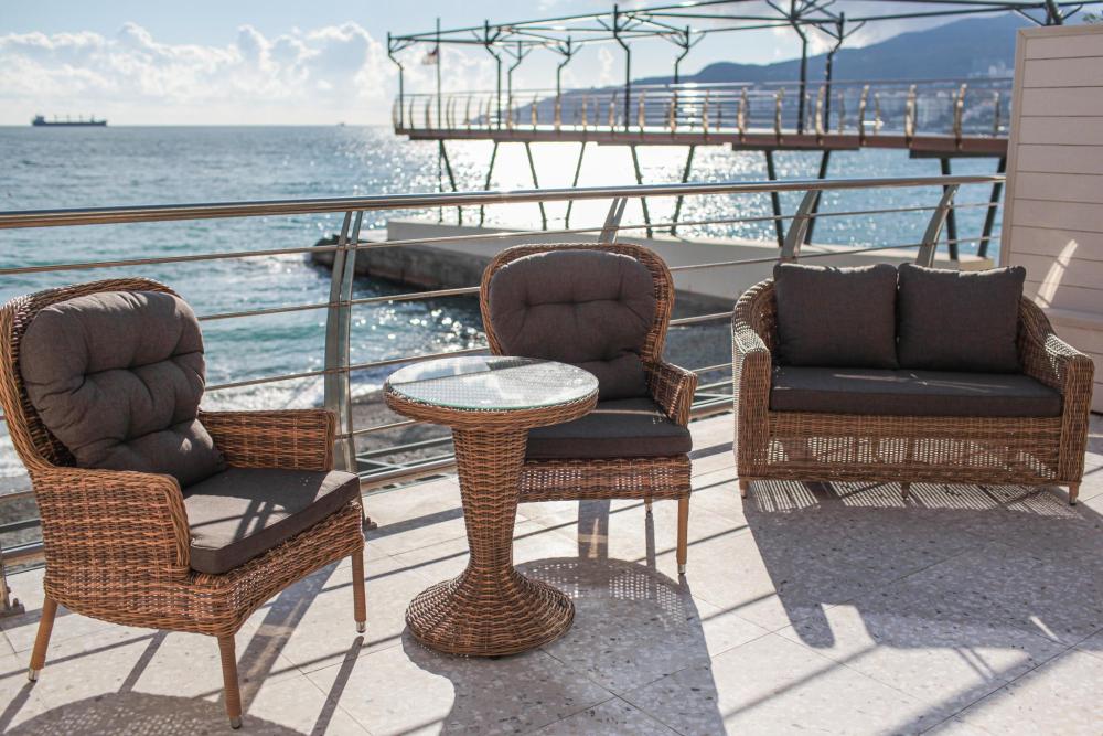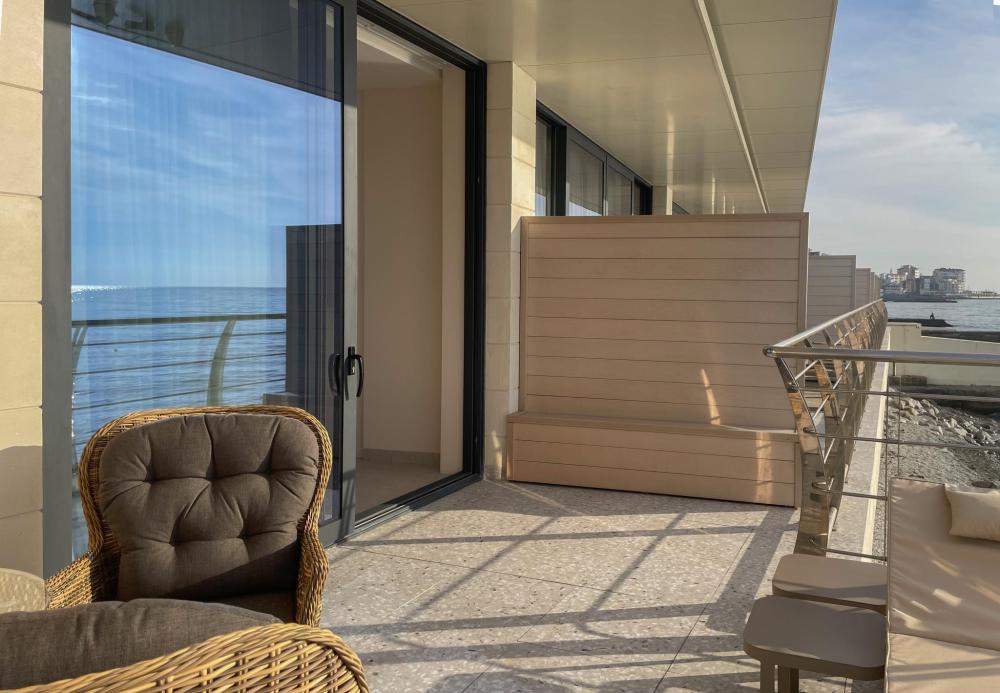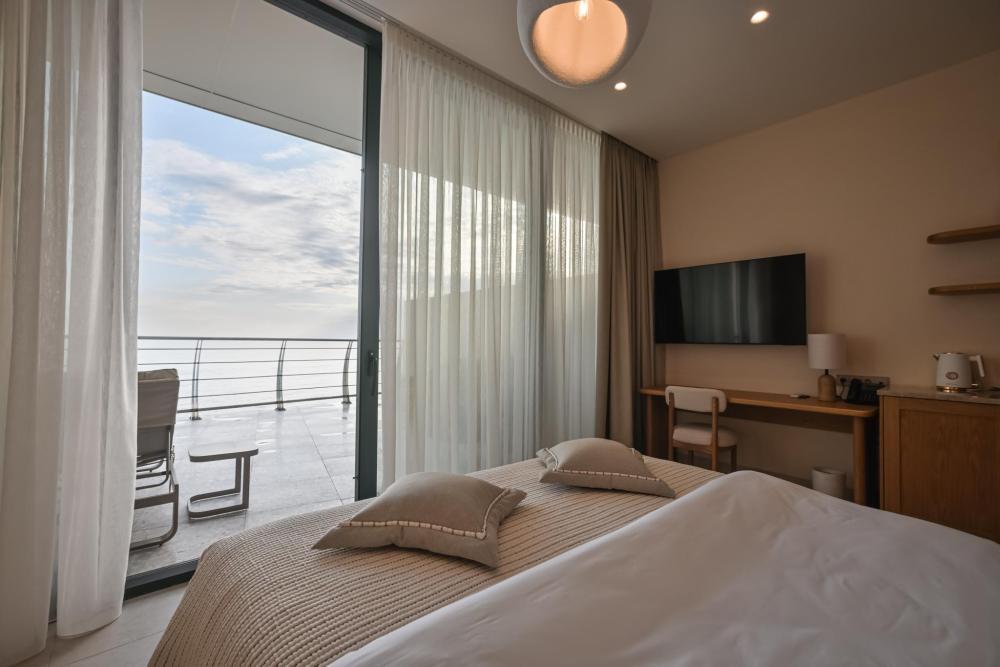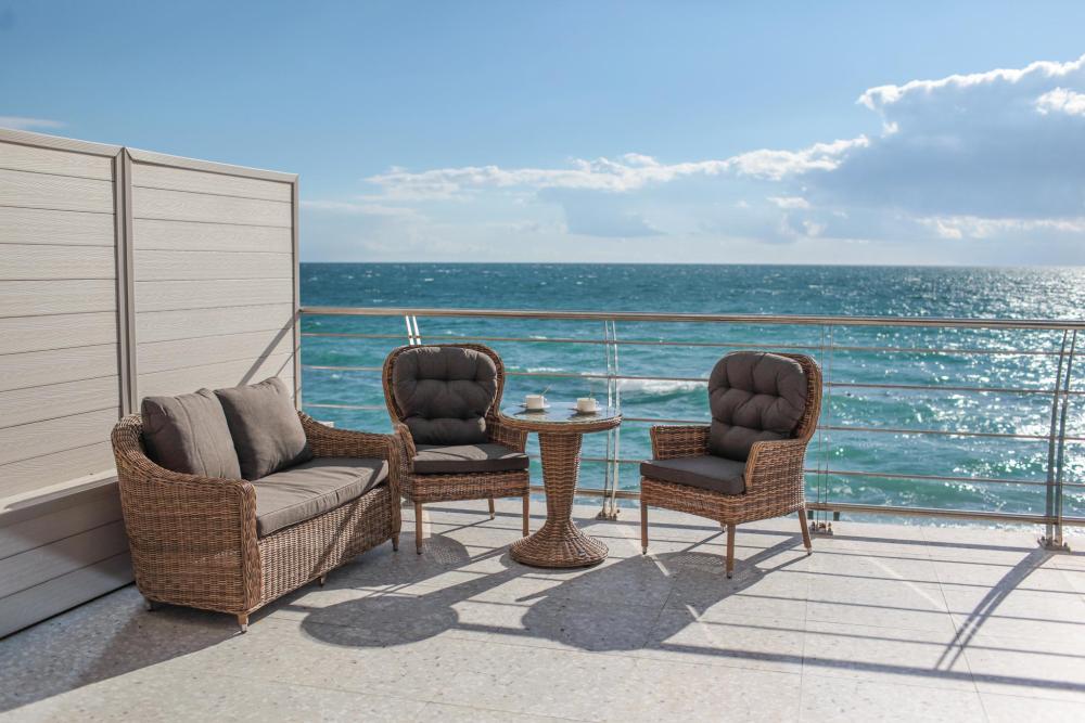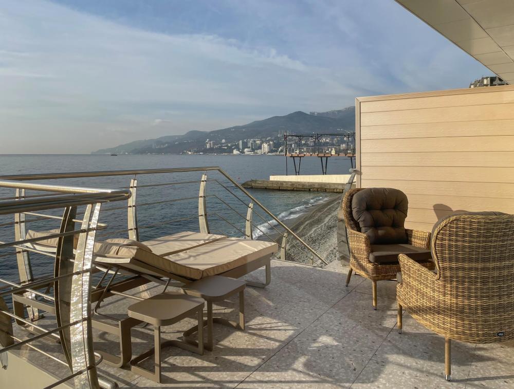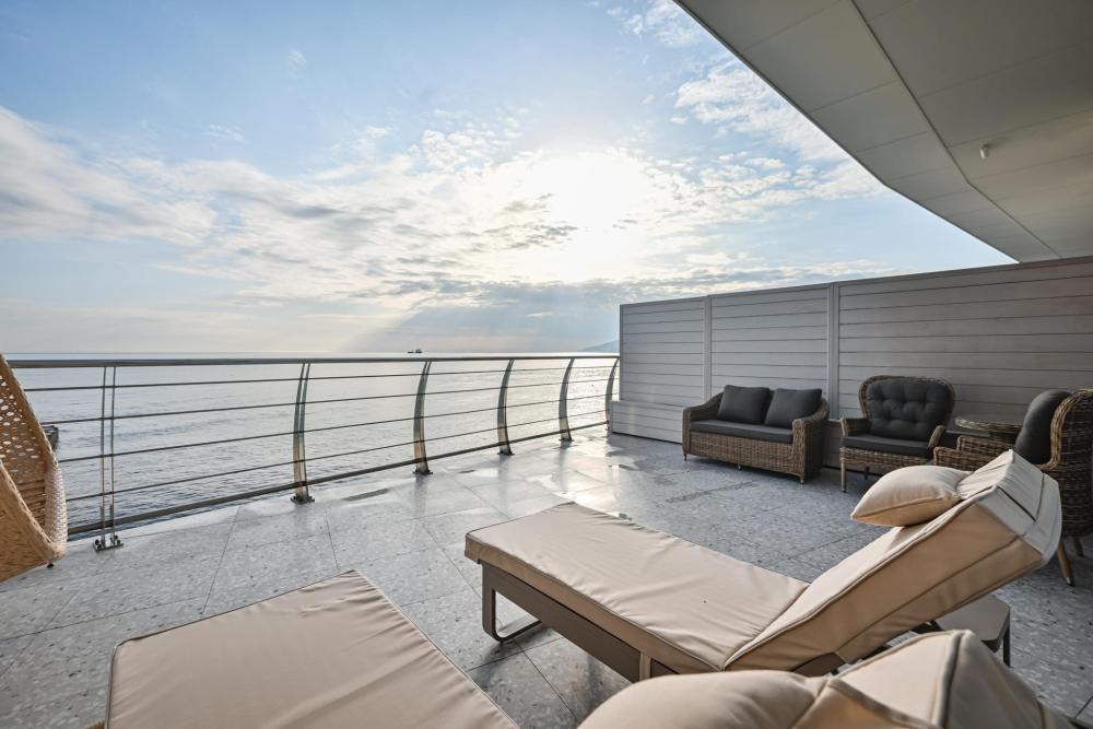 Этот номер создан для тех, кто ценит тишину, свет и утро с видом на море. Здесь всё продумано для отдыха вдвоём: просторная двуспальная кровать 180×200 см, терраса с креслами и шезлонгами, где можно проводить время с чашкой кофе, слушая дыхание волн у горизонта. Площадь номера — от 15,6 до 17,9 м², что позволяет сохранить чувство пространства без лишних деталей. Внутри — телевизор, мини-бар, капсульная кофемашина, чайные пары, письменный стол и настольная лампа. Комфорт поддерживают кондиционер и тёплый пол. В ванной комнате — душ, зеркало с подсветкой, фен, весы и наборы для ухода: зубной, бритвенный и косметический, а также халаты, тапочки и полотенца для каждого гостя. Ежедневно проводится уборка, полотенца меняются раз в два дня или по запросу, постельное бельё — каждые три дня. В распоряжении гостей — бесплатный Wi-Fi, парковка, прачечная, салон красоты Sky Beauty и обслуживание в номер. Всё, что нужно, рядом, ничего лишнего — только море, свет и покой.