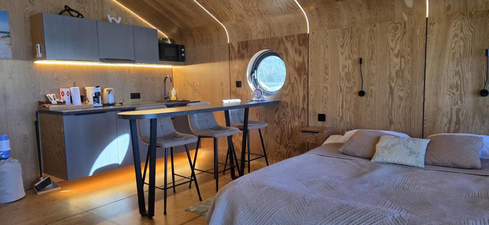 Домик рассчитан на 2–3 человек и оснащён всем необходимым: • Комфортная кровать и диван, • Современная кухня, душ и туалет, • Панорамные окна с потрясающим видом на море. Домик располагается на пляже среди белых дюн всего в 50 м от моря. Особая гордость – просторная терраса. Выпейте утренний кофе под шум волн, насладитесь закатом или устройте романтический вечер под звёздами. “Море Рядом” – это место, где можно отдохнуть, расслабиться и зарядиться энергией. Уютно, тепло, красиво – и море буквально в шаге от вас. Ждём вас в гости в Янтарном!