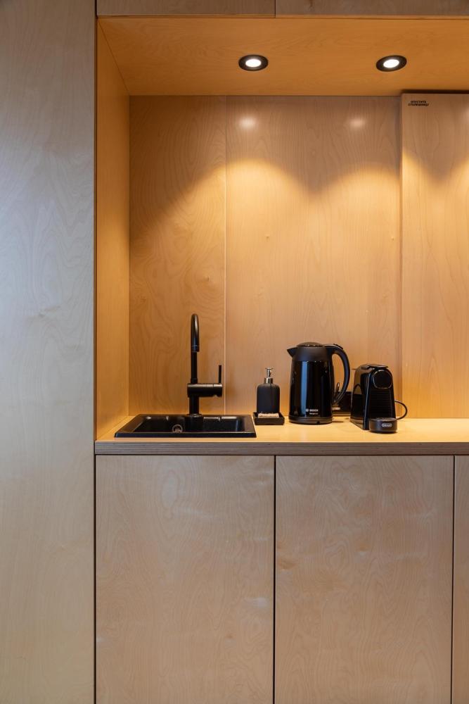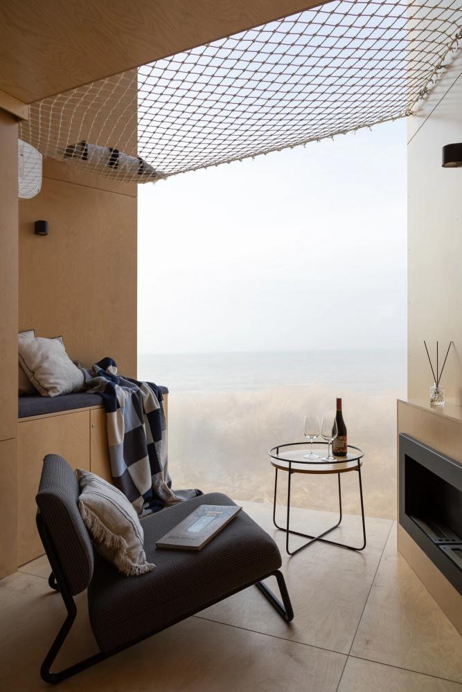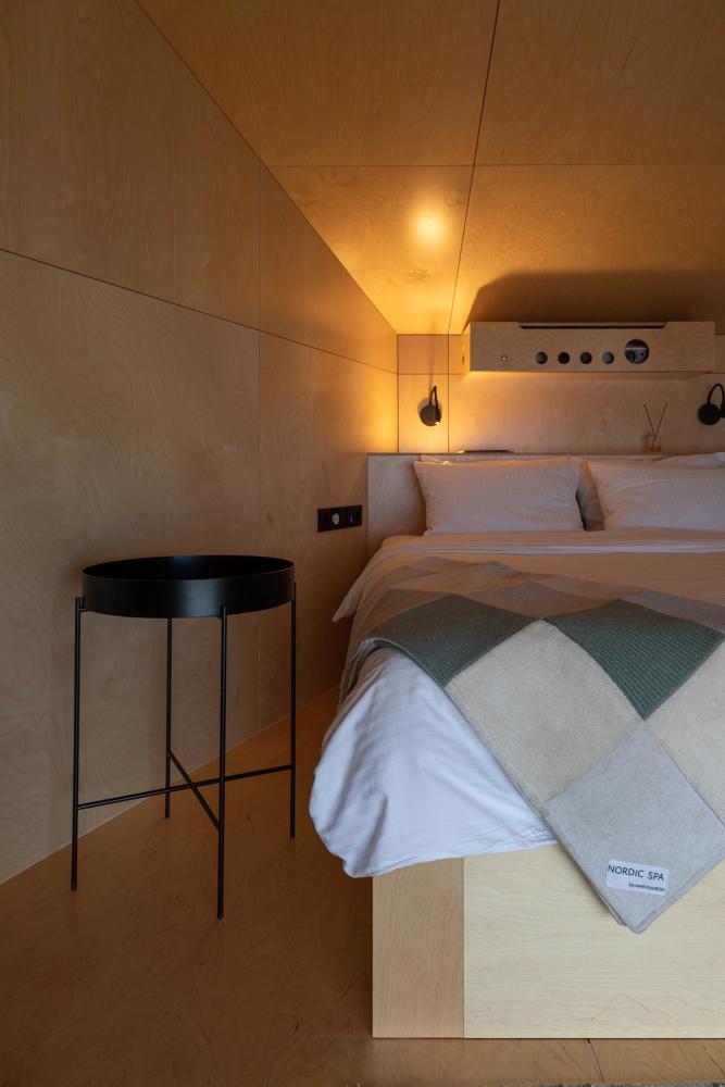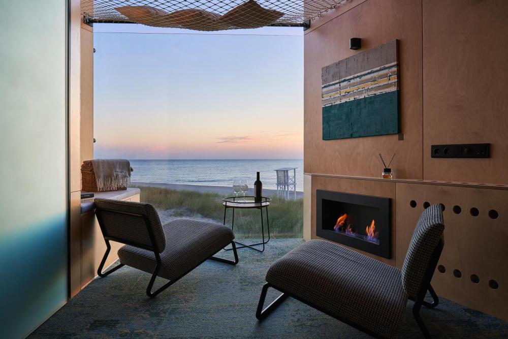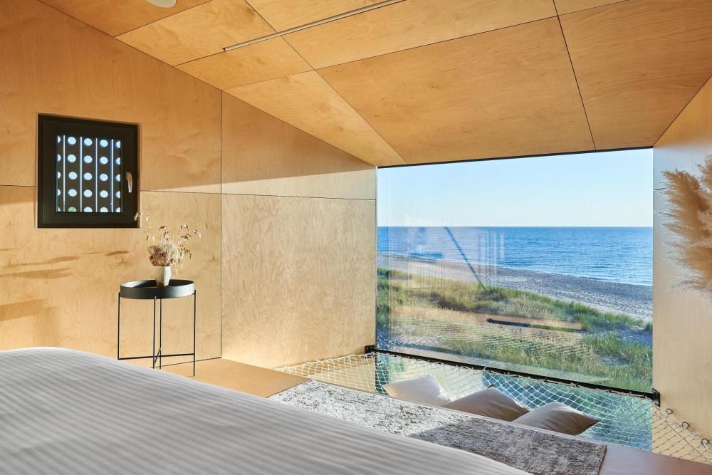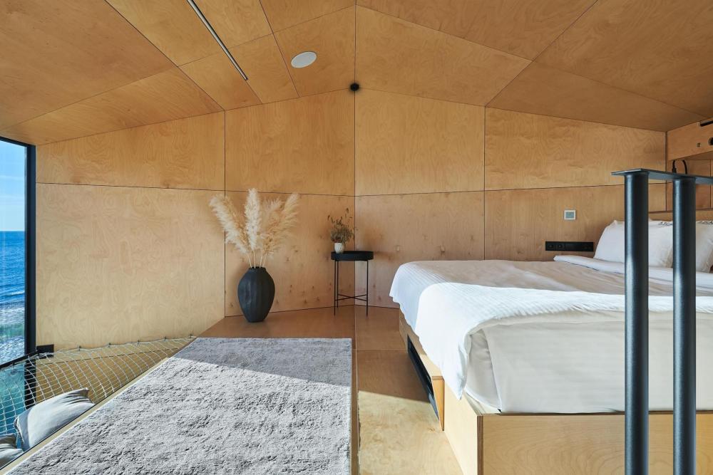 Двуспальная кровать и гамак расположены напротив фронтального окна, откуда открывается захватывающий вид на Балтику. На первом этаже находится обеденная зона и биокамин. В домике имеются мини-холодильник для хранения продуктов и охлаждения напитков, чайник, кофе-машина, посуда и кухонные приборы. Теплый пол, полотенца, тапочки и халаты – все детали для уюта. Ароматы косметики для душа норвежской компании Fitjar наполняют воздух изысканными нотками роскоши. Также в домике имеется большой экран и кинопроектор, качественная стереосистема