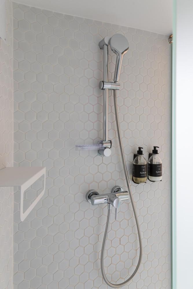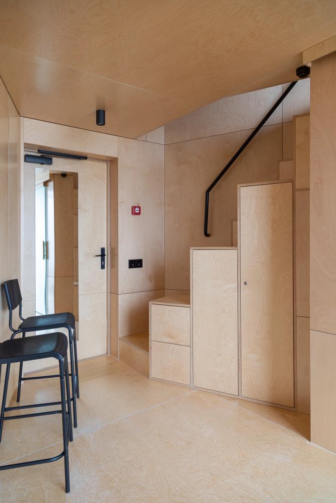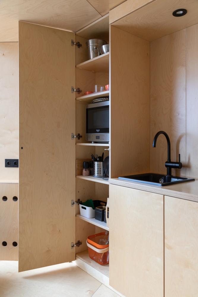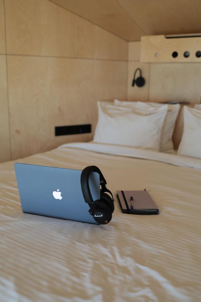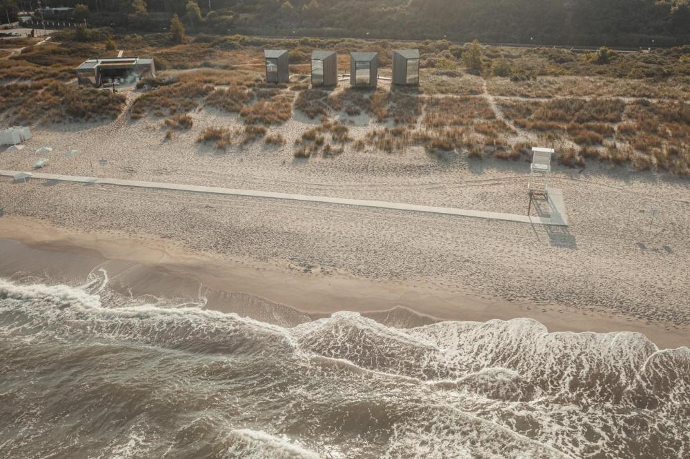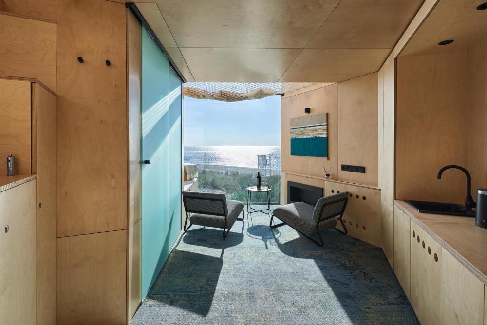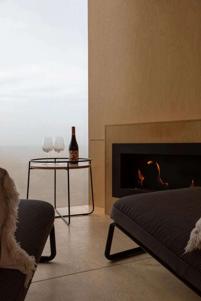 Двуспальная кровать и гамак расположены напротив фронтального окна, откуда открывается захватывающий вид на Балтику. На первом этаже находится обеденная зона и биокамин. В домике имеются мини-холодильник для хранения продуктов и охлаждения напитков, чайник, кофе-машина, посуда и кухонные приборы. Теплый пол, полотенца, тапочки и халаты – все детали для уюта. Ароматы косметики для душа норвежской компании Fitjar наполняют воздух изысканными нотками роскоши. Также в домике имеется большой экран и кинопроектор, качественная стереосистема