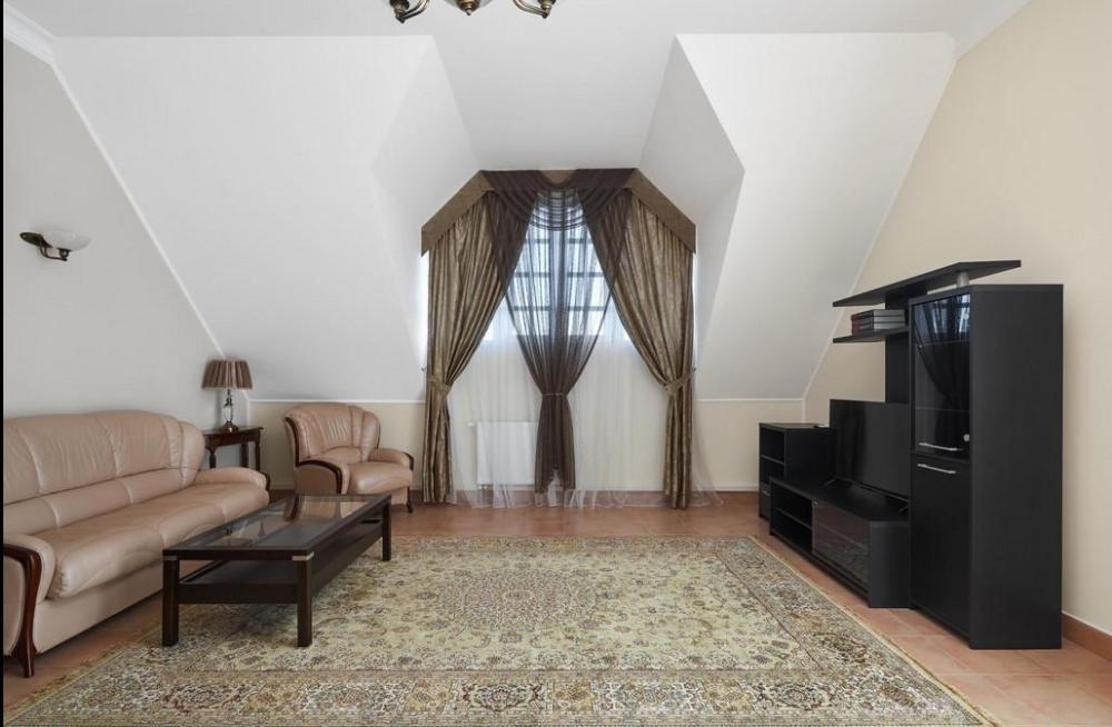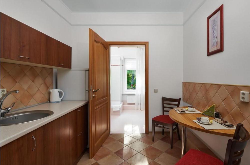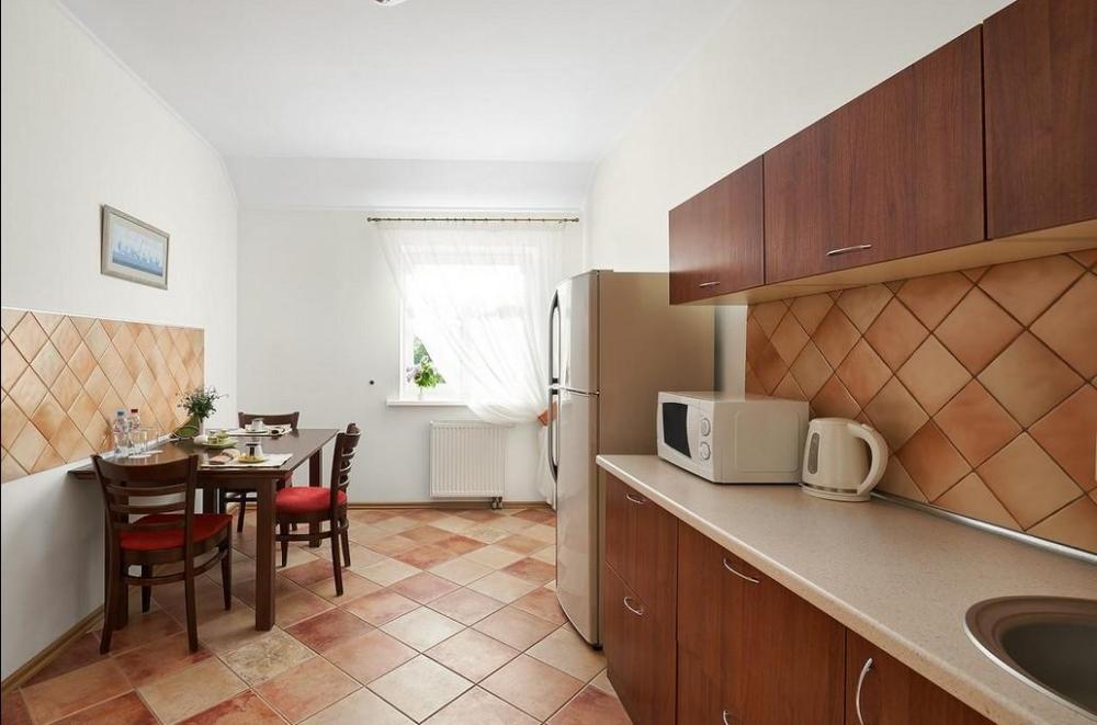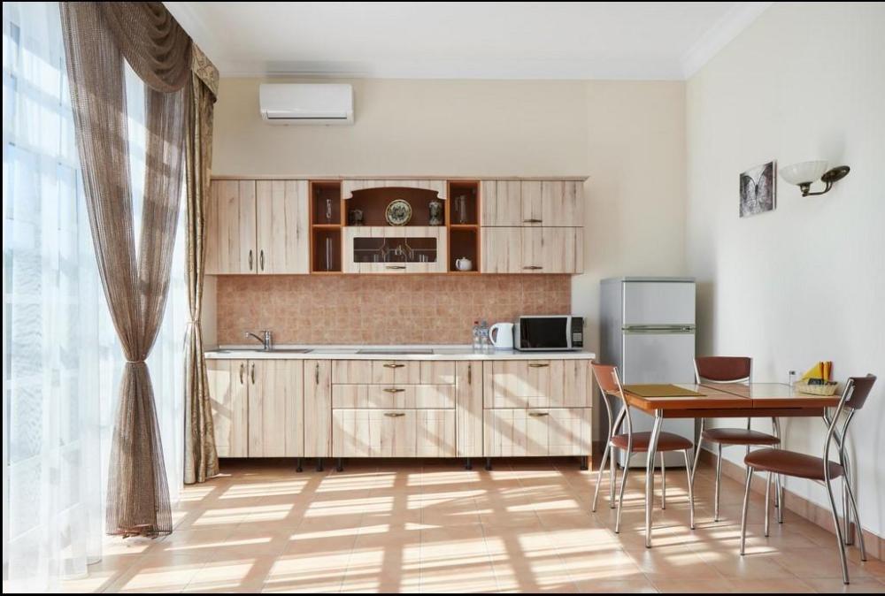 Номер- апартаменты состоит из кухни, спальни, прихожей и ванной комнаты, площадью 45 кв. м. Номер меблирован по евростандарту и оборудован всем необходимым для комфортного отдыха. В кухне находится кухонный гарнитур: шкафчики для посуды, стол, тумбы, стулья, микроволновая печь, посуда, чайник, холодильник. В спальне находится одна двуспальная кровать, прикроватные тумбы, бра, телевизор, телефон, бесплатный Wi-Fi. В прихожей имеется шкаф для одежды, зеркало, губка для обуви, тапочки, багажница. В ванной комнате: ванна, раковина, зеркало, сан. узел, расширенный набор полотенец, фен, шапочка для душа, мыло, гель для тела, шампунь, мыло, туалетная бумага.