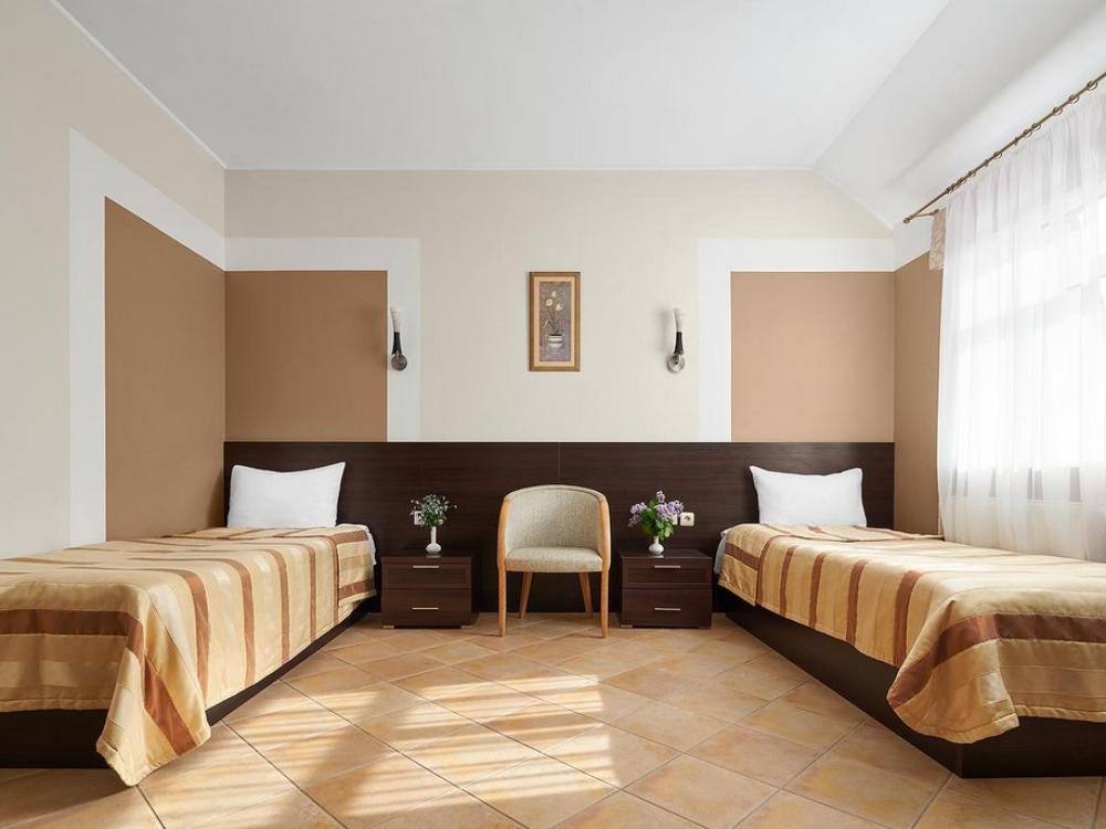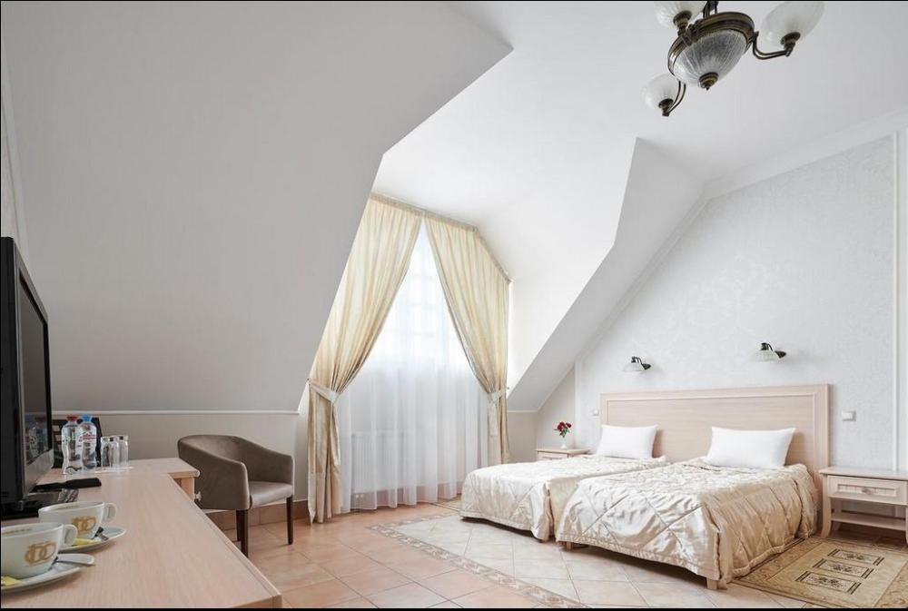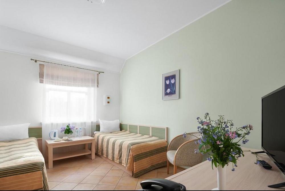 Двухместный стандартный номер с двумя раздельными кроватями состоит из комнаты, прихожей и ванной комнатой, площадь 30-35 кв. м. Номер меблирован по евростандарту и оборудован всем необходимым для комфортного отдыха. Номер оборудован двумя полутороспальными кроватями, прикроватными тумбочками, креслом, журнальным столиком, телевизором, телефоном, холодильником, бесплатный Wi-Fi. В прихожей имеется шкаф для одежды, зеркало, губка для обуви, тапочки. В ванной комнате: расширенный набор полотенец, фен, шапочка для душа, мыло, гель для тела, шампунь, мыло, туалетная бумага.