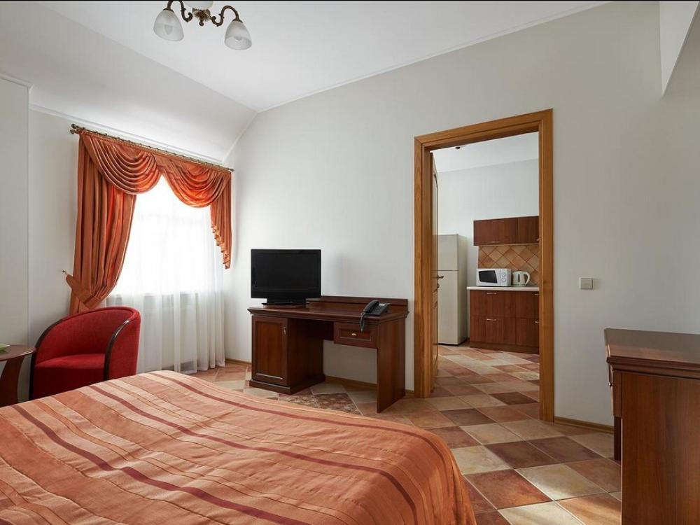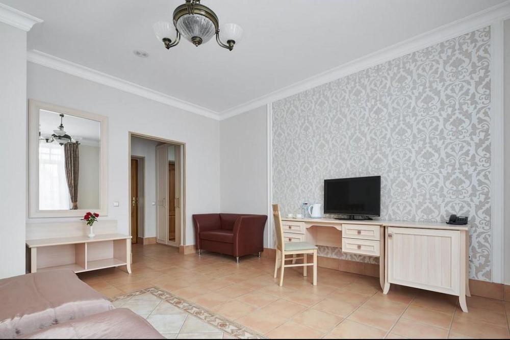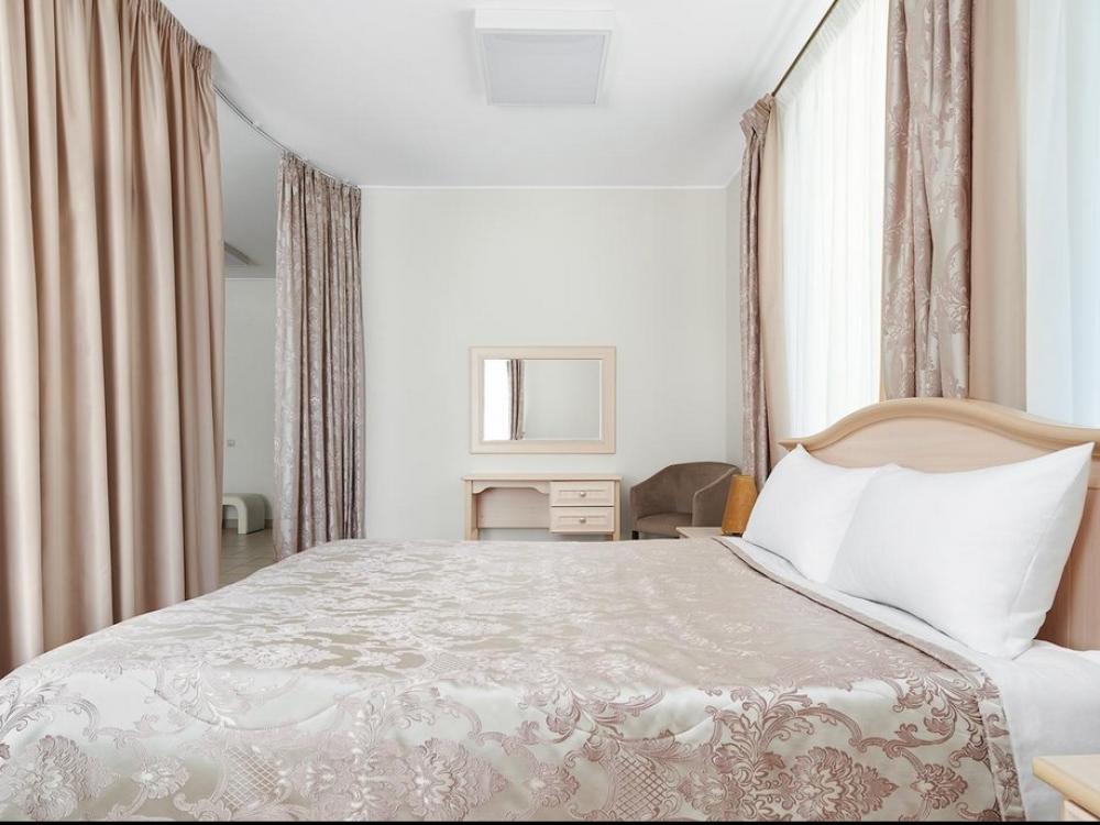 Двухкомнатный номер с улучшенной планировкой состоит из двух комнат: гостиной и спальни, прихожей и ванной комнаты, площадью 45-50 кв. м. Номер меблирован по евростандарту и оборудован всем необходимым для комфортного отдыха. В гостиной находится: большой раскладной диван, тумба, 2 кресла, телевизор, телефон. В спальне находится двуспальная кровать, прикроватные тумбы, бра, зеркало, стол для зеркала, бесплатный Wi-Fi. В прихожей имеется шкаф для одежды, зеркало, губка для обуви, тапочки, багажница. В ванной комнате: ванна, раковина, зеркало, сан. узел, расширенный набор полотенец, фен, шапочка для душа, мыло, гель для тела, шампунь, мыло, туалетная бумага.