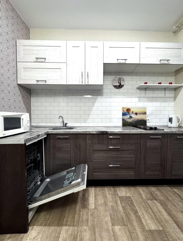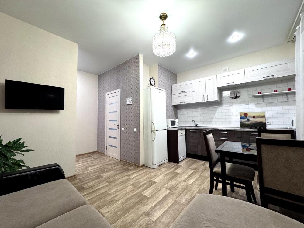 Двухкомнатные апартаменты с гостиной-студией. Площадь: 50 кв.м. Квартира без балкона на 3 этаже, лифта нет. Раздельные комнаты. Удобства: высокоскоростной wi-fi интернет, 2 TV, оборудованная кухня с бытовой техникой (микроволновая печь, духовой шкаф, электрочайник, холодильник), посудомоечная машина, автоматическая стиральная машина, утюг и гладильная доска, фен, водонагреватель для использования в периоды отключения горячей воды.