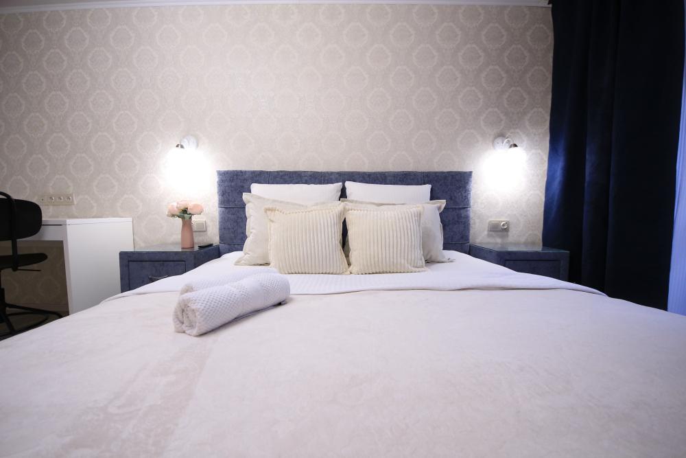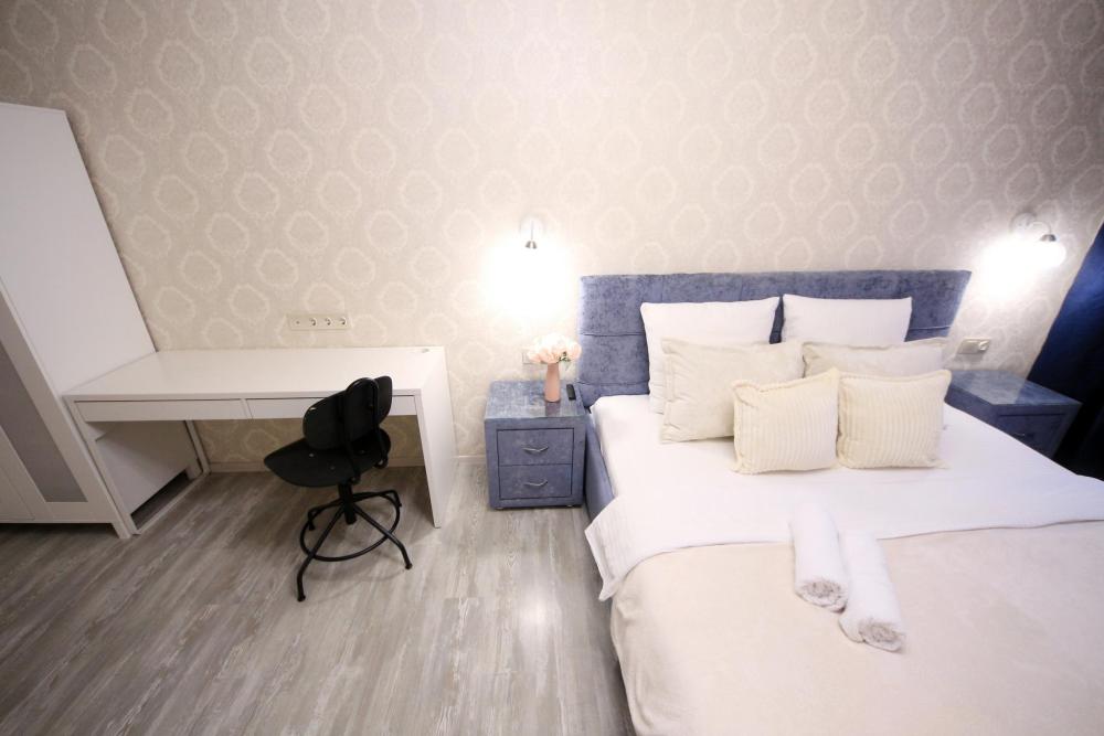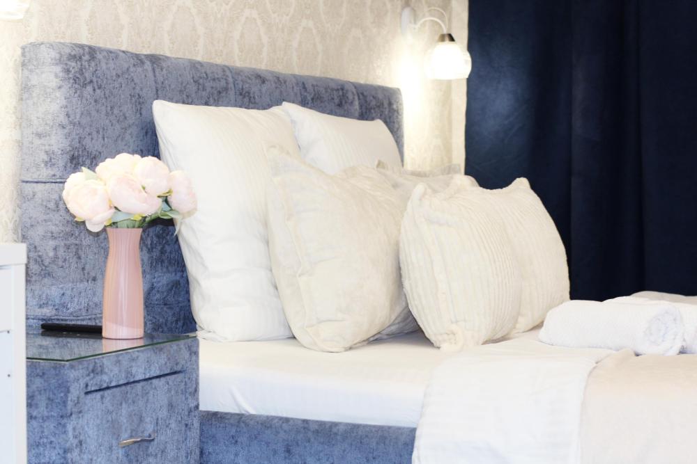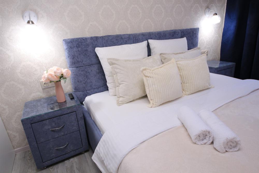 ?Квартира на 4 гостей. Две особо-широкие кровати "King-Size", с ортопедическими матрасами для идеального сна. На синей кровати можно уместиться втроем с маленьким ребенком (без места).
