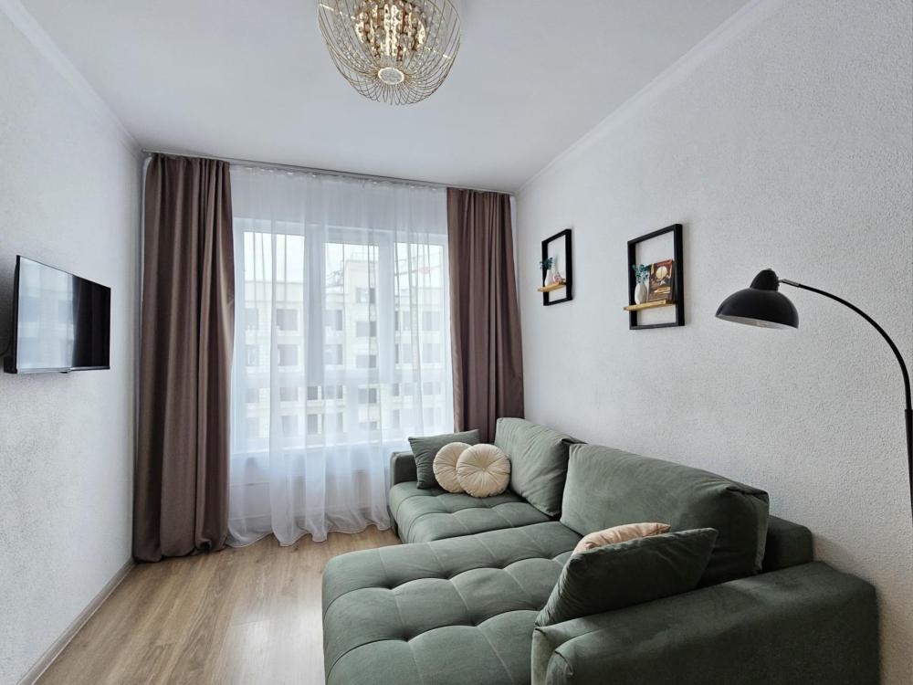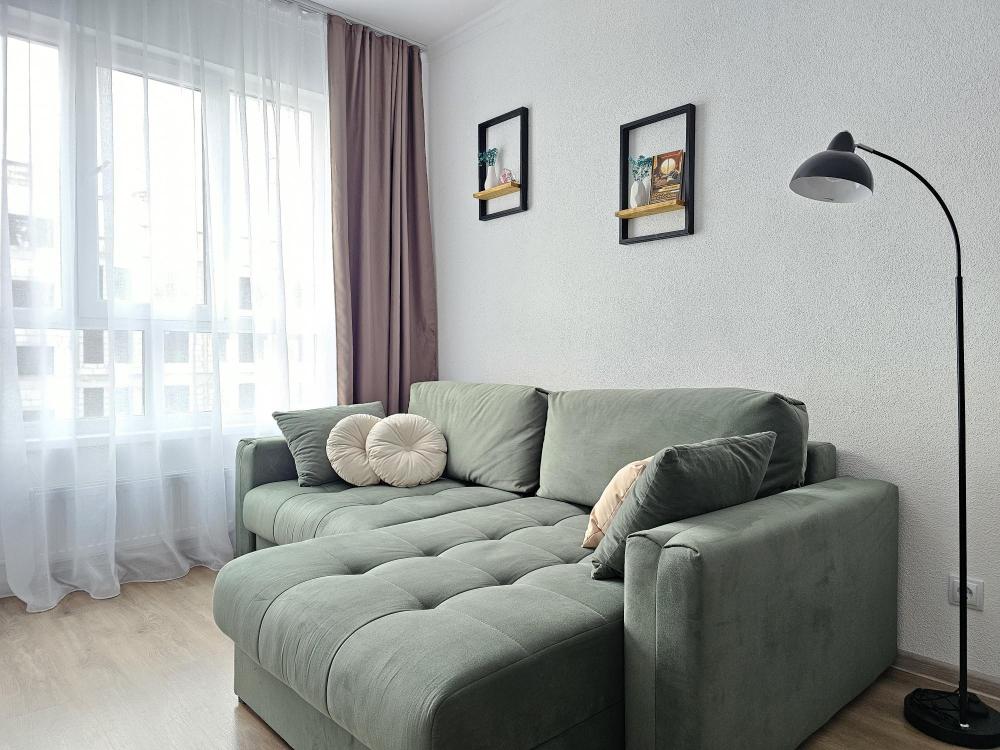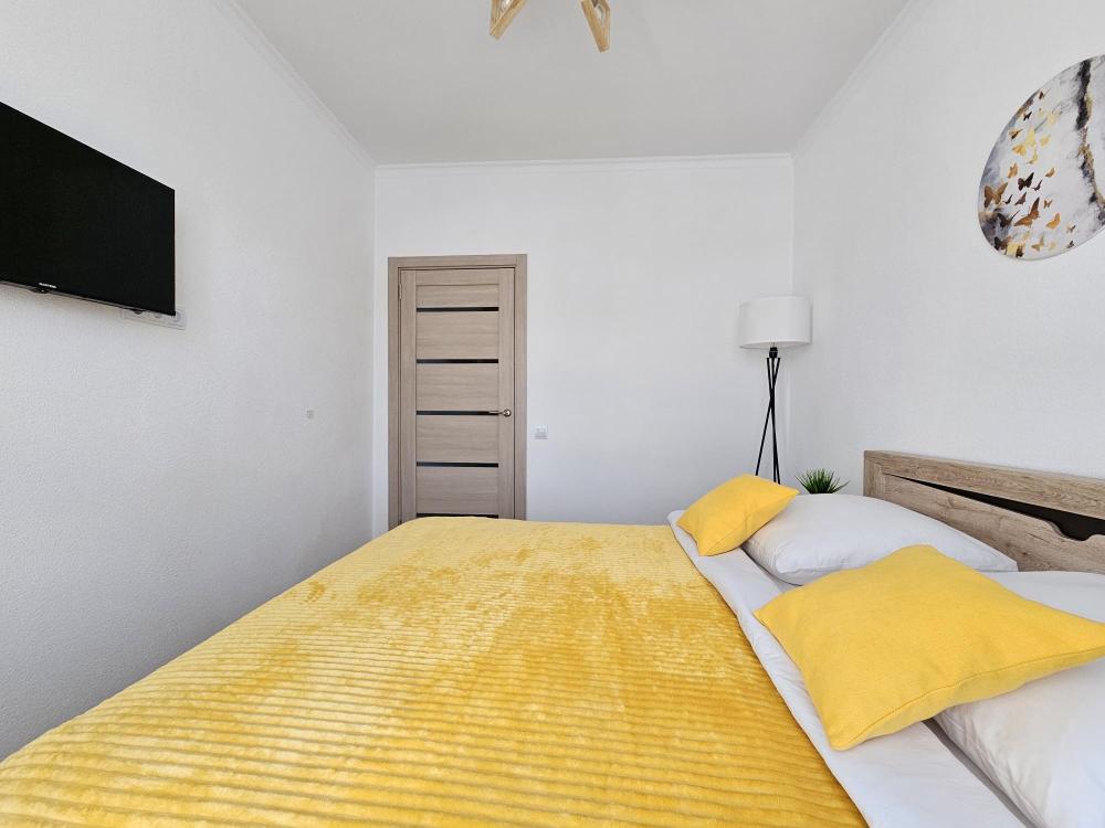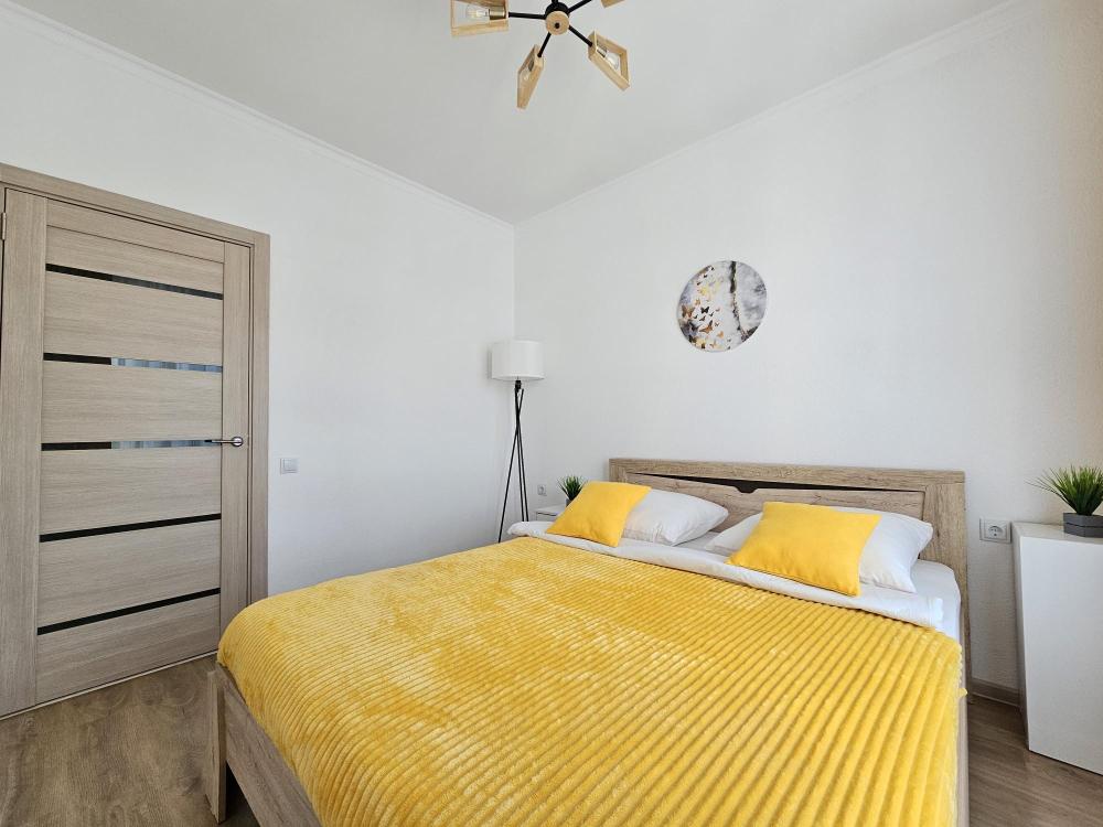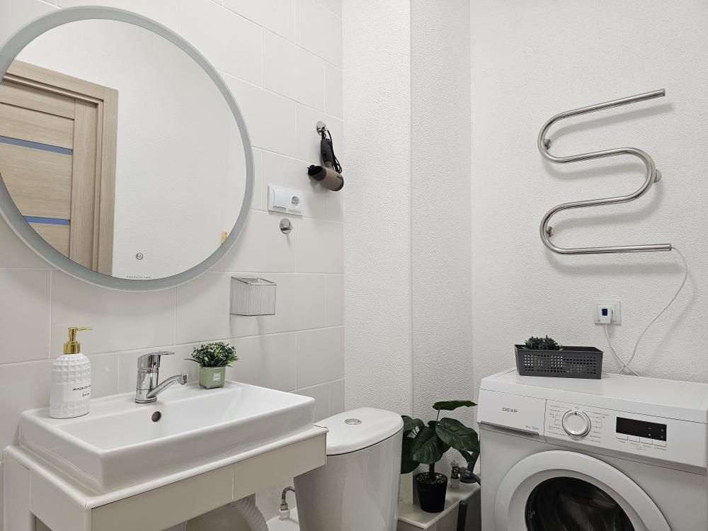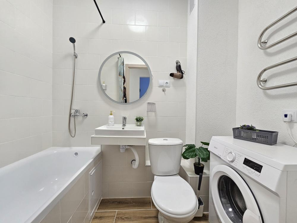 Квартира оснащена: 2 раздельных спальных места - двуспальная кровать, двуспальный диван. Белое постельное белье. В стоимость включен комплект на кровать. Комплект полотенец из 2х штук - для душа и для рук. Кухня с полным комплектом посуды, холодильником, электро чайником, микроволновкой. Имеется утюг, гладильная доска, фен, стиральная машина, сушилка для белья. Телевизор. Бесплатный WI-FI. Средства гигиены: шампунь и гель для душа. Квартира укомплектована всем необходимым для долгосрочного проживания.