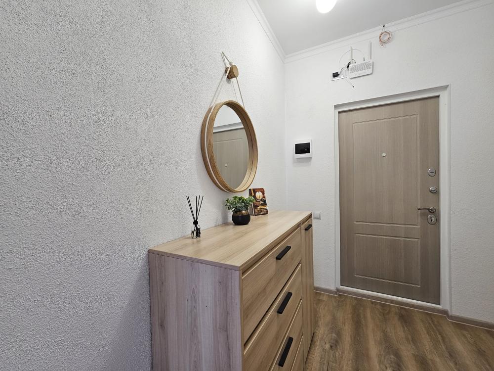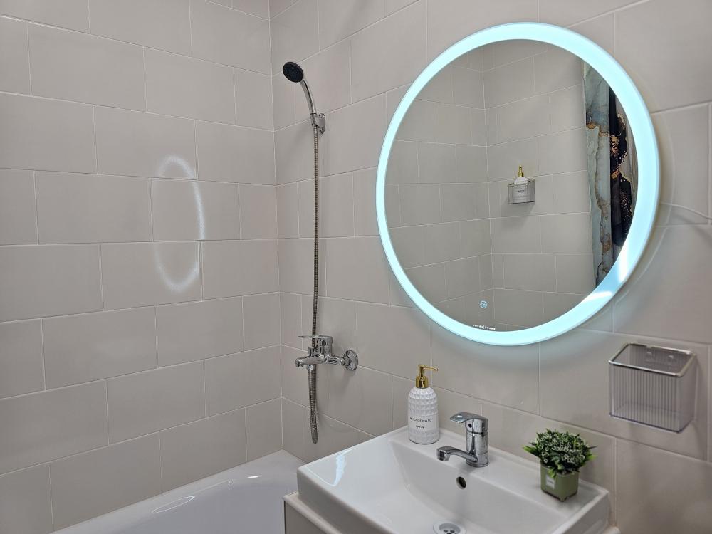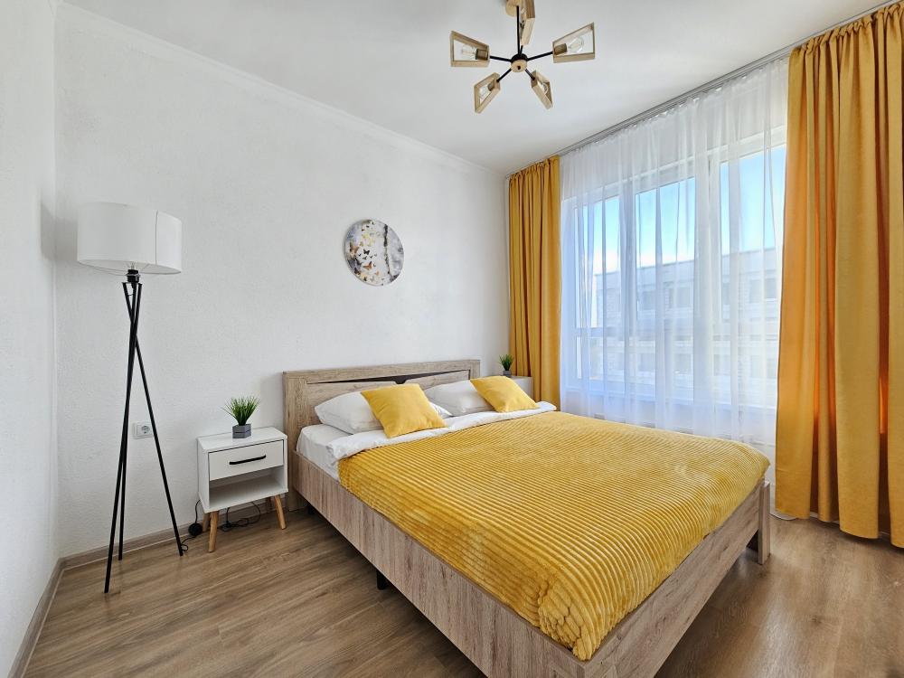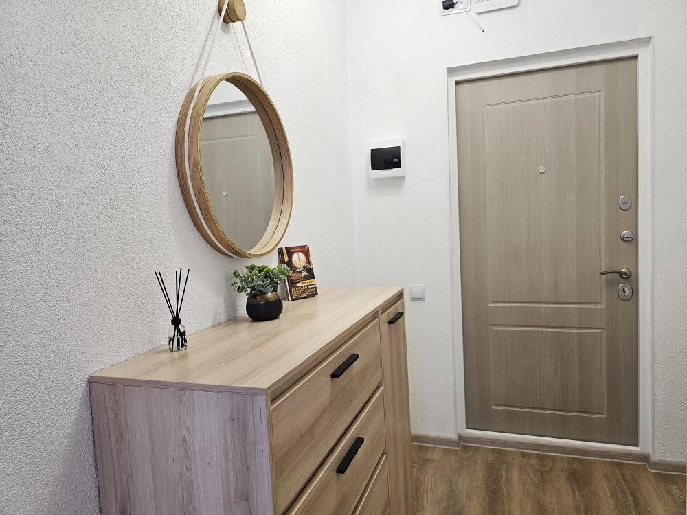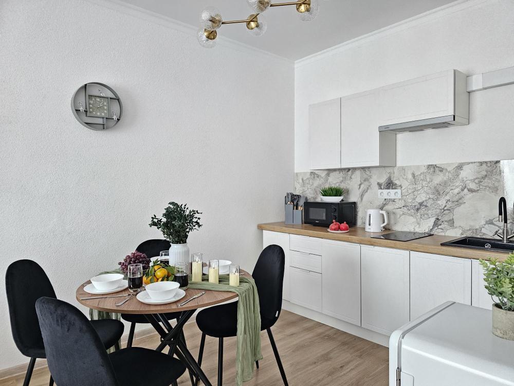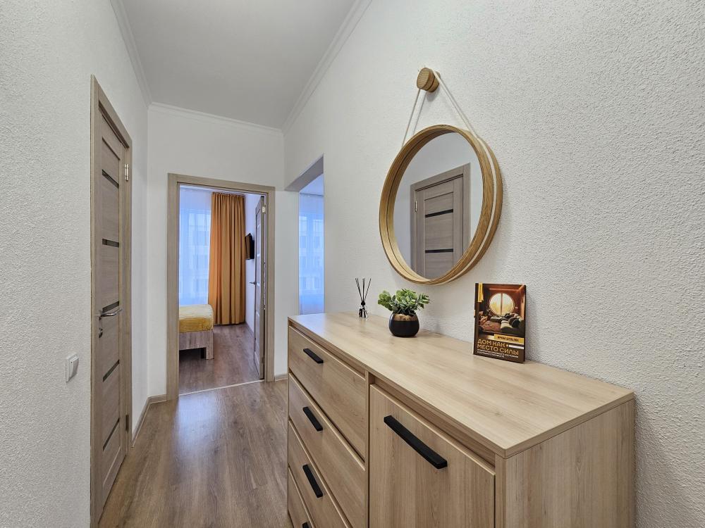Квартира оснащена: 2 раздельных спальных места - двуспальная кровать, двуспальный диван. Белое постельное белье. В стоимость включен комплект на кровать. Комплект полотенец из 2х штук - для душа и для рук. Кухня с полным комплектом посуды, холодильником, электро чайником, микроволновкой. Имеется утюг, гладильная доска, фен, стиральная машина, сушилка для белья. Телевизор. Бесплатный WI-FI. Средства гигиены: шампунь и гель для душа. Квартира укомплектована всем необходимым для долгосрочного проживания.