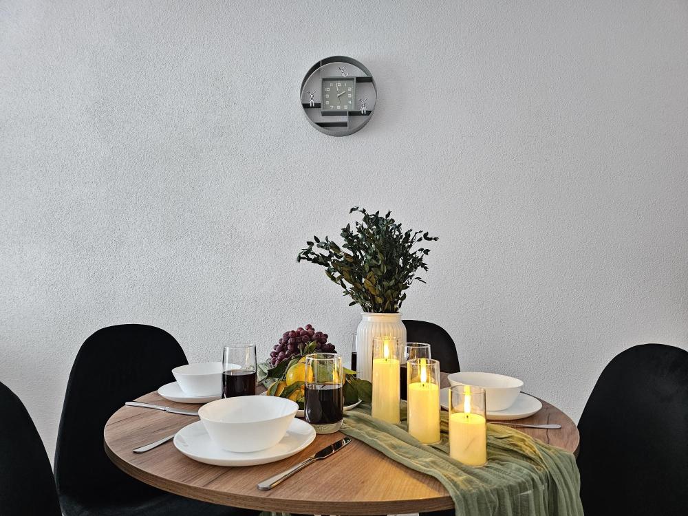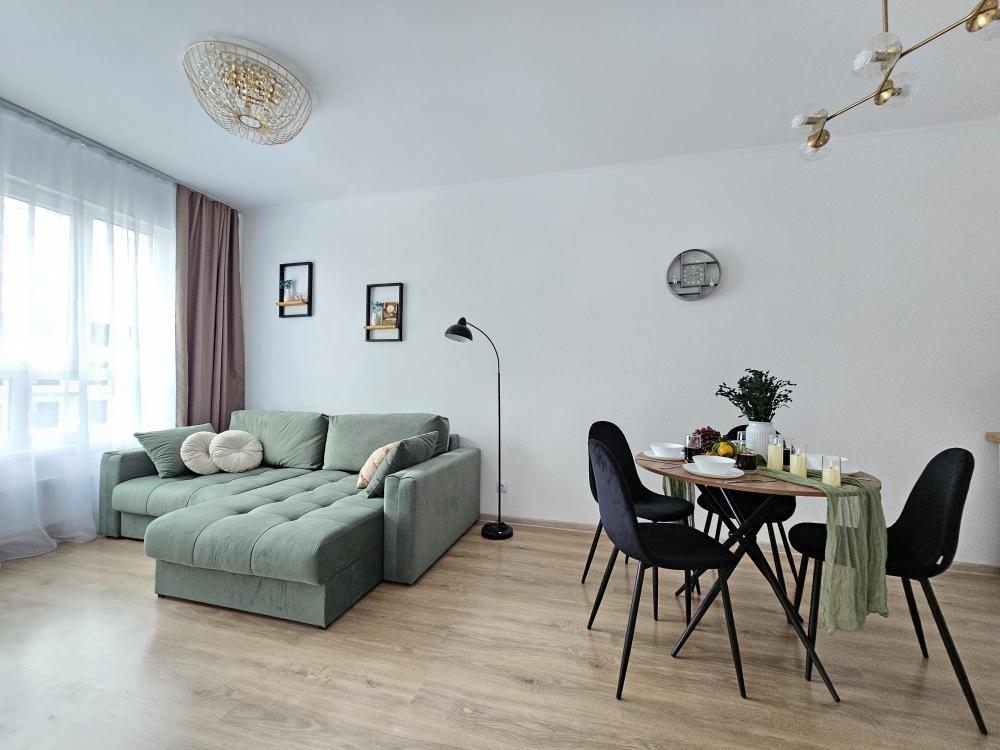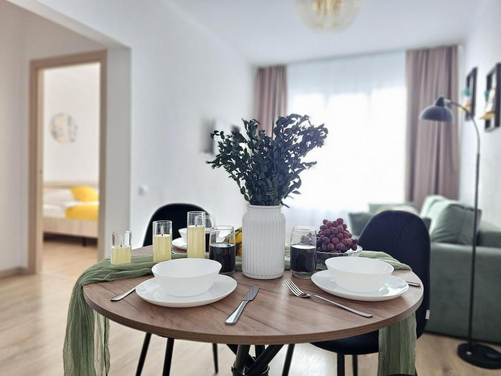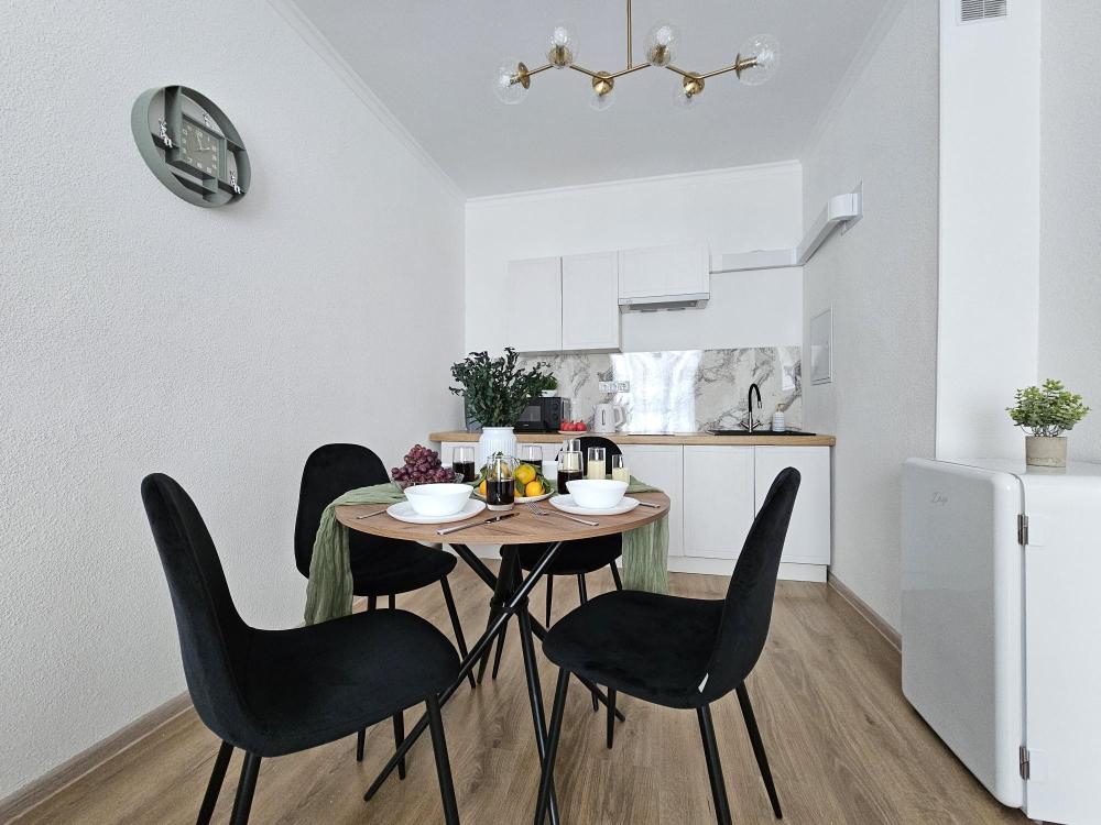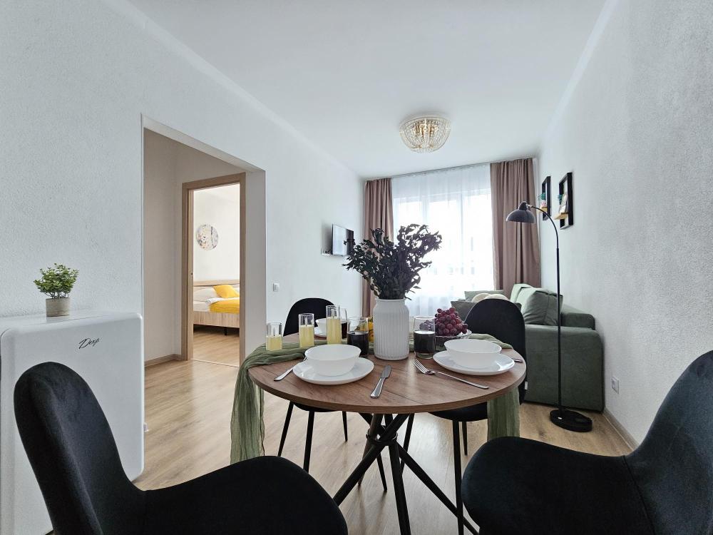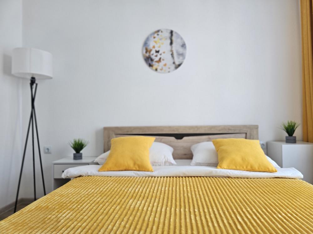 Квартира оснащена: 2 раздельных спальных места - двуспальная кровать, двуспальный диван. Белое постельное белье. В стоимость включен комплект на кровать. Комплект полотенец из 2х штук - для душа и для рук. Кухня с полным комплектом посуды, холодильником, электро чайником, микроволновкой. Имеется утюг, гладильная доска, фен, стиральная машина, сушилка для белья. Телевизор. Бесплатный WI-FI. Средства гигиены: шампунь и гель для душа. Квартира укомплектована всем необходимым для долгосрочного проживания.