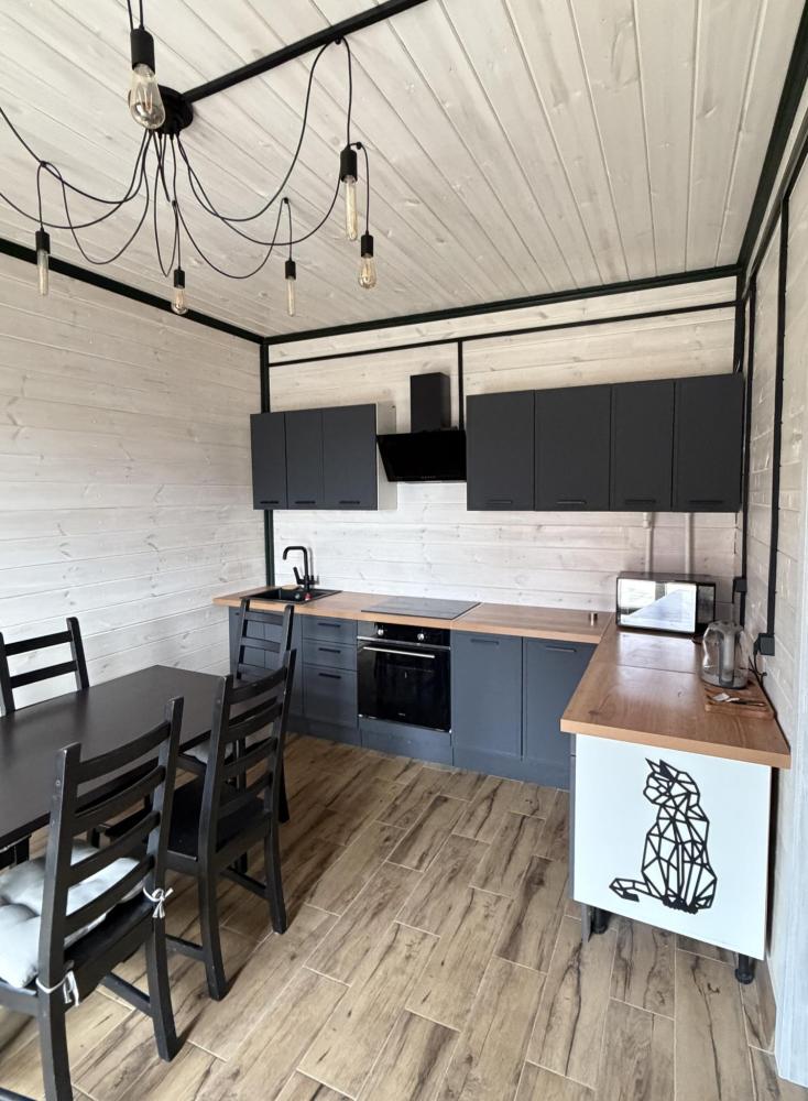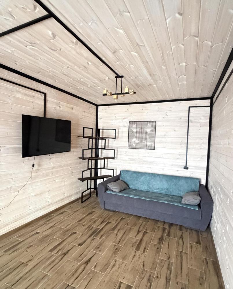 Шале для проживания 4 человек. В шале : двуспальная кровать, 2 кресло-кровати, санузел, холодильник, чайник, вентилятор, смарт ТВ , Wi-Fi, постельное белье, полотенца, предметы личной гигиены, вода, чай, сахар. В шале имеется дровяной камин