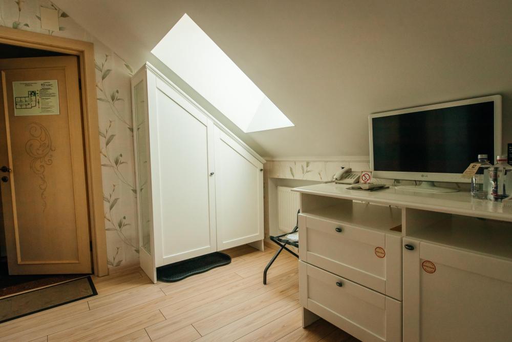 Светлый номер с двуспальной кроватью. Эти номера расположены на третьем (мансардном) этаже отеля. Площадь номера: 14 кв. м. Размер кровати - 140*200 см. В номере: кондиционер, телевизор с плоским экраном, шкаф, холодильник, мини-бар, телефон, доступ в Интернет Wi-Fi или сетевое подключение, тапки. Современная ванная комната оснащена душевой кабиной, феном, косметическими принадлежностями, индивидуальным водонагревателем. В номере возможно размещение третьего человека (ребенок старше 3-х лет или взрослый) на дополнительном месте - еврораскладушке (стоимость составляет 2 000 руб./сутки).