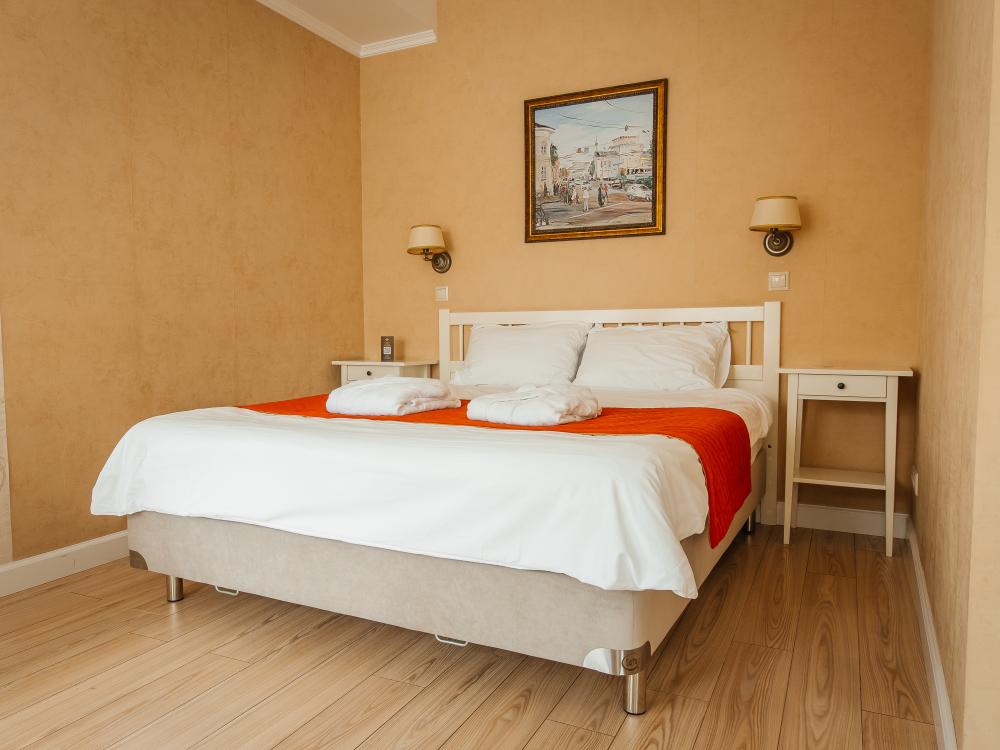 Самый светлый номер в отеле с широкой двуспальной кроватью. Площадь номера: 17,5 кв. м. Размер кровати - 160*200 см. Удачное расположение - на втором этаже отеля. В номерах: чайно-кофейная зона с журнальным столиком и креслами, кондиционер, телевизор с плоским экраном, шкаф, холодильник, мини-бар, бутилированная вода, телефон, доступ в Интернет Wi-Fi или сетевое подключение, халаты и тапки. Современная ванная комната оснащена новой душевой кабиной, удобным феном, косметическими принадлежностями, индивидуальным водонагревателем. В номере возможно размещение третьего человека (ребенок старше 3-х лет или взрослый) на дополнительном месте - еврораскладушке (стоимость составляет 2 000 руб./сутки).