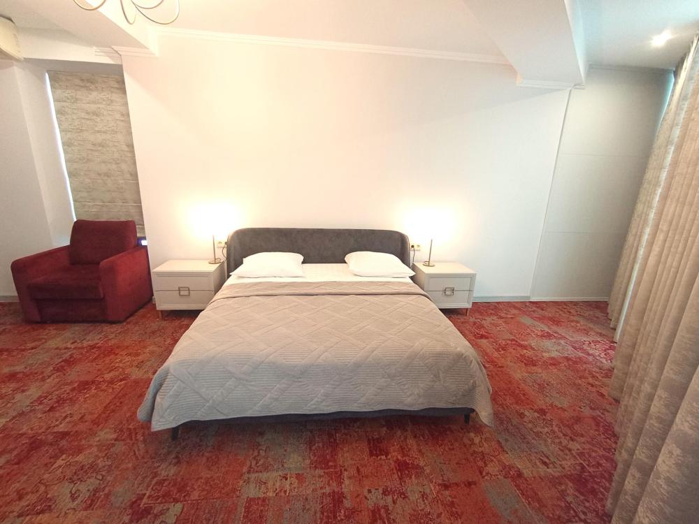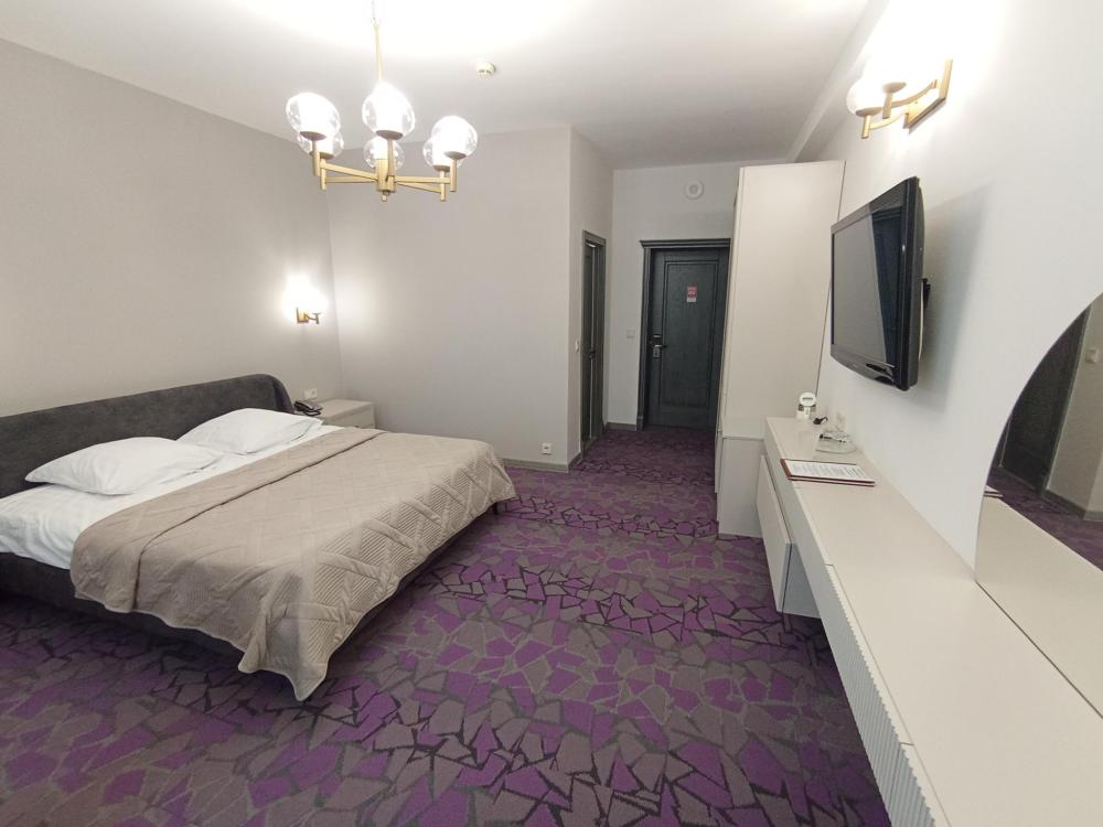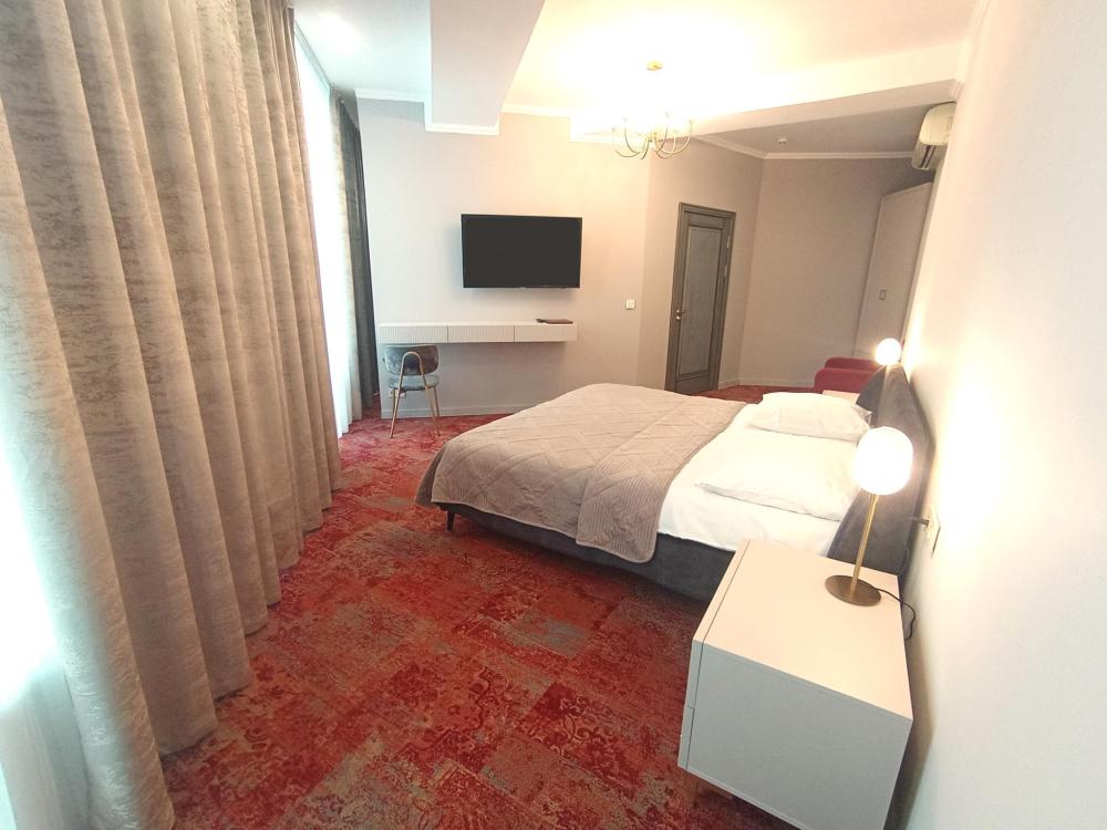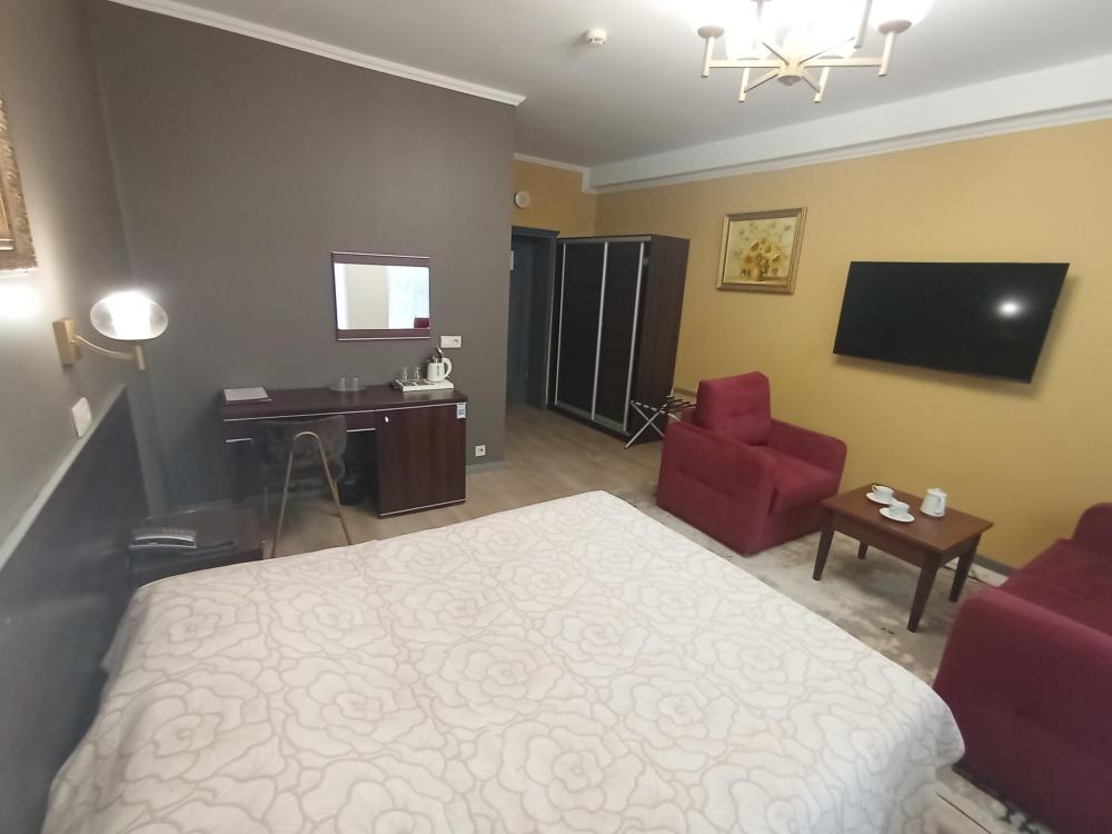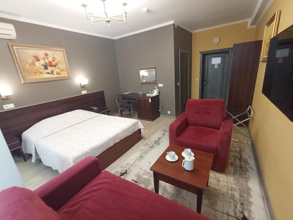 площадь(25 м2) - большая двуспальная кровать «King Size» (180*200 см), телевизор LCD, телефон, мини-бар, сейф, кондиционер с индивидуальным контролем температурного режима, душевая кабина, фен, три полотенца, тапочки, халат, набор косметических аксессуаров (мыло, гель, шампунь), бесплатный беспроводной доступ в Интернет.