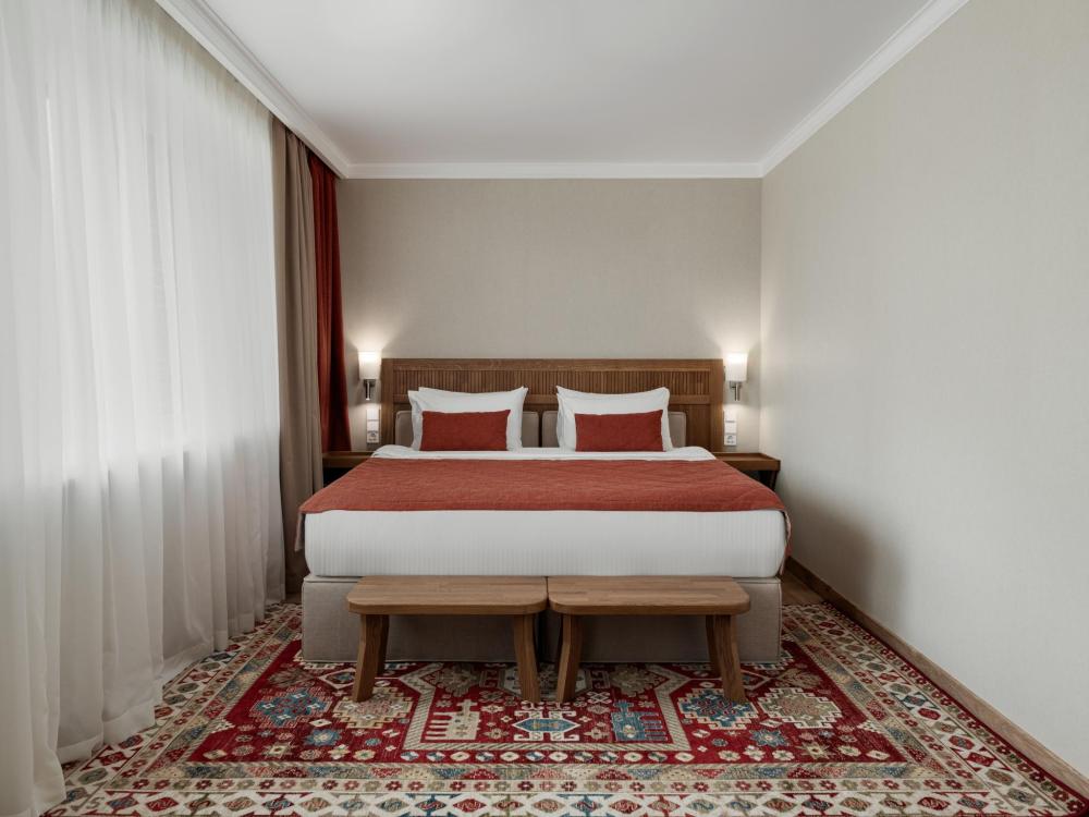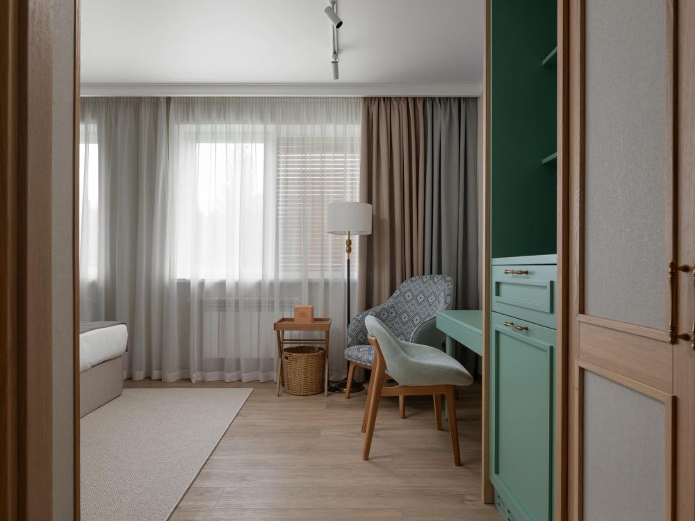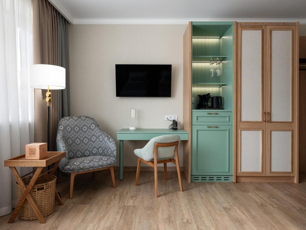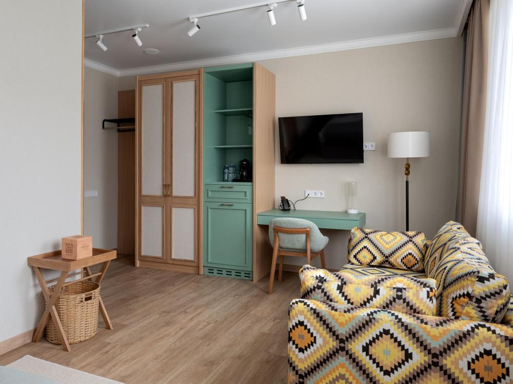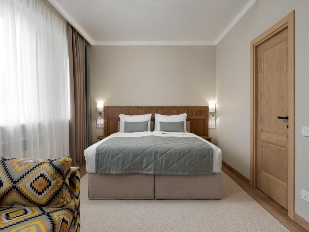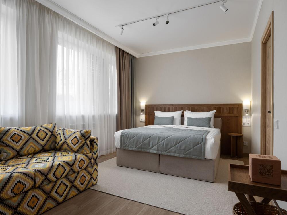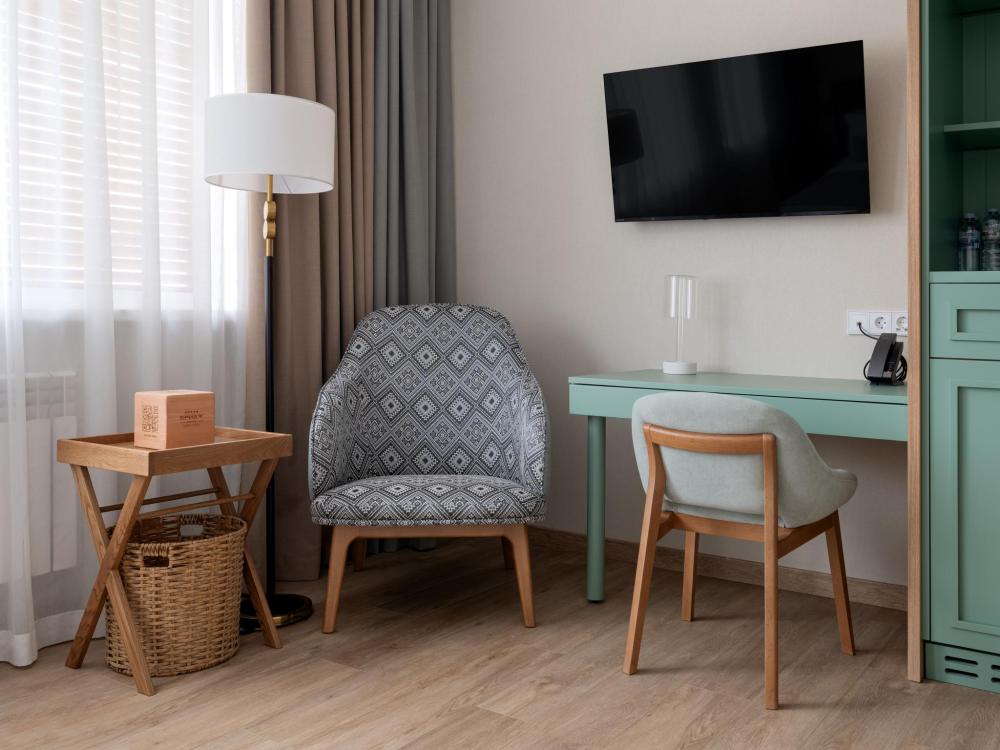 Интерьер номера сочетает атмосферу домашнего уюта с функциональностью и комфортом премиального уровня. Пространство зонировано на отдельную спальню и уютную гостиную. Оформление выполнено в современном стиле с использованием натуральных материалов. В распоряжении гостей — кровати на выбор с анатомическими матрасами, а также меню подушек для индивидуального комфорта. Рабочая зона с письменным столом и удобным креслом позволяет с комфортом поработать или провести вечер за книгой. Для приятного начала дня или уютного вечера предусмотрено всё необходимое для приготовления чая и кофе.