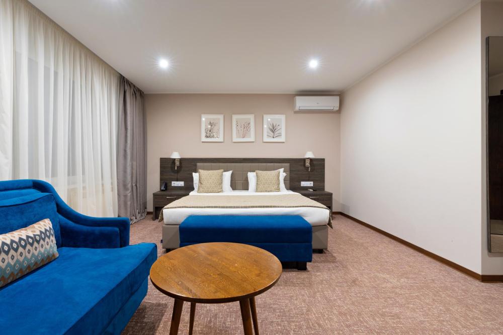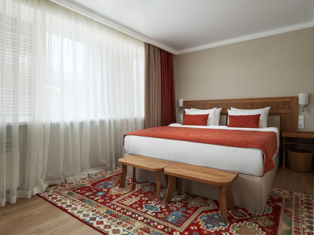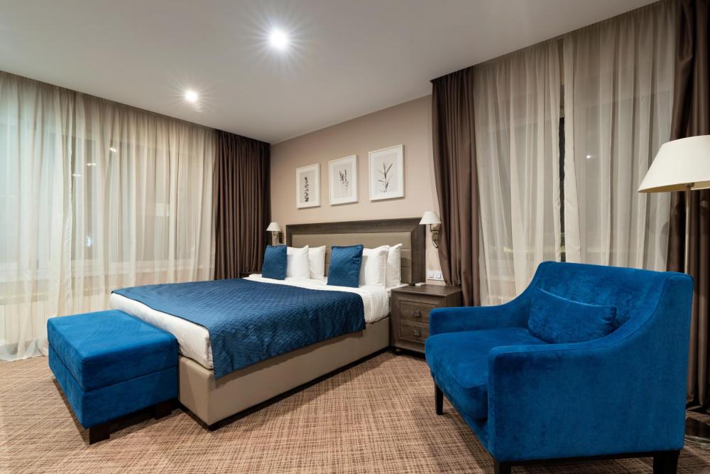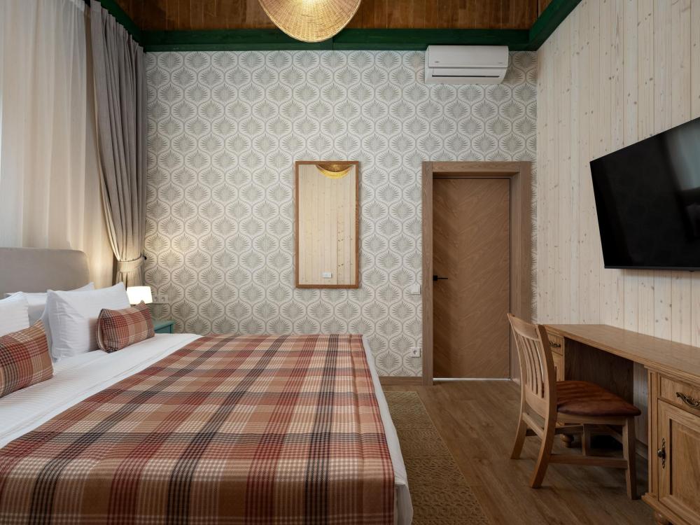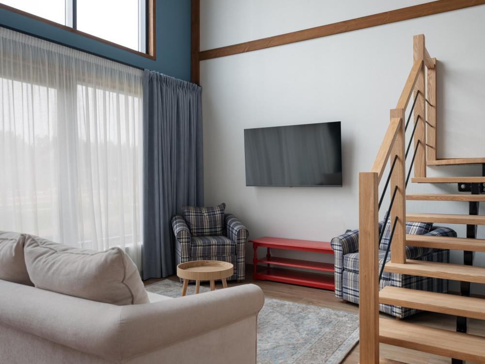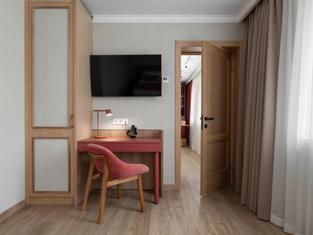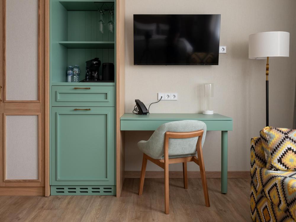 Интерьер номера сочетает атмосферу домашнего уюта с функциональностью и комфортом премиального уровня. Пространство зонировано на отдельную спальню и уютную гостиную. Оформление выполнено в современном стиле с использованием натуральных материалов. В распоряжении гостей — кровати на выбор с анатомическими матрасами, а также меню подушек для индивидуального комфорта. Рабочая зона с письменным столом и удобным креслом позволяет с комфортом поработать или провести вечер за книгой. Для приятного начала дня или уютного вечера предусмотрено всё необходимое для приготовления чая и кофе.