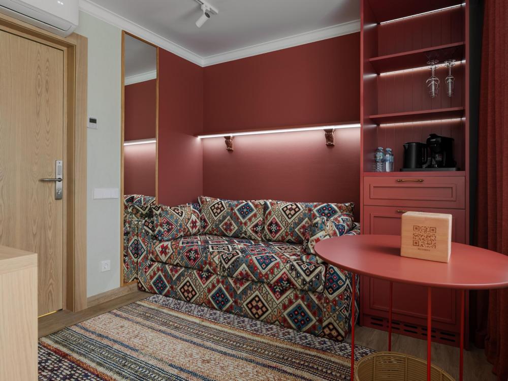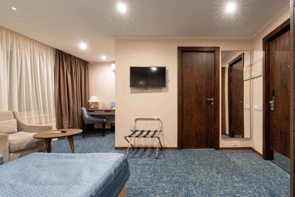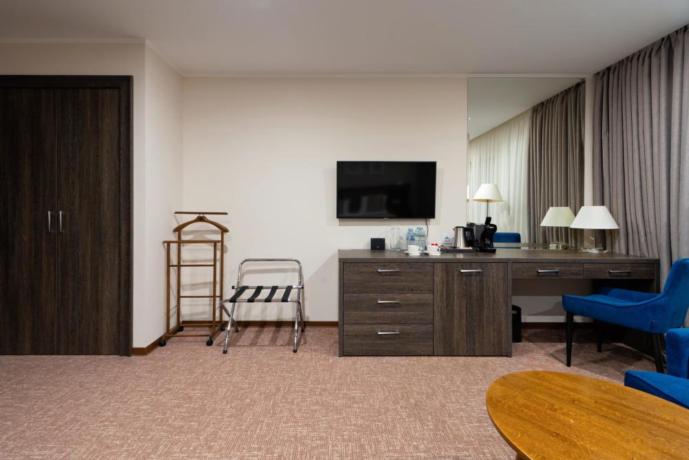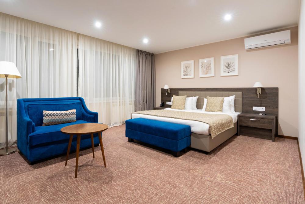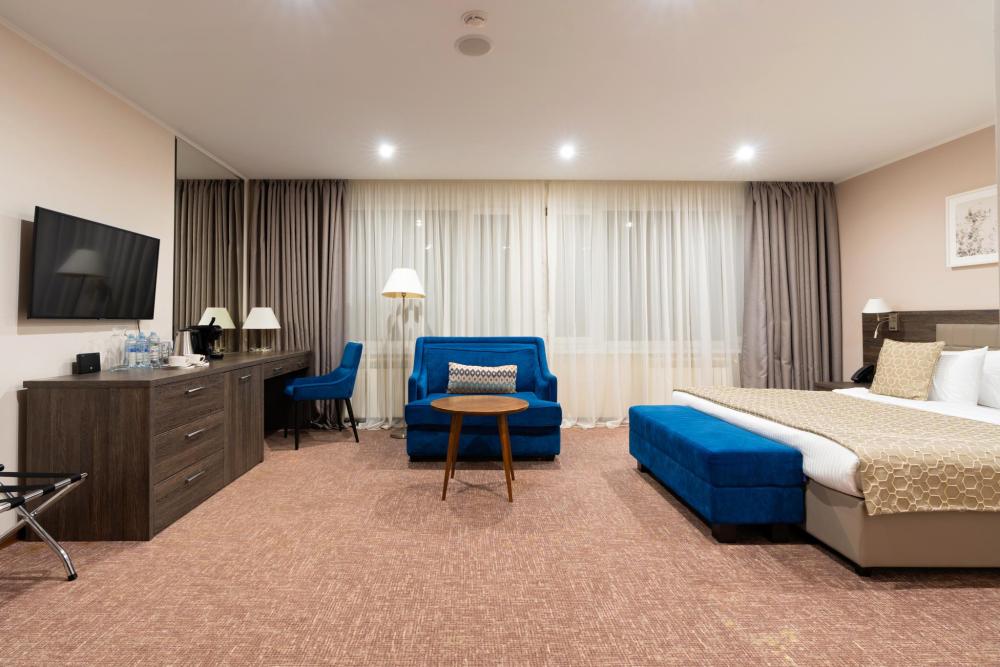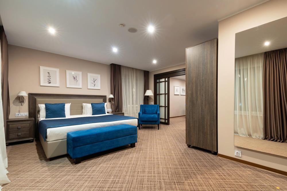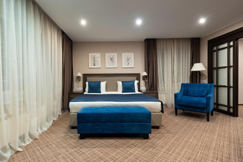 Интерьер номера сочетает атмосферу домашнего уюта с функциональностью и комфортом премиального уровня. Пространство зонировано на отдельную спальню и уютную гостиную. Оформление выполнено в современном стиле с использованием натуральных материалов. В распоряжении гостей — кровати на выбор с анатомическими матрасами, а также меню подушек для индивидуального комфорта. Рабочая зона с письменным столом и удобным креслом позволяет с комфортом поработать или провести вечер за книгой. Для приятного начала дня или уютного вечера предусмотрено всё необходимое для приготовления чая и кофе.