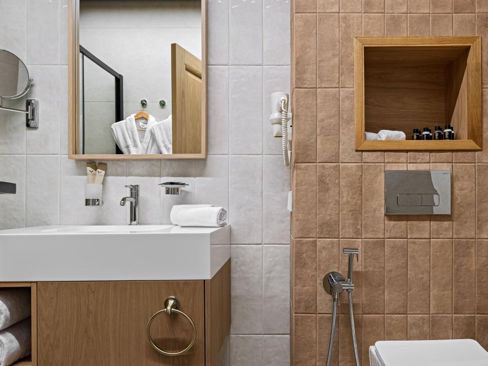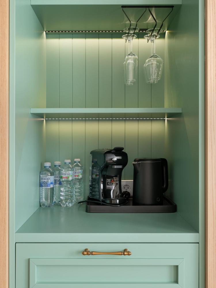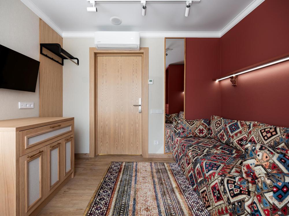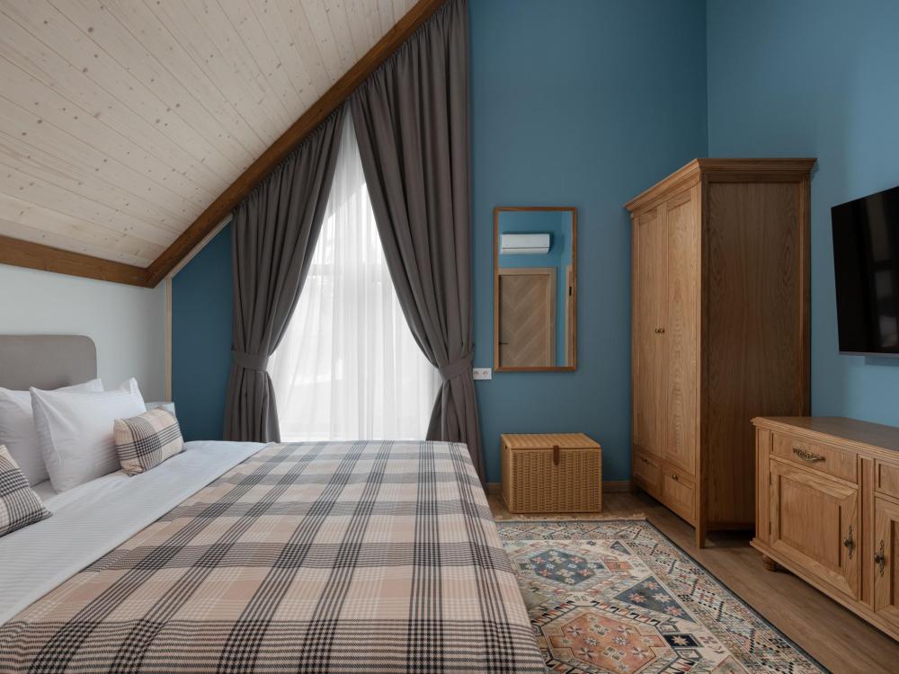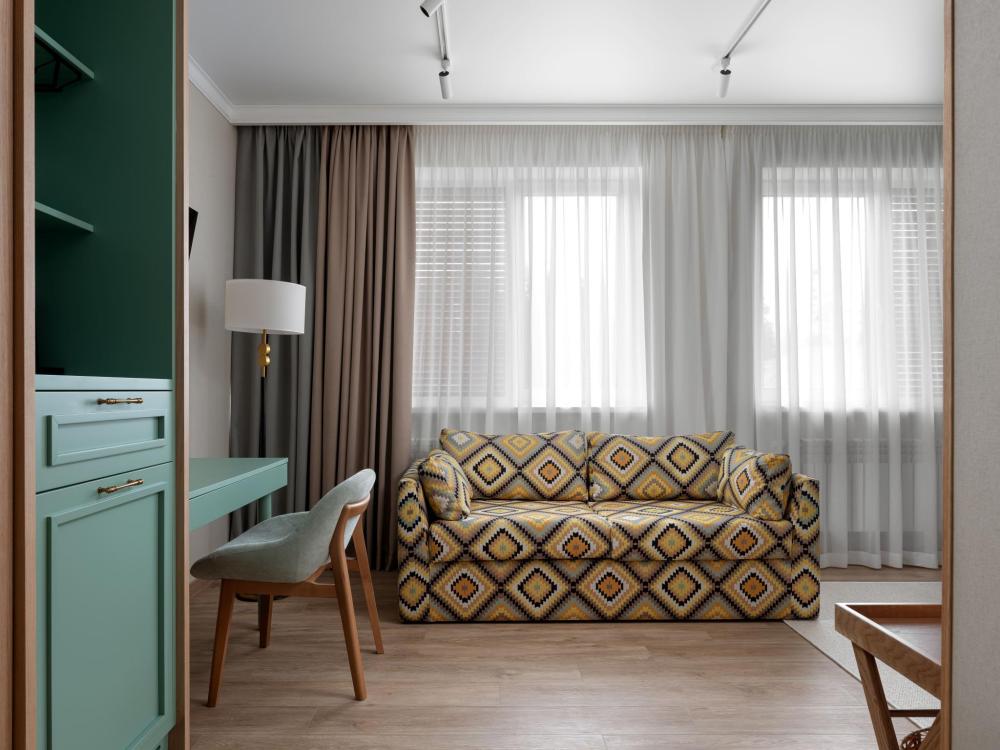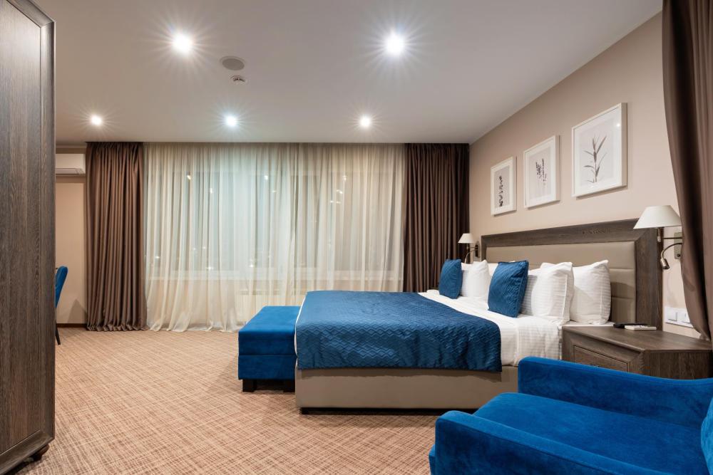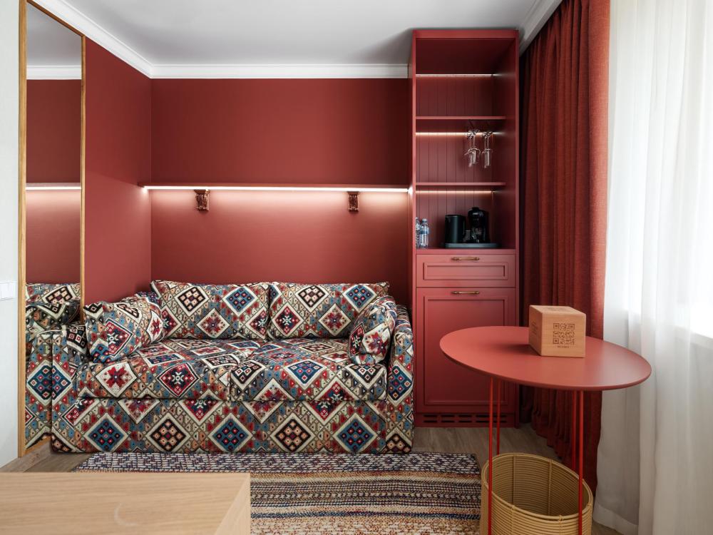 Интерьер номера сочетает атмосферу домашнего уюта с функциональностью и комфортом премиального уровня. Пространство зонировано на отдельную спальню и уютную гостиную. Оформление выполнено в современном стиле с использованием натуральных материалов. В распоряжении гостей — кровати на выбор с анатомическими матрасами, а также меню подушек для индивидуального комфорта. Рабочая зона с письменным столом и удобным креслом позволяет с комфортом поработать или провести вечер за книгой. Для приятного начала дня или уютного вечера предусмотрено всё необходимое для приготовления чая и кофе.
