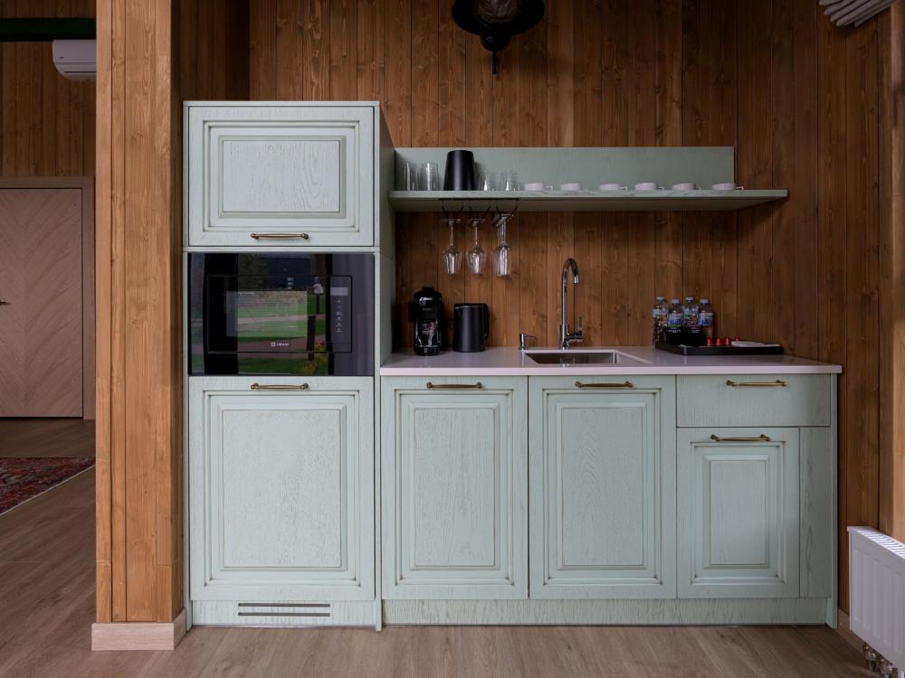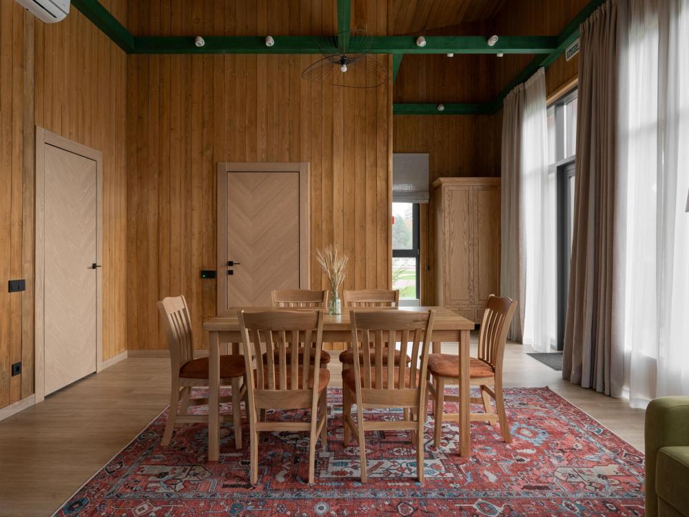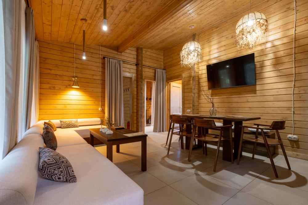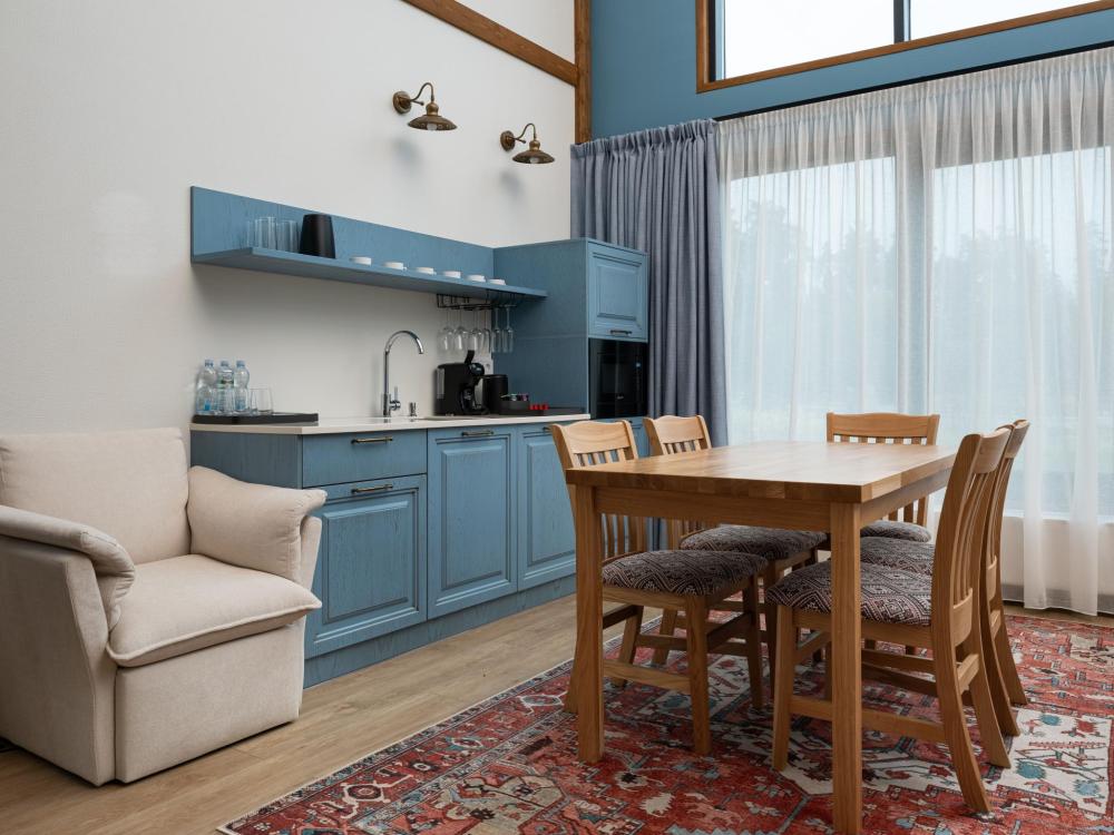 Просторный одноэтажный дом с двумя спальнями, каждая из которых оформлена в индивидуальном стиле. В центре дома — уютная гостиная с панорамными окнами, наполняющими пространство естественным светом и открывающими живописный вид на окружающий ландшафт. Атмосферу тепла и уюта дополняет современный биокамин: живое пламя без лишних хлопот становится стильным и функциональным элементом интерьера. Гостиная словно приглашает собраться всей семьёй за большим обеденным столом — в окружении света, тепла и спокойствия. В распоряжении гостей — кровати на выбор с анатомическими матрасами, а также меню подушек для индивидуального комфорта. Для приятного начала дня или уютного вечера в номере есть всё необходимое для приготовления чая и кофе.
