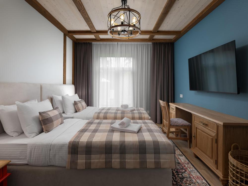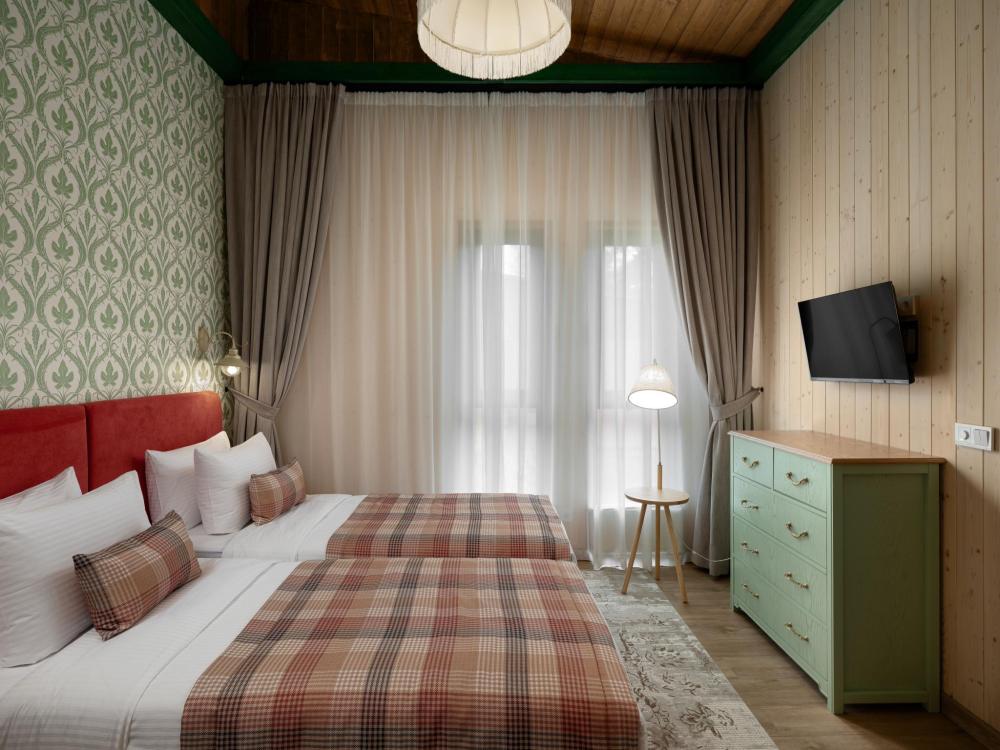 Просторный и элегантный номер, созданный для комфортного отдыха в окружении природы. Большие окна наполняют пространство естественным светом и открывают живописный вид на лесной массив или озеро — в зависимости от расположения корпуса. Большие окна наполняют пространство естественным светом и открывают живописный вид на лесной массив или озеро — в зависимости от расположения корпуса. Атмосфера умиротворения и близости к природе делает возвращение в номер особенно приятным после прогулок и активного дня. Номер идеально подойдёт для семей с детьми. В распоряжении гостей — кровати на выбор с анатомическими матрасами, а также меню подушек для индивидуального комфорта. Для приятного начала дня или уютного вечера в номере есть всё необходимое для приготовления чая и кофе.