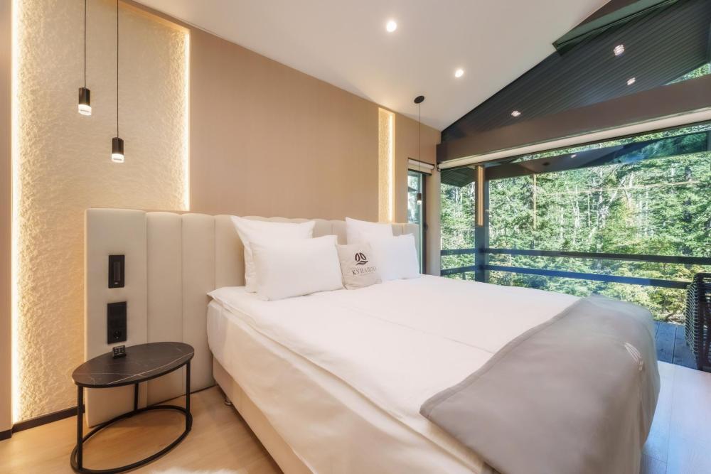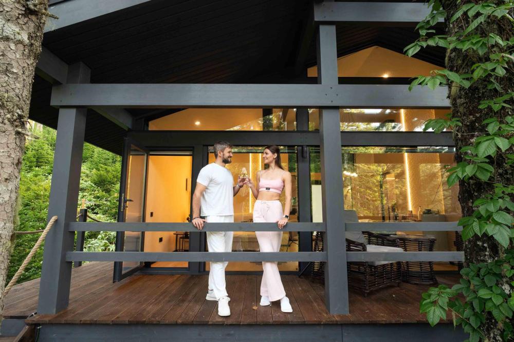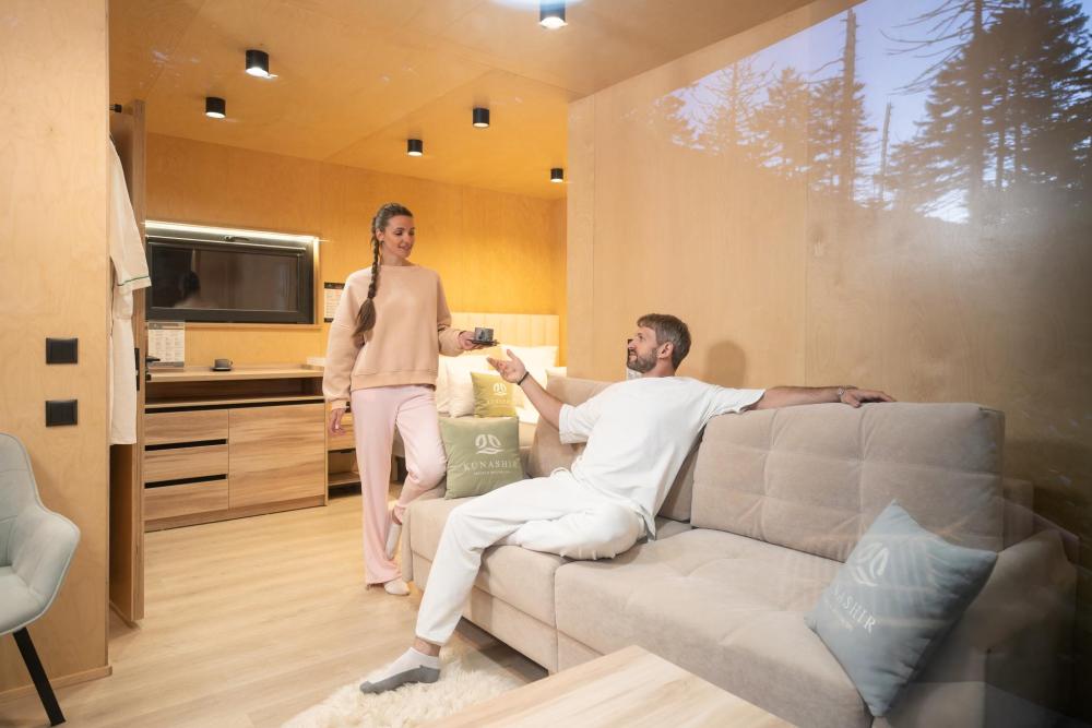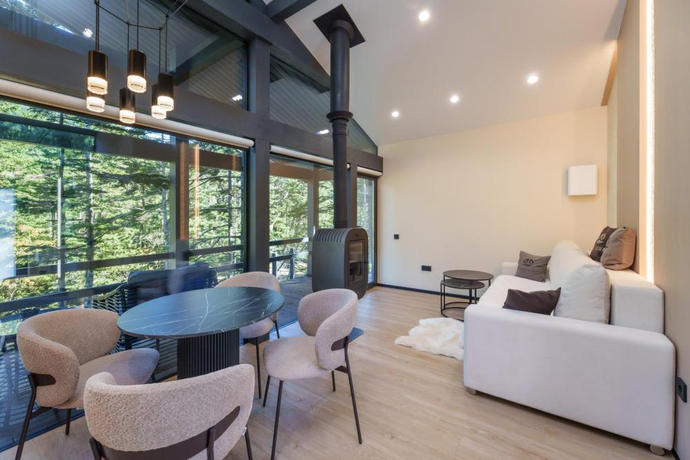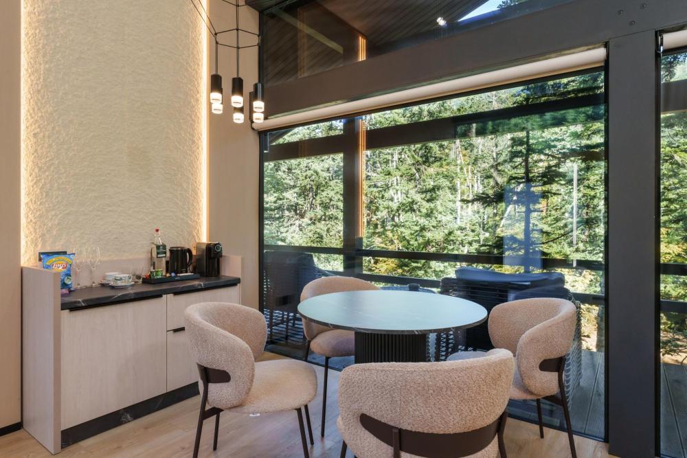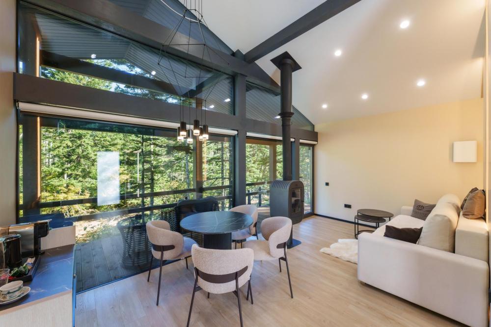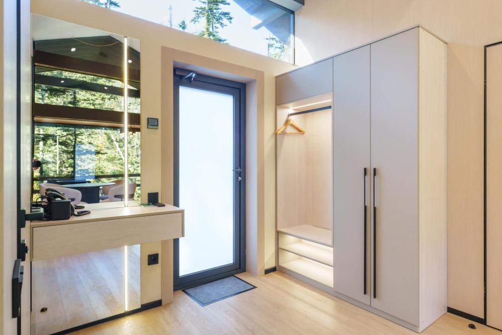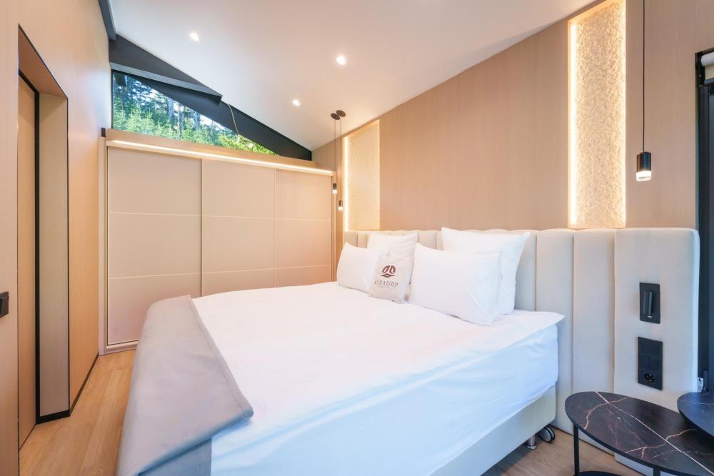 Уютный дом с эргономичным и стильным дизайном для комфортного уединенного отдыха, проживания двух друзей или любящей пары. • Комфортная двуспальная кровать или две односпальные кровати • Зона отдыха со столиком и креслами • Панорамные окна с видом на лес • Теплый пол • Осушитель воздуха • Ванная комната с душем • Косметические принадлежности • Тапочки • Чайный набор • Кондиционер • Мини-холодильник • Просторная меблированная терраса