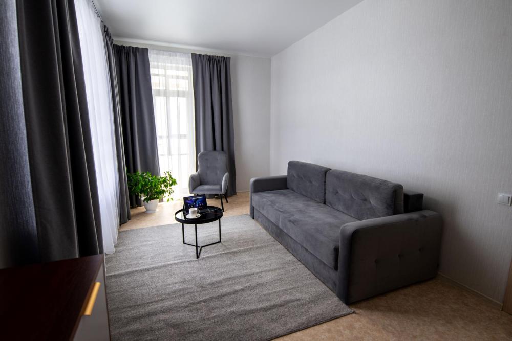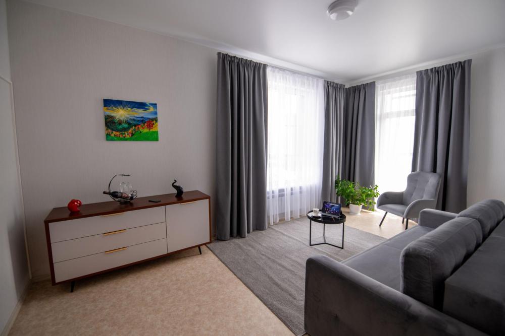 Удобные современные апартаменты, имеется все необходимое для комфортного проживания. Кухня с мини-баром, чайником и микроволновой печью. В спальне удобные односпальные кровати, стол, шкаф для хранения вещей, зеркало в прихожей, ванная комната со всем необходимым. В гостиной раскладной диван, который может быть использован как дополнительное спальное место для двоих гостей.