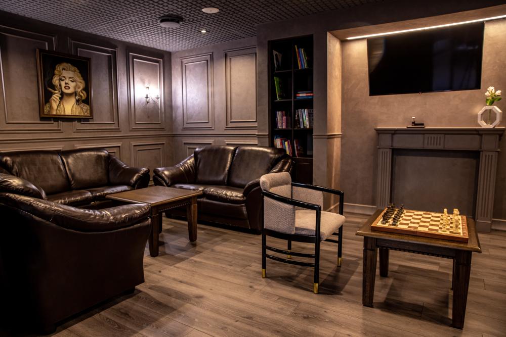 Двухкомнатный номер с гостиной, спальной и двумя ванными комнатами. Удобен для деловых людей, т.к. может быть переоборудован в два отдельных номера со смежной дверью. Гостиная, мини-кухня, 2 балкона,, двуспальная кровать (производство Япония), комфортабельный диван, 4 пуховые подушки (производство Финляндия), антибактериальное одеяло, льняное белье, мебель из натурального дерева.
