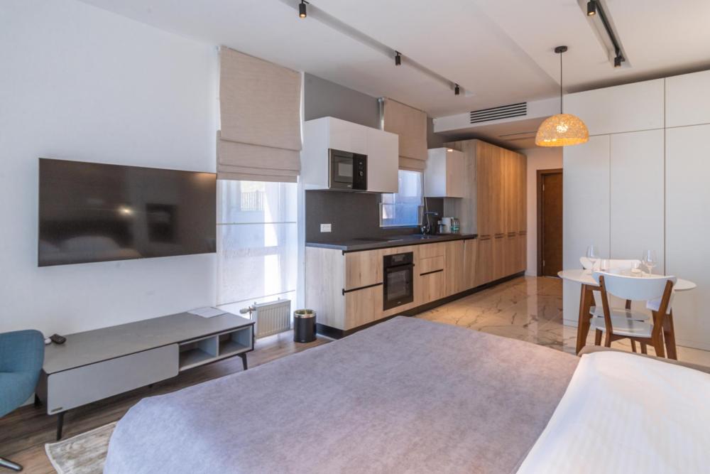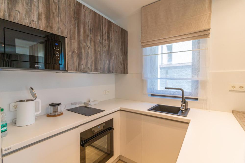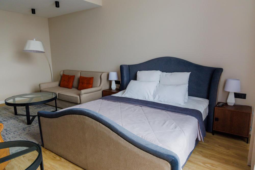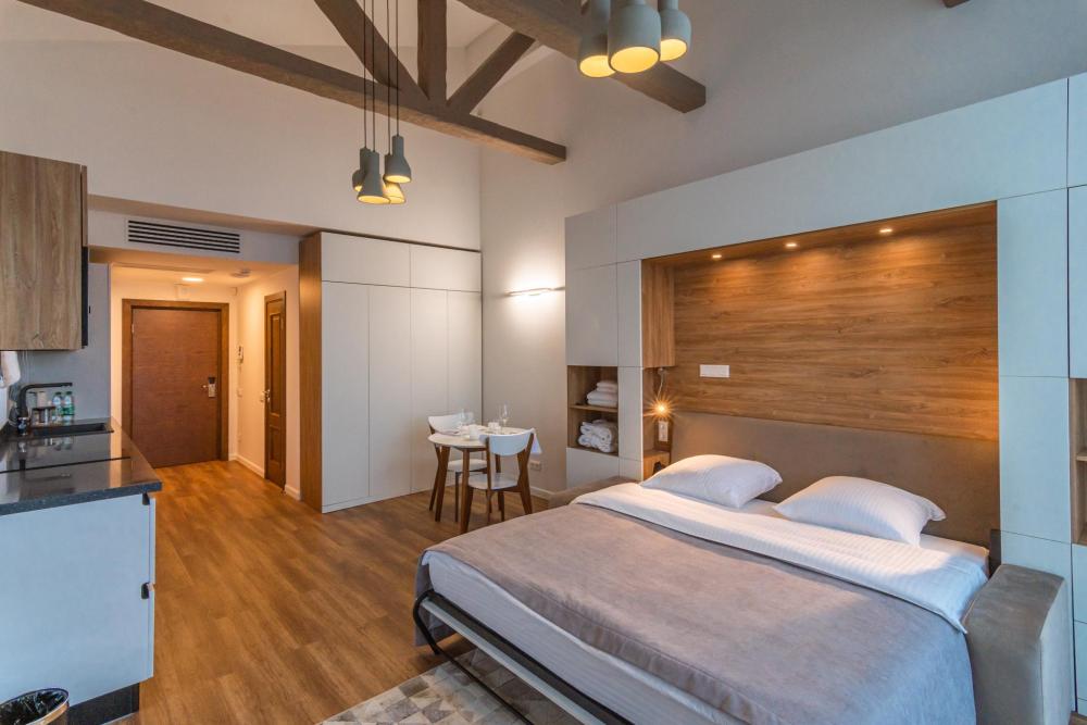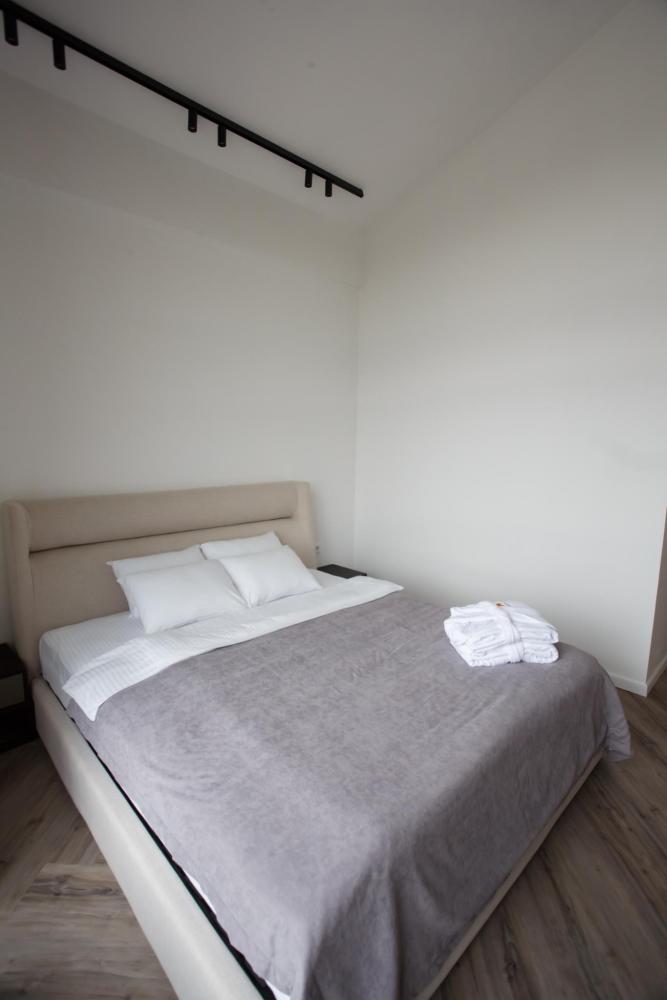 В номере встроенная двуспальная кровать Queen Size, гостиная, кухня, ванная комната, система климат контроля, система очищения воздуха Tion, кабельное ТВ. Проживание в стильном современном интерьере и полностью оборудованным для комфортабельного проживания сделает пребывание нашего гостя незабываемым.