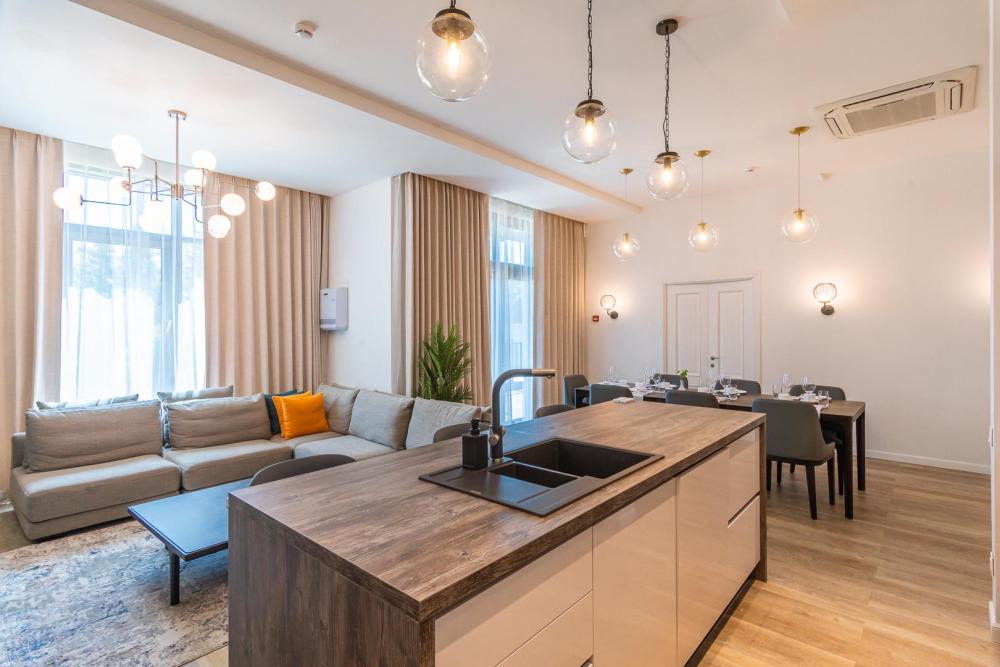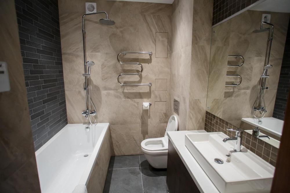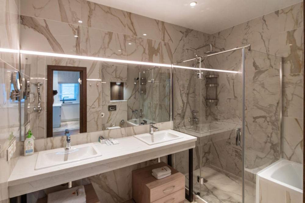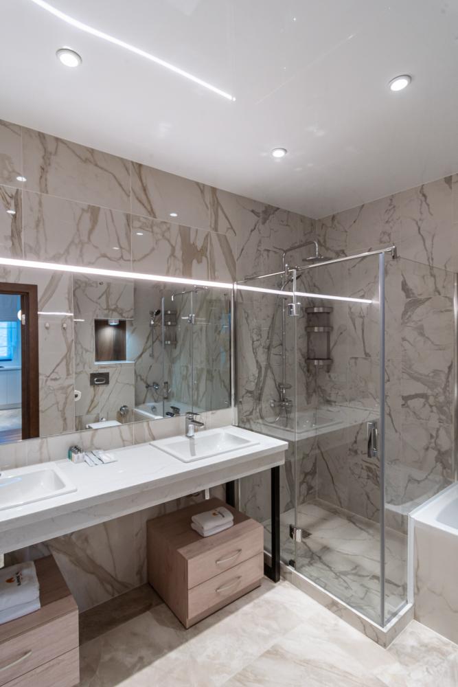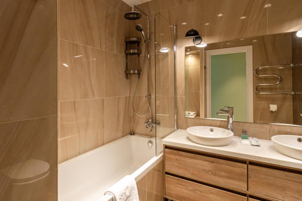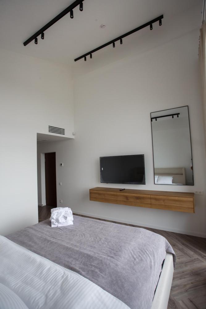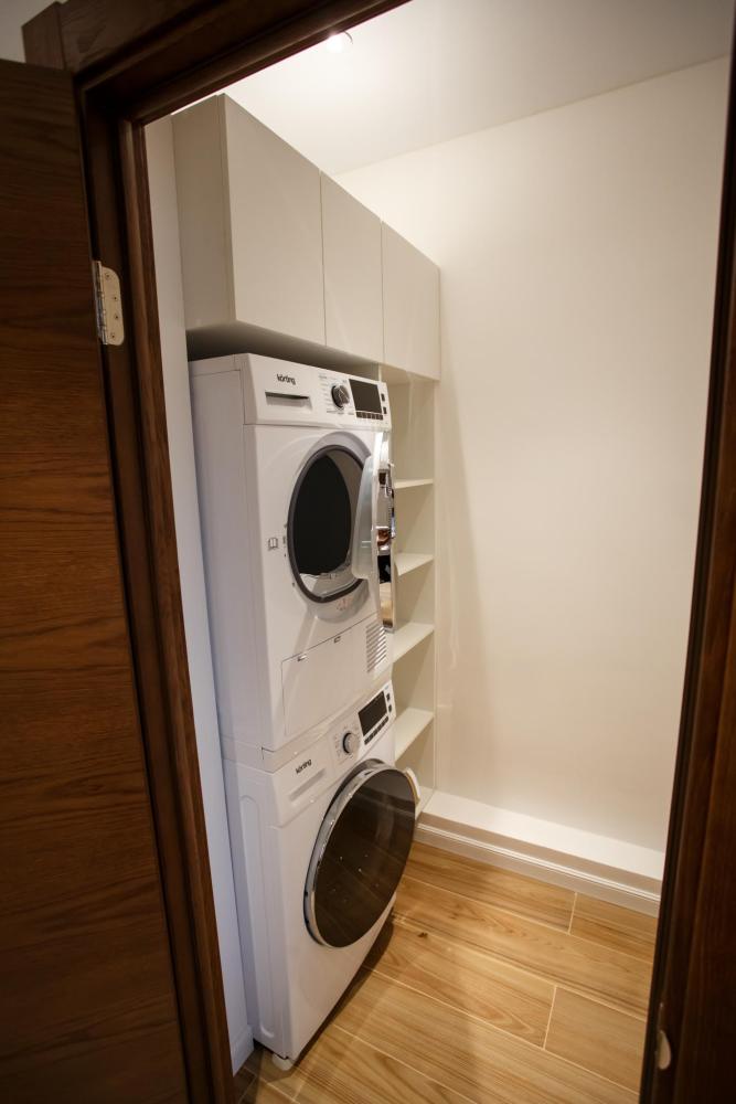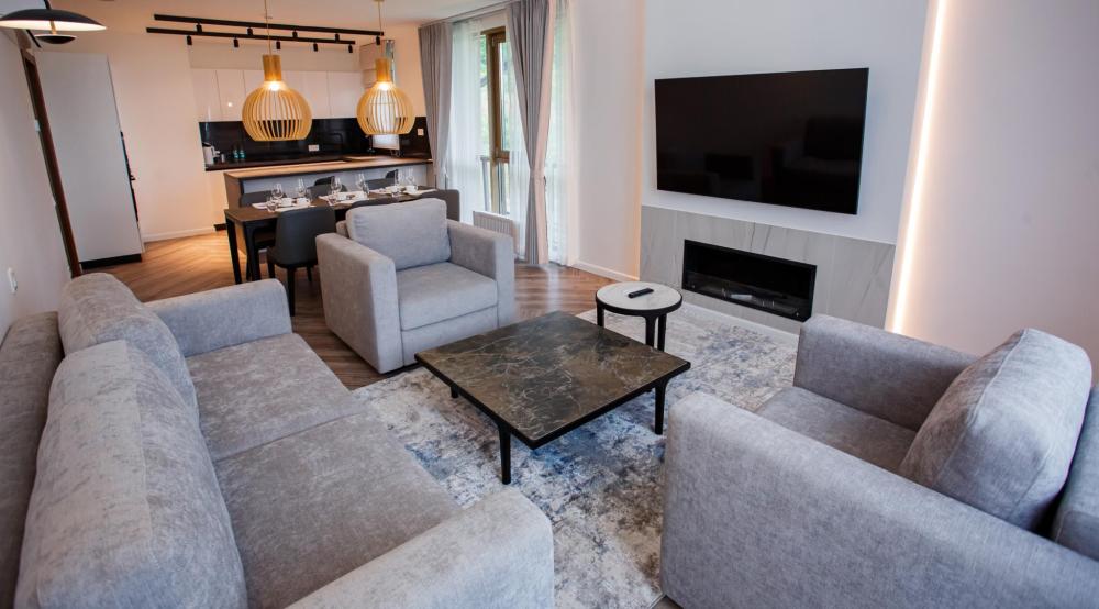 Комплектация апартаментов: климат-контроль, система очищения воздуха, три телевизора, холодильник с морозильной камерой, варочная панель, микроволновая печь, духовой шкаф, посудомоечная машина, машинка стиральная, машинка сушильная, душевая, ванна.