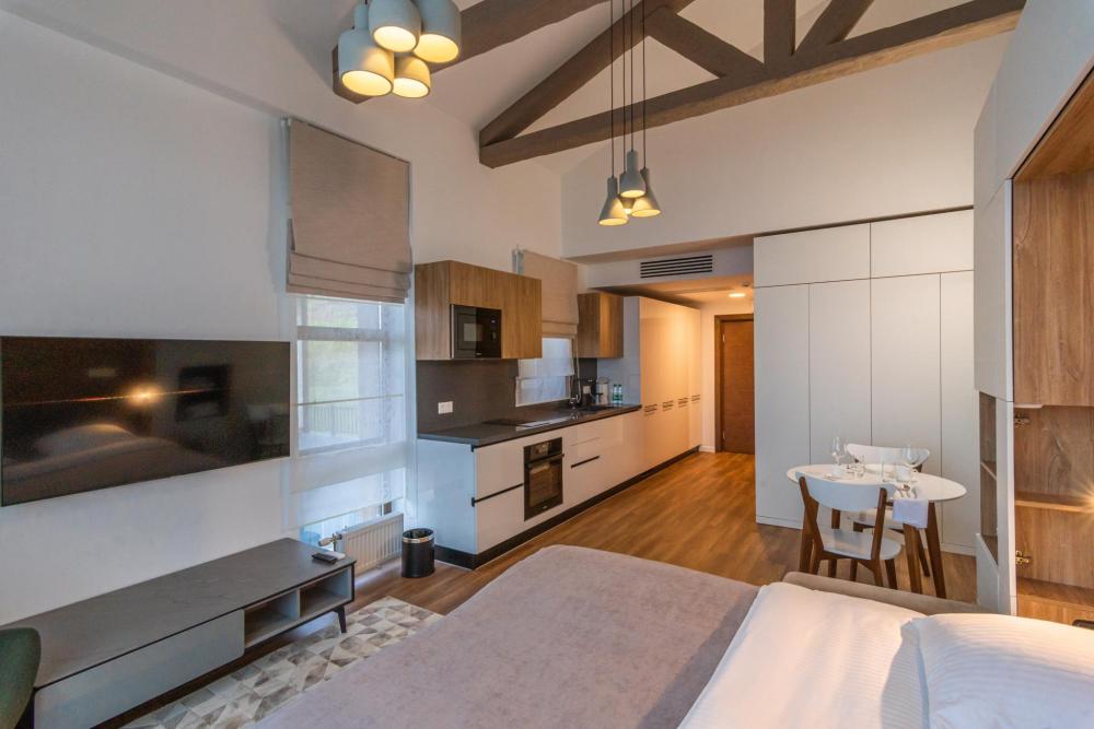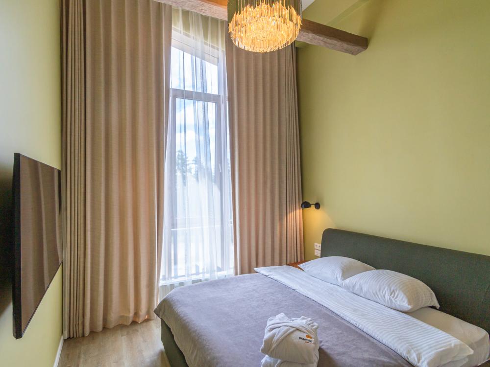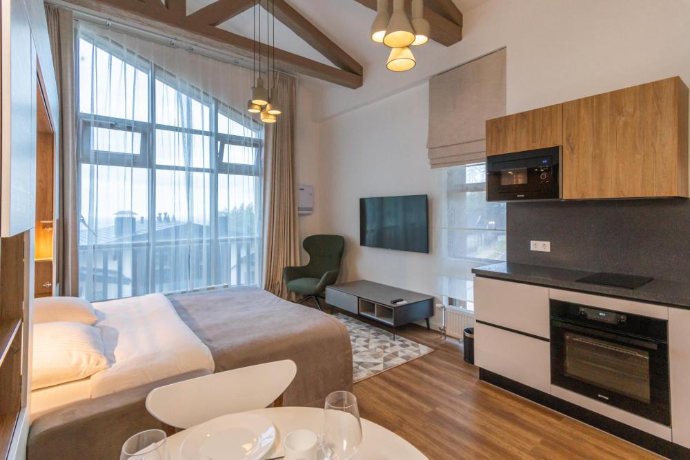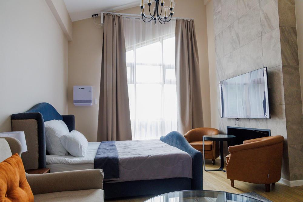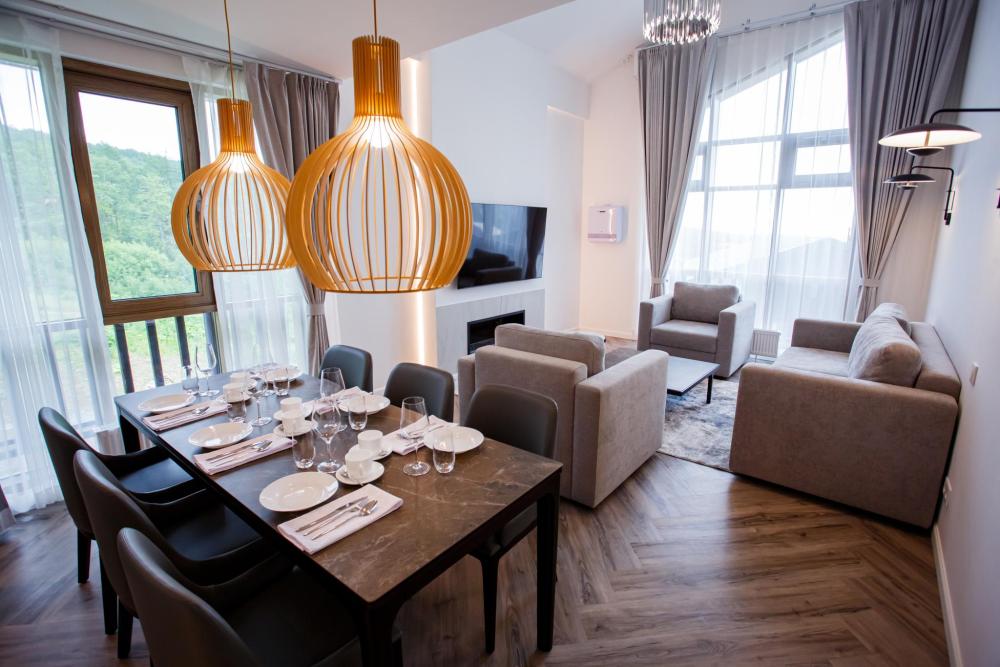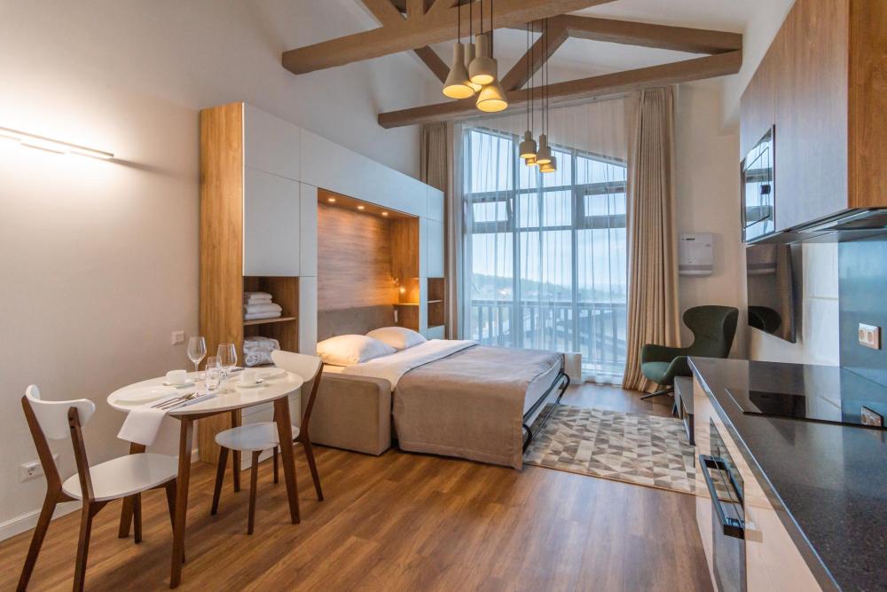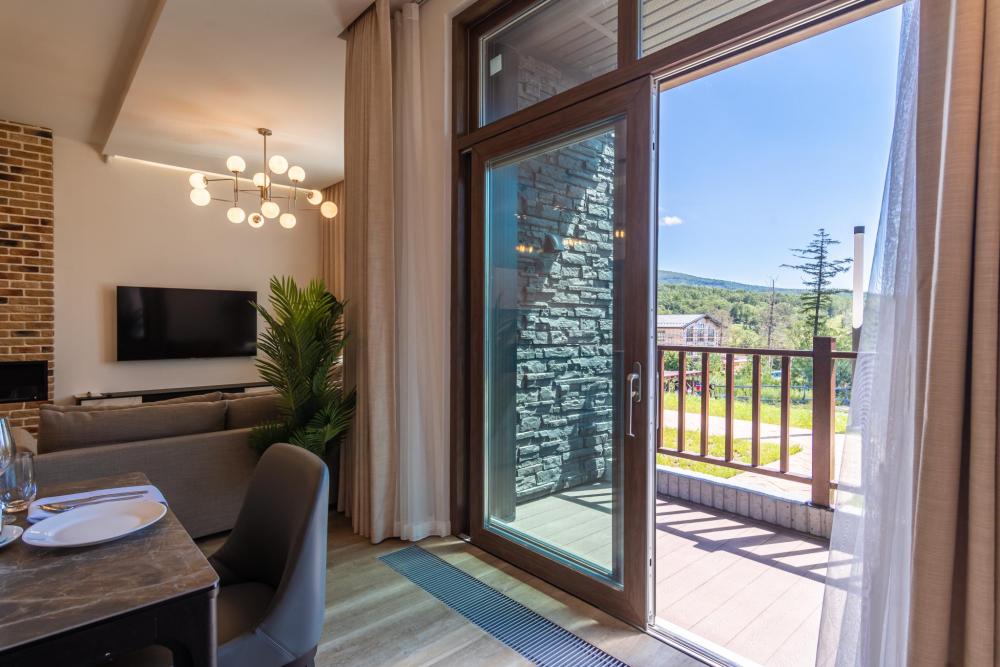 Апартаменты с прекрасным видом на сопки "Горного Воздуха". В номере две комнаты. В спальней комнате большая двуспальная кровать Queen Size, гардеробная. Гостиная с мягким диваном, оборудованной кухней, барной стойкой и обеденным столом на 4 персоны. Отдельная комната прачечной в которой расположены стиральная и сушильная машинки. Просторная ванная комната с банными и косметическими средствами. В номере система климат контроля, система очищения воздуха Tion, кабельное ТВ, WI-FI. Проживание в стильном современном интерьере и полностью оборудованным для комфортабельного проживания сделает пребывание нашего гостя незабываемым.