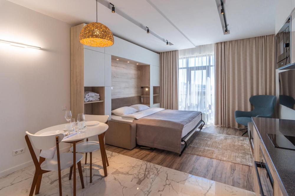 Апартаменты с одной спальней - просторные, солнечные номера с видом на сопки. Для комфортного проживания предоставляются: WI-FI, каб.ТВ, кондиционер, очиститель воздуха Tion, 2-х спальная кровать, диван, прихожая, гардеробная; ванная комната с ванной и душевой кабиной + банные принадлежности и косметические средства; отдельная прачечная :стиральная машинка, сушка; полностью оборудованная кухня: посуда, духовой шкаф, микроволновая печь, электрическая печь, холодильник, морозильная камера, посудомоечная машинка.