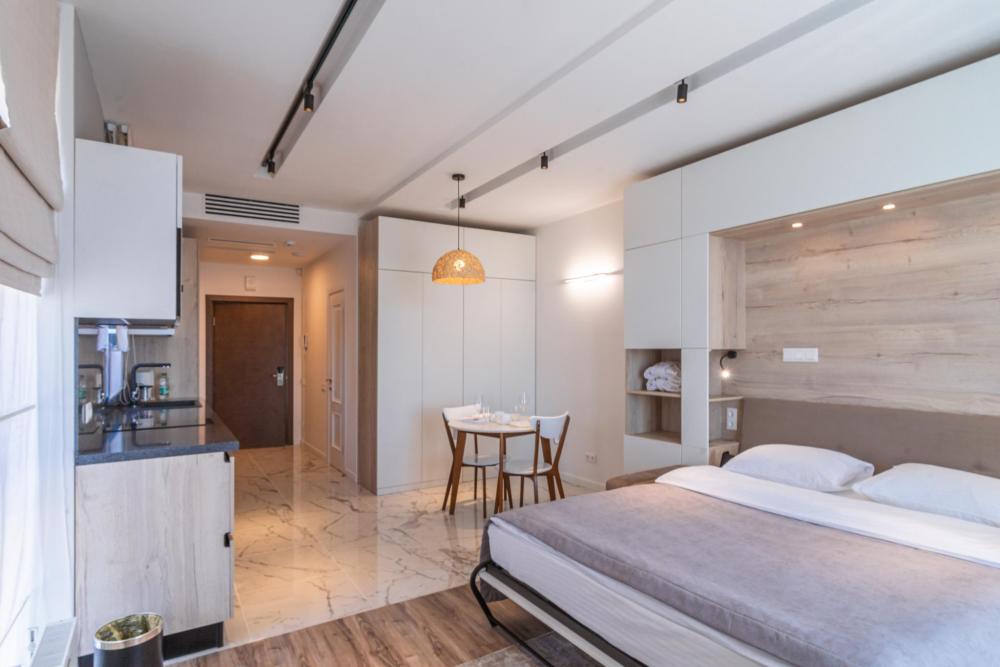 В номере две комнаты. В спальней комнате большая двуспальная кровать Queen Size, гардеробная. Гостиная с мягким диваном, оборудованной кухней, барной стойкой и обеденным столом на 4 персоны. Отдельная комната прачечной в которой расположены стиральная и сушильная машинки. Просторная ванная комната с банными и косметическими средствами. В номере система климат контроля, система очищения воздуха Tion, кабельное ТВ, WI-FI. Проживание в стильном современном интерьере и полностью оборудованным для комфортабельного проживания сделает пребывание нашего гостя незабываемым.