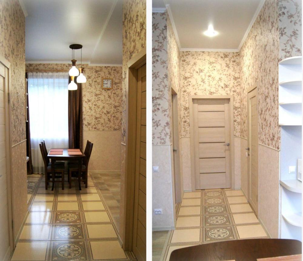 Планировка: гостиная совмещенная с кухней, где есть все для приготовления пищи, с большим двуспальным диваном , с обеденным большим столом со стульями и отдельно одна спальня с одной двуспальной кроватью, сан узел с душевой кабиной и просторный коридор.