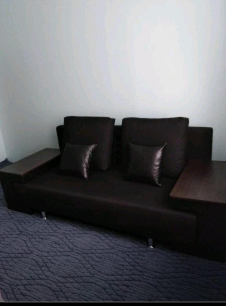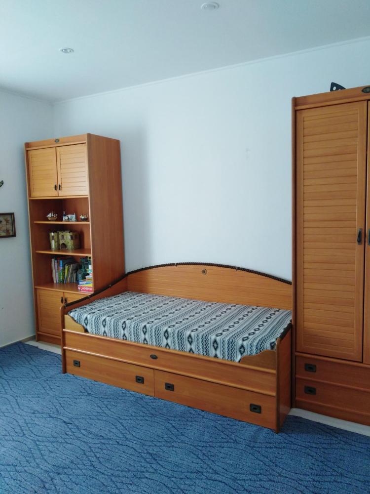 Планировка: кухня - гостиная с раскладывающимся диваном, спальня с раскладывающимся двухместным диваном и односпальной кроватью для ребенка, сан узел.