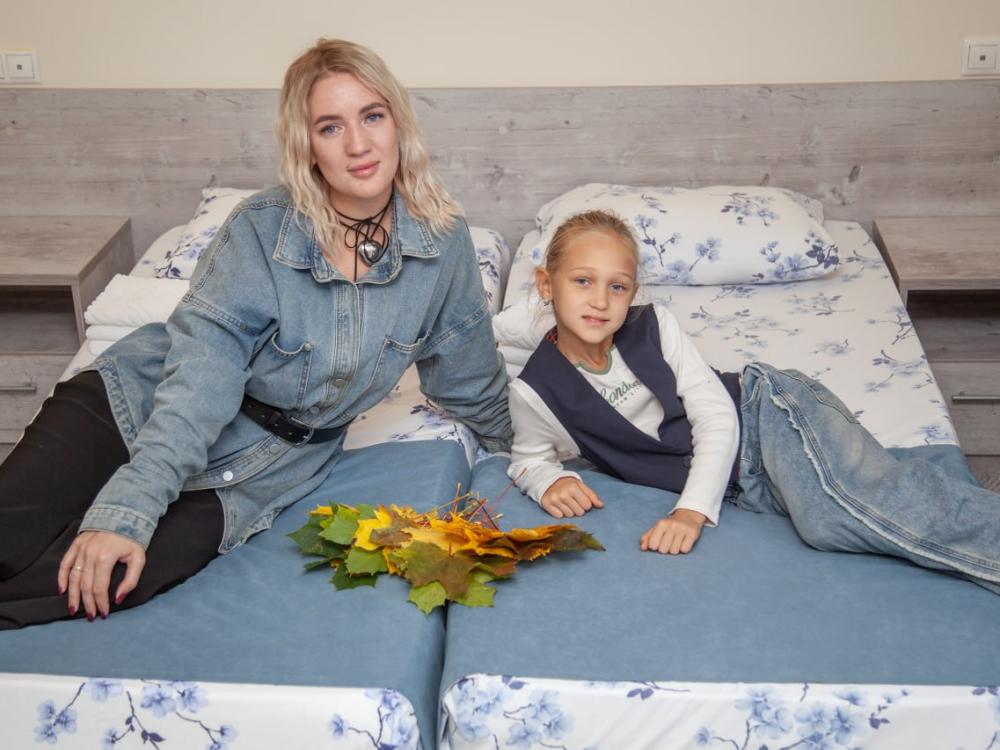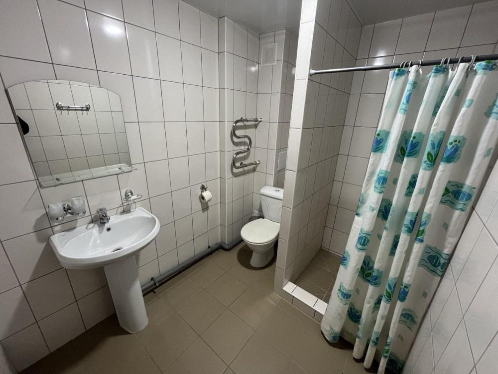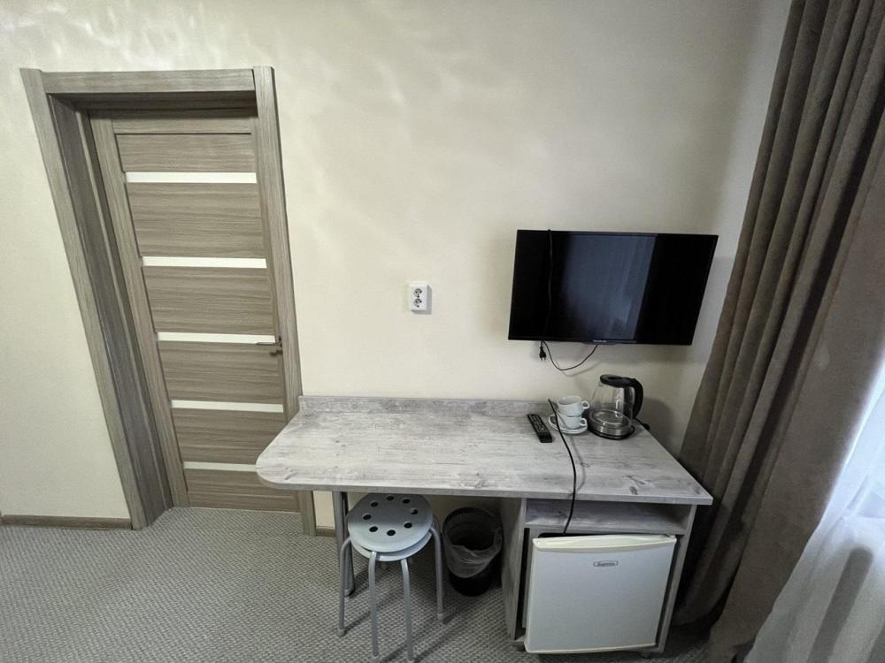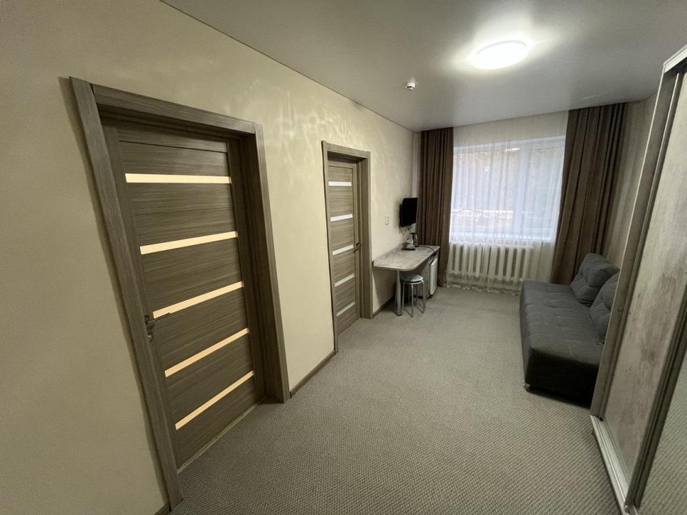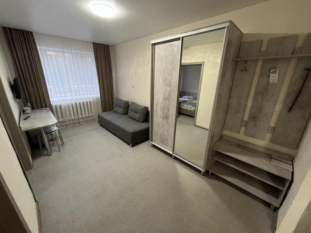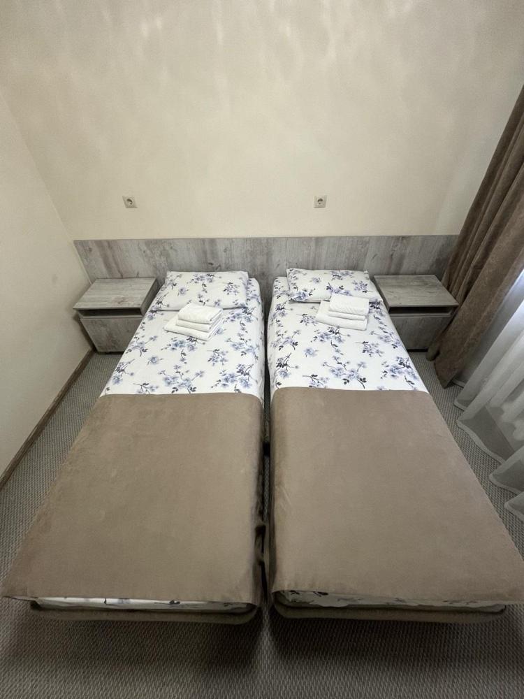 Аккуратный комфортный номер с двумя кроватями спринг-бокс 80х200 и всеми удобствами 27 кв.м. В номере: две кровати 80х200 1,5-спальные спринг-бокс с прикроватными тумбами диван шкаф – купе вешалка для верхней одежды с тумбой для обуви холодильник телевизор стол стул электрический чайник, чайные пары , чайные ложки плотные шторы для затемнения в номере wi-fi Санузел: душ, умывальник, фен, унитаз, зеркало, комплект полотенец, индивидуальные косметические наборы (мыло, шампунь, гель для душа выкладывается на заезд и по требованию).