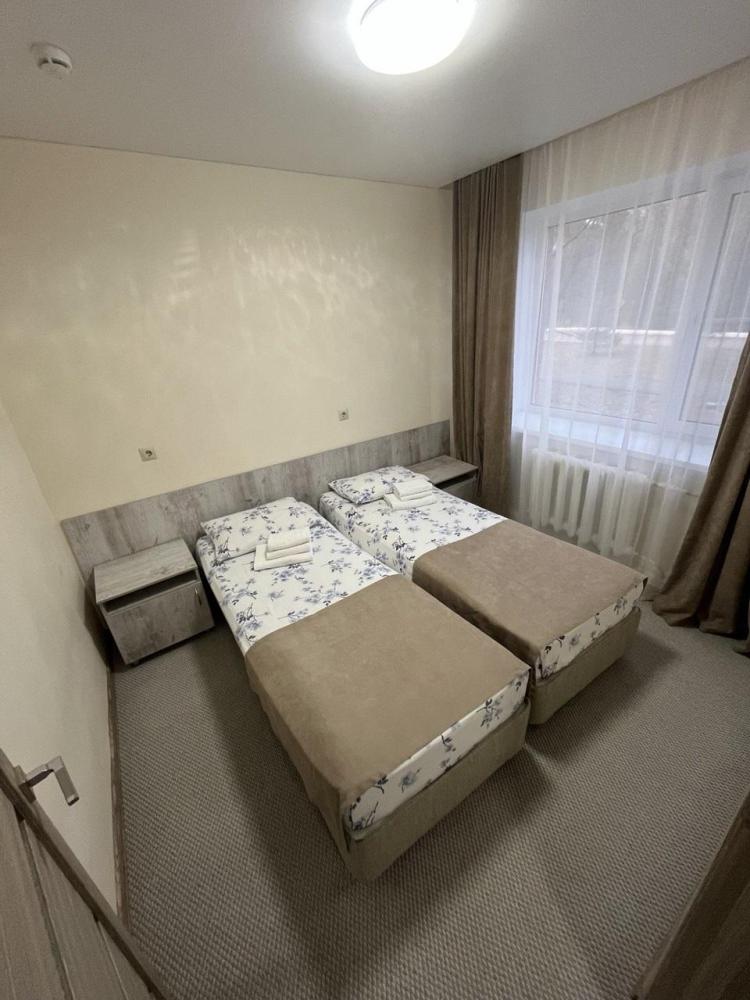 Комфортный номер с двумя односпальными кроватями 80х200 сприн-бокс и всеми удобствами. В номере: две кровати 80х200 1,5-спальные с прикроватными тумбами, шкаф – купе, вешалка для верхней одежды с полкой для обуви, мини-бар холодильник, телевизор, стол, 2 стула, электрический чайник, чайные пары , чайные ложки, плотные шторы для затемнения в номере, wi-fi Санузел: душ, умывальник, унитаз, зеркало, фен, комплект полотенец, индивидуальные косметические наборы (мыло, шампунь, гель для душа выкладывается на заезд и по требованию).